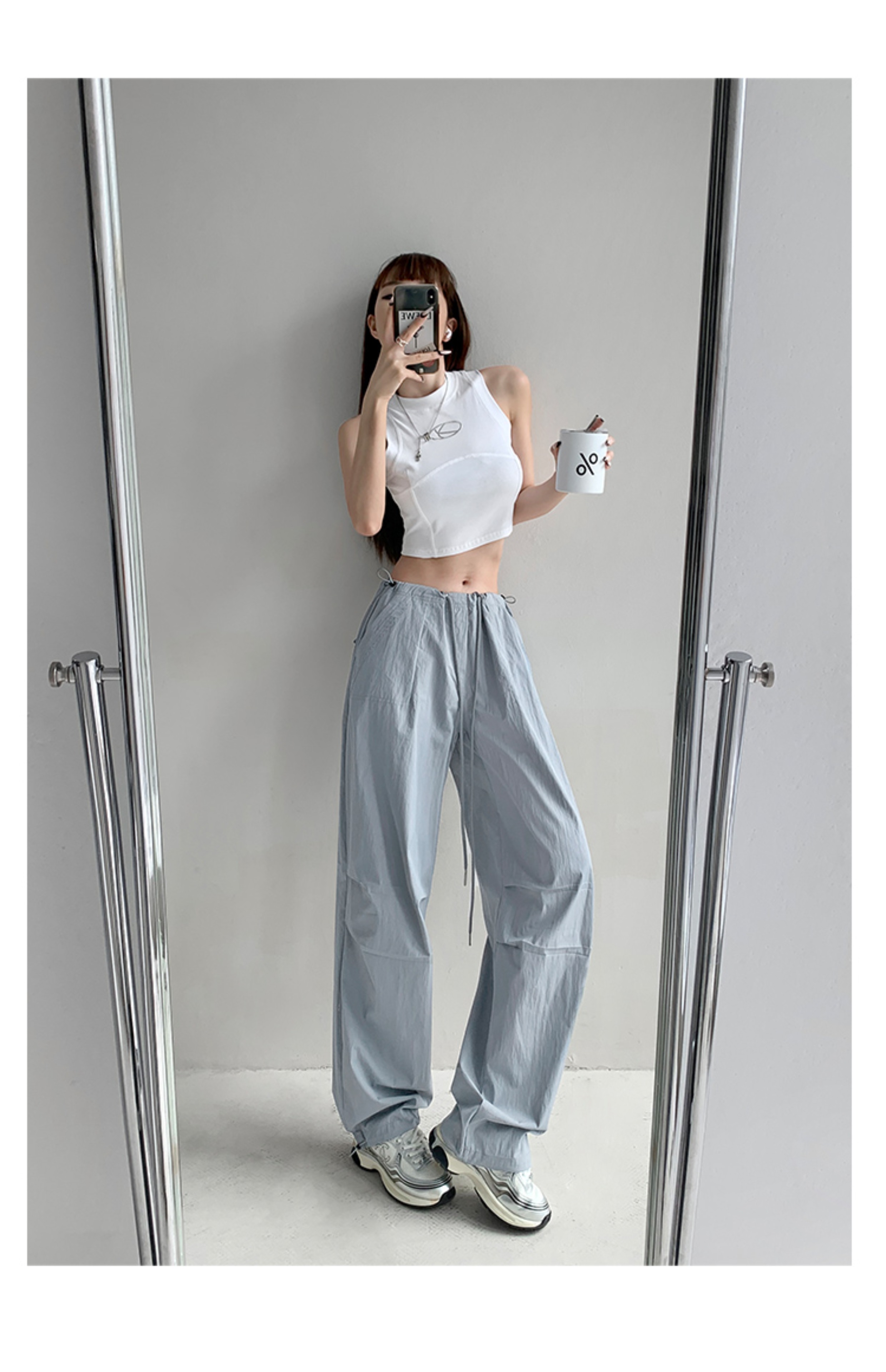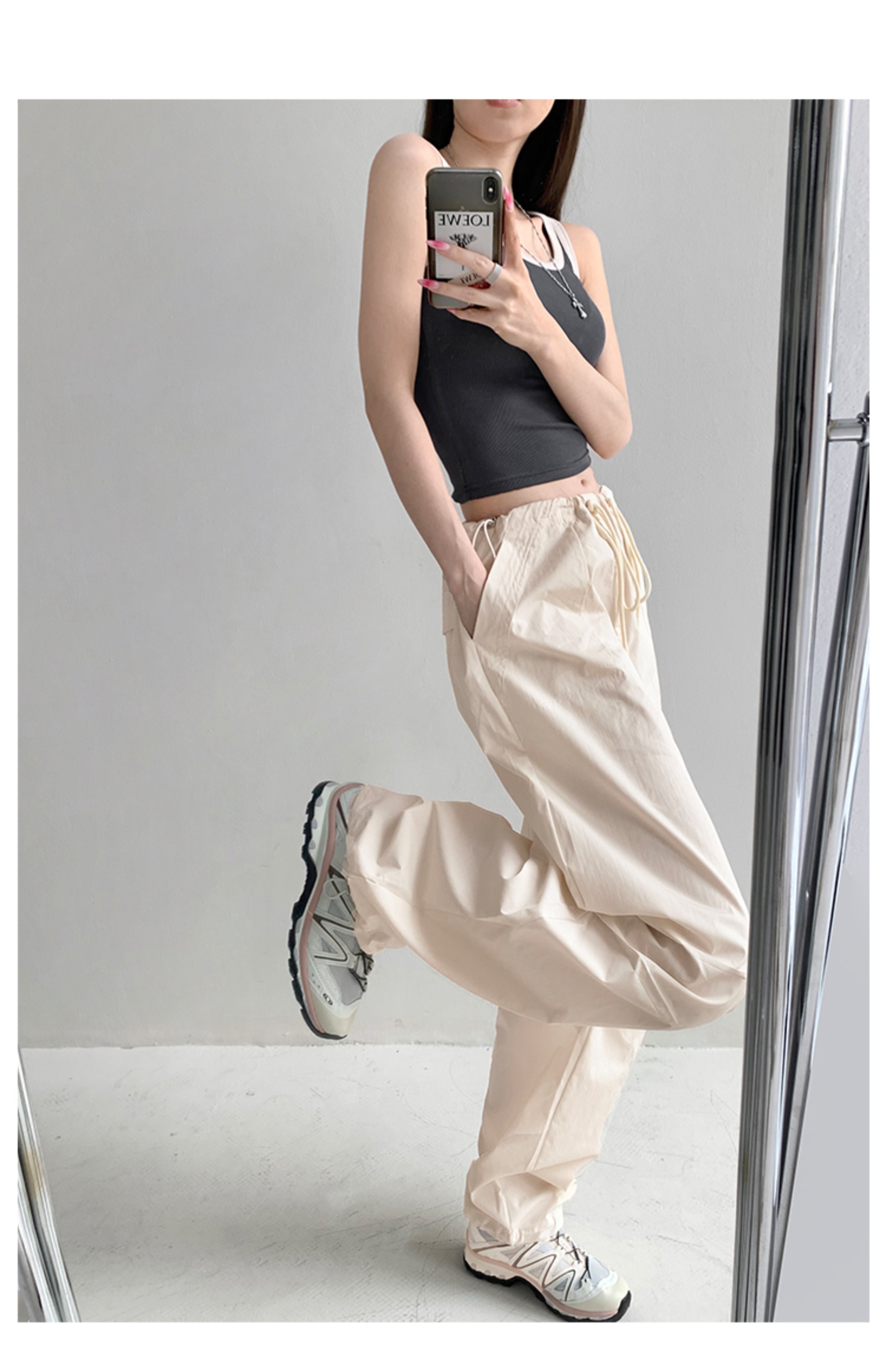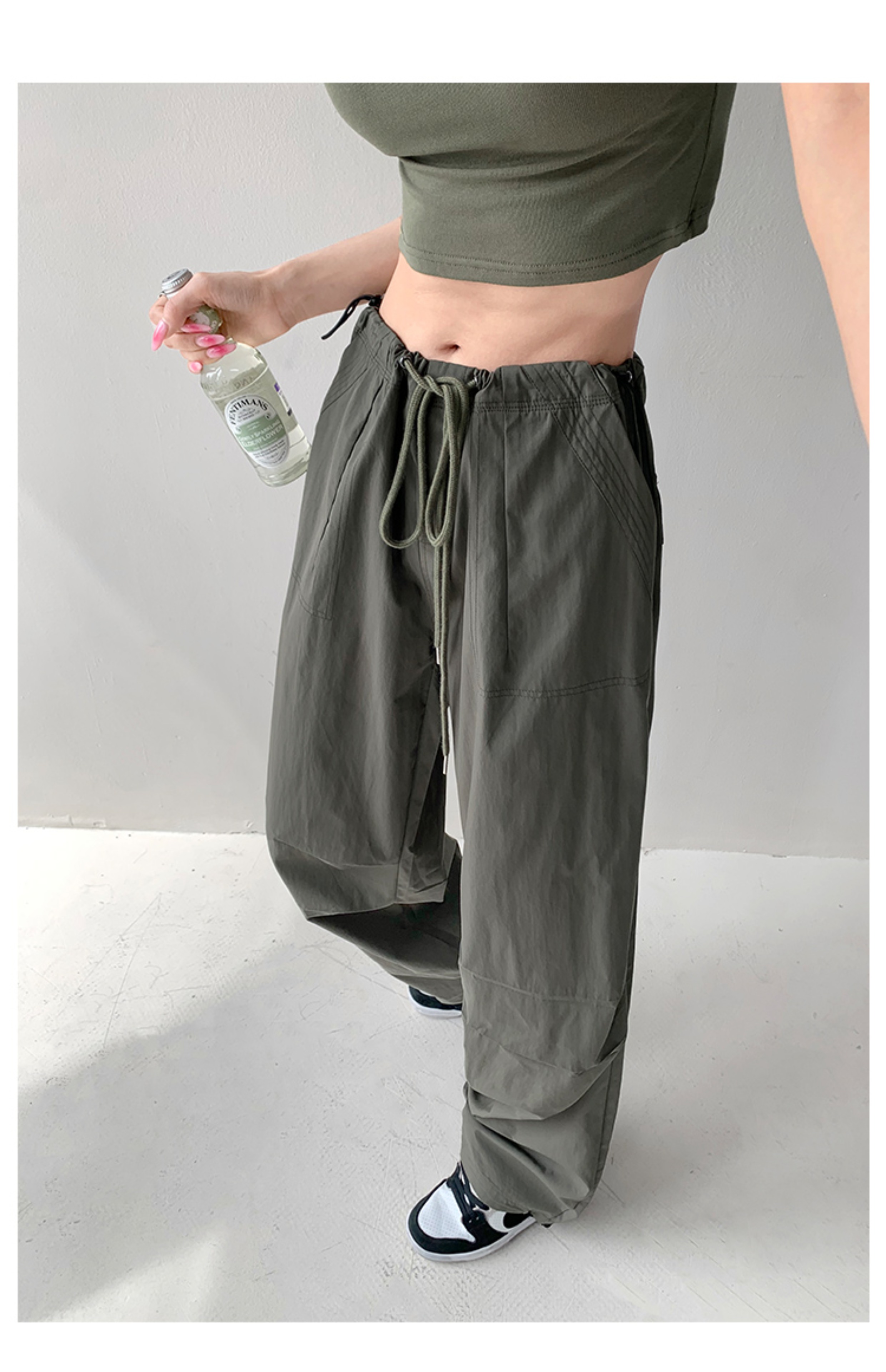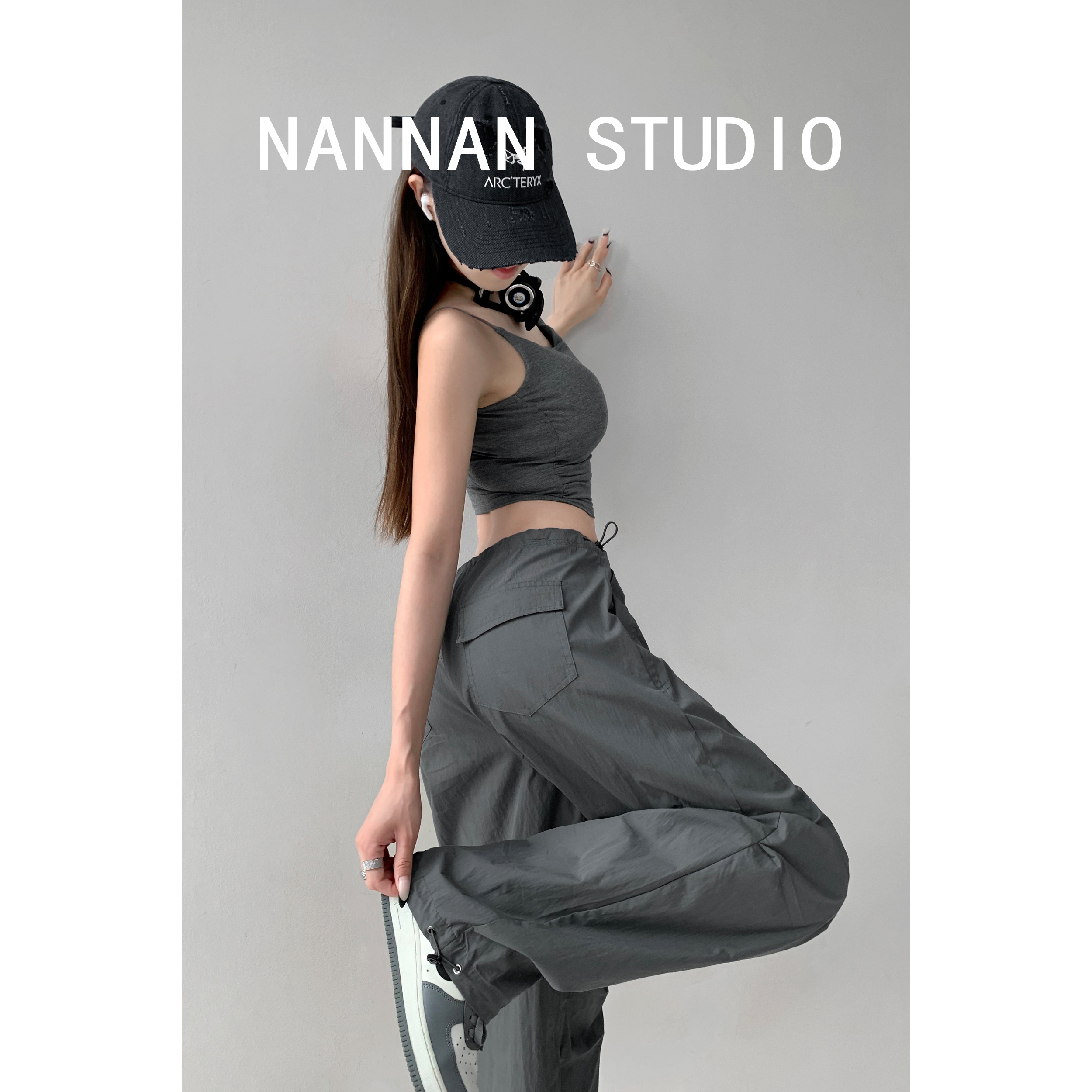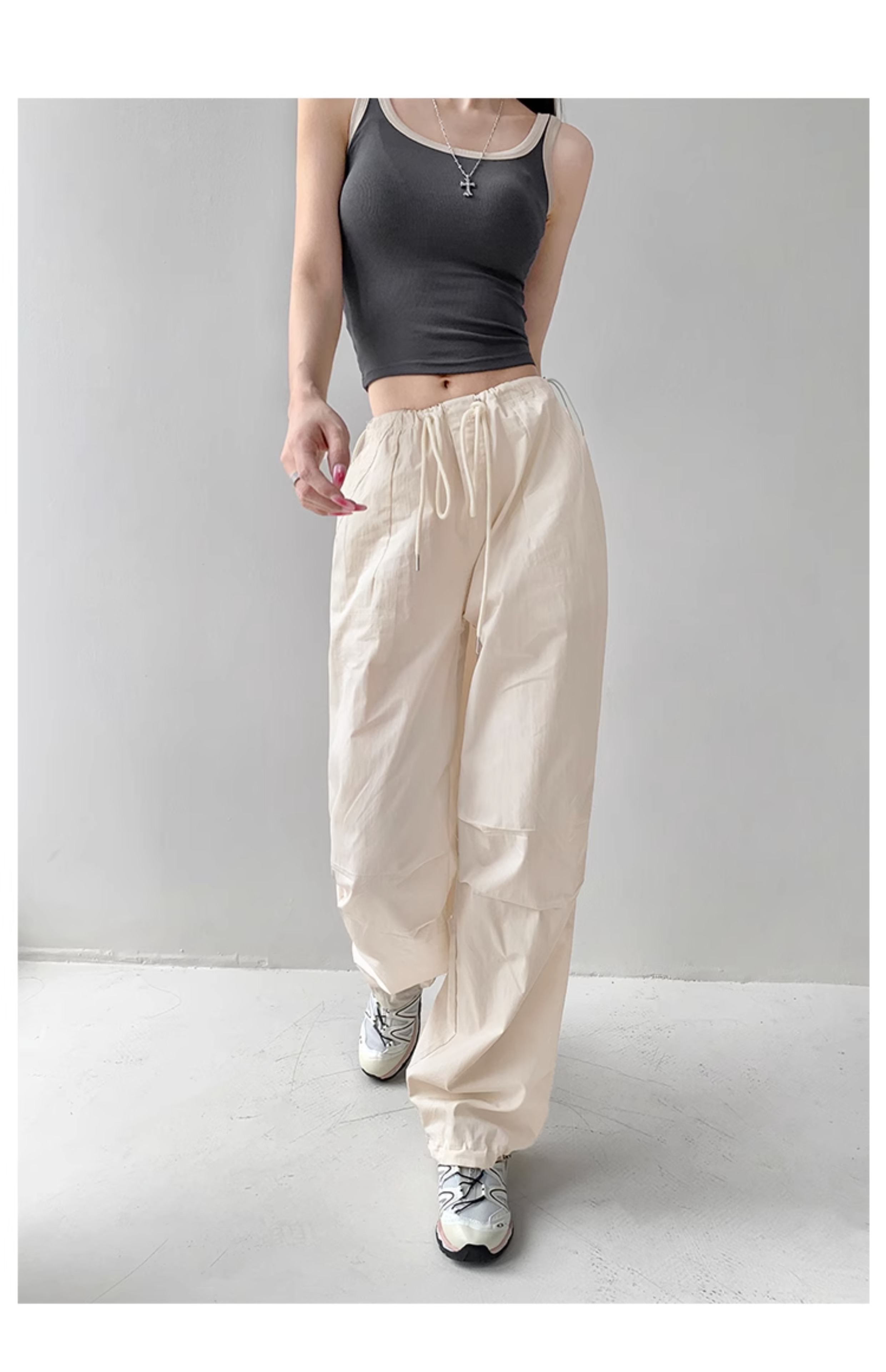 張小奈美式辣妹風寬鬆低腰抽繩工裝褲女春秋薄款褶皺闊腿降落傘褲