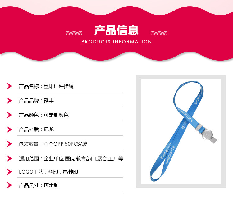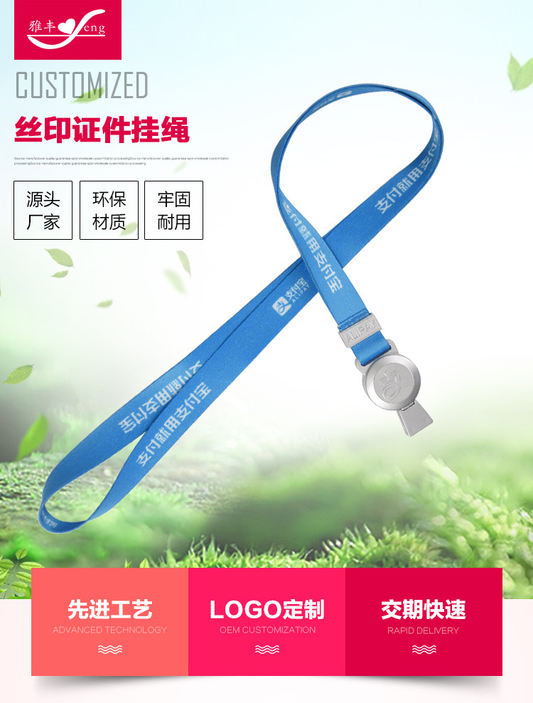 挂绳本体采用涤纶材质,绳面可根据客户要求电脑刺绣公司名与公司Logo;公司员工配带着含有您公司Logo的挂绳,无形中体显出您公司的形象与员工素质。