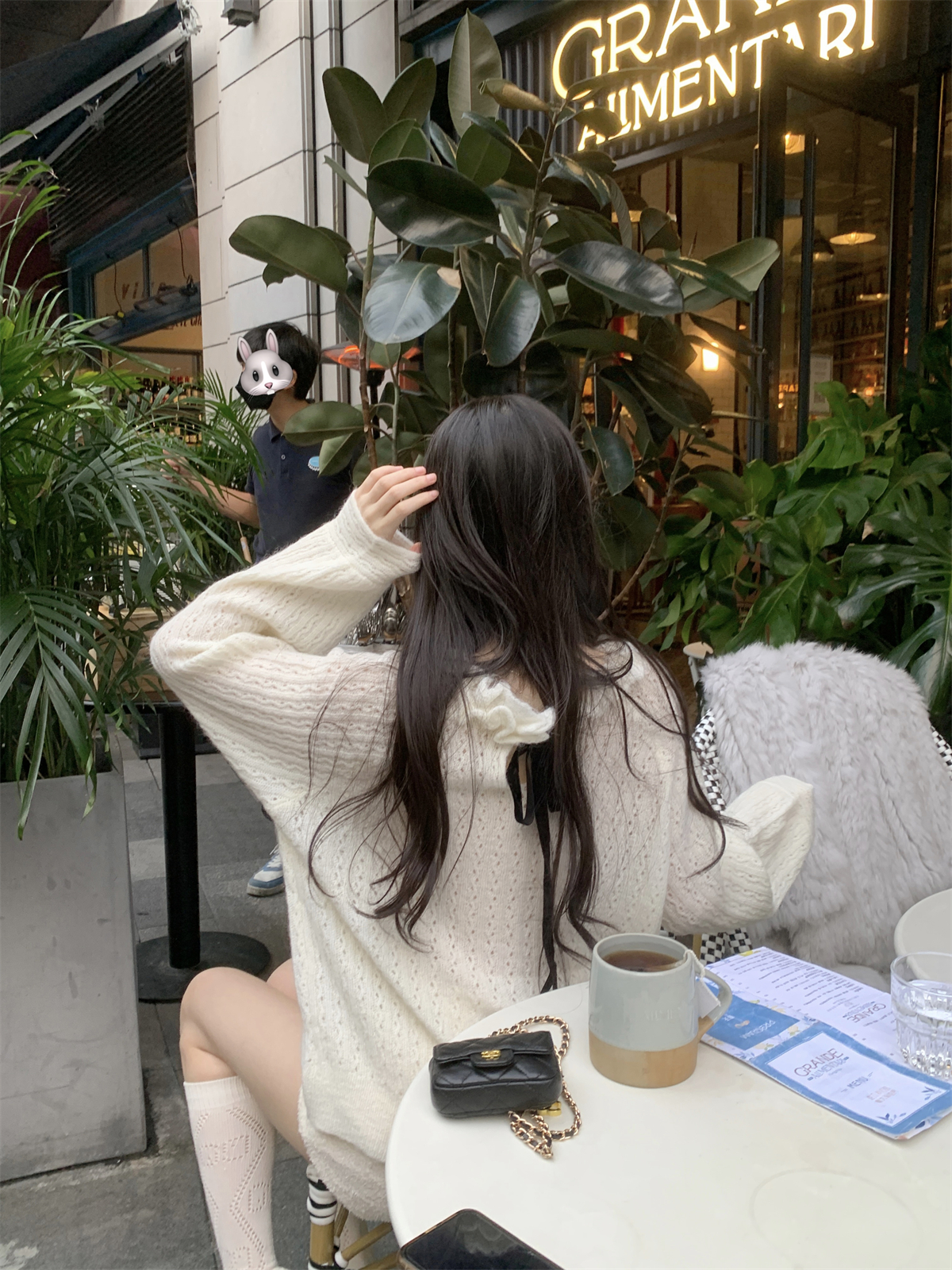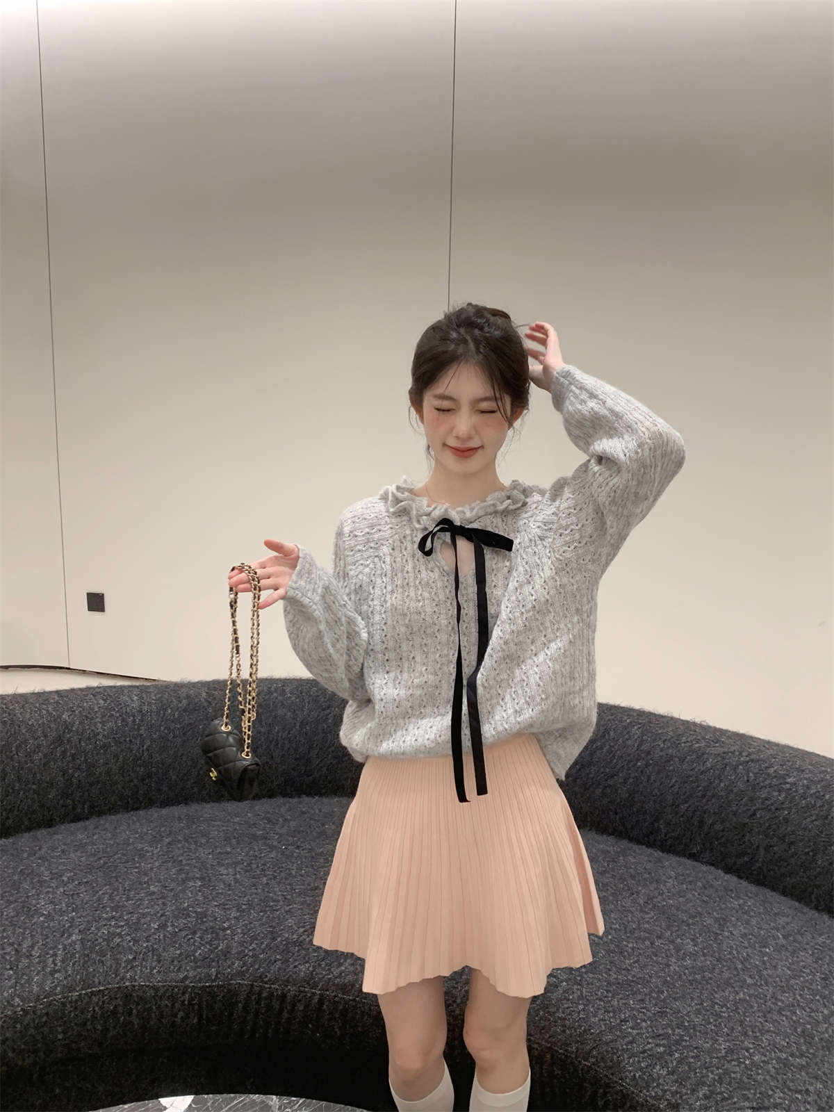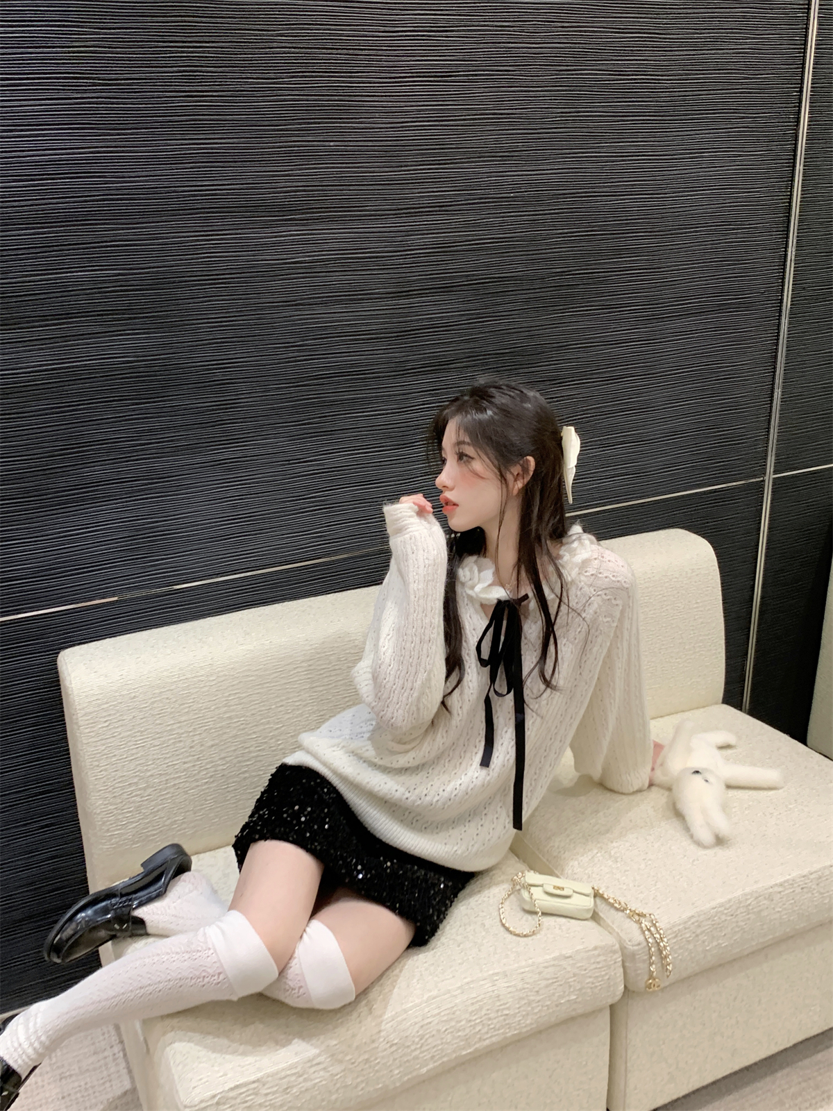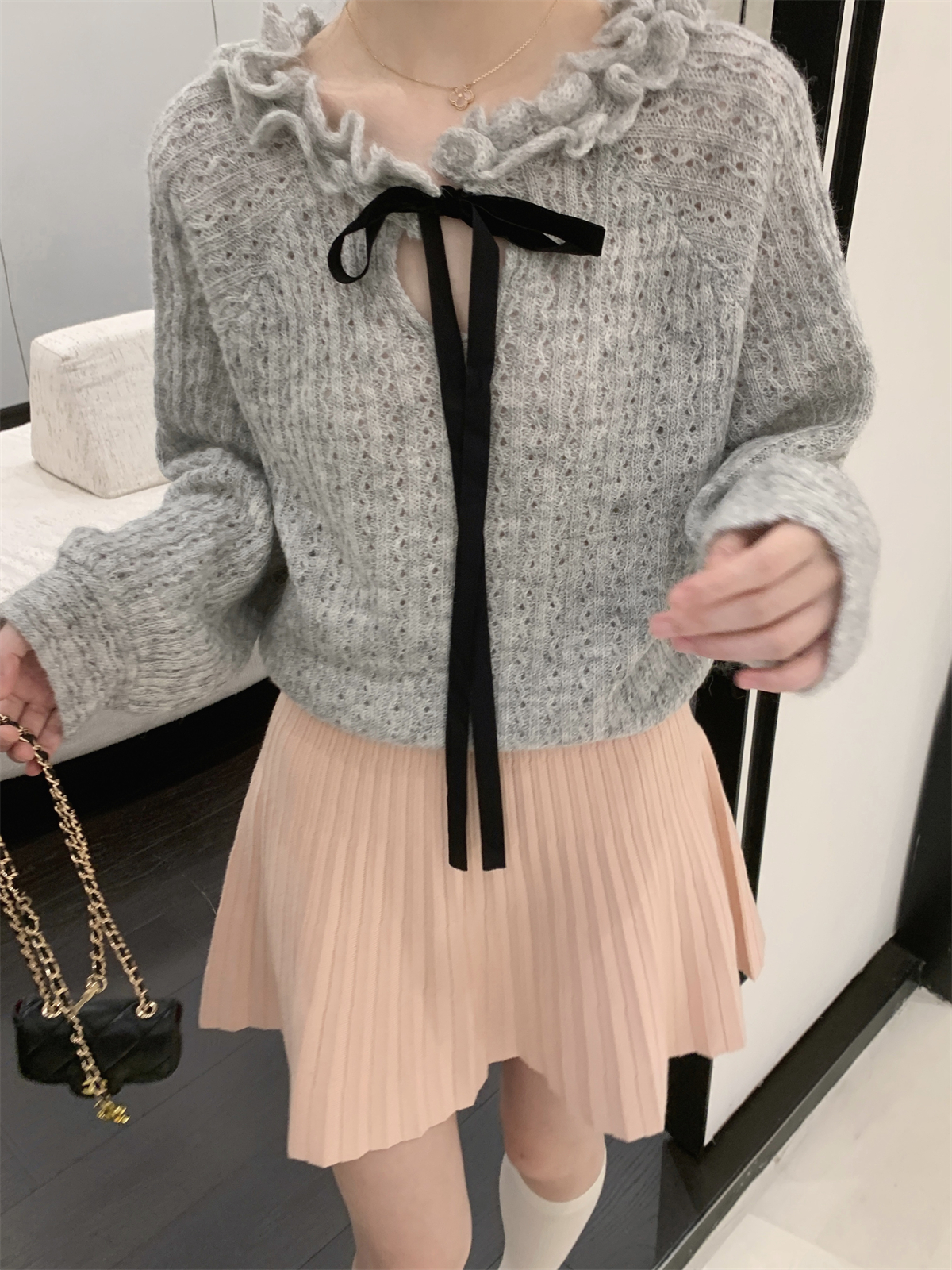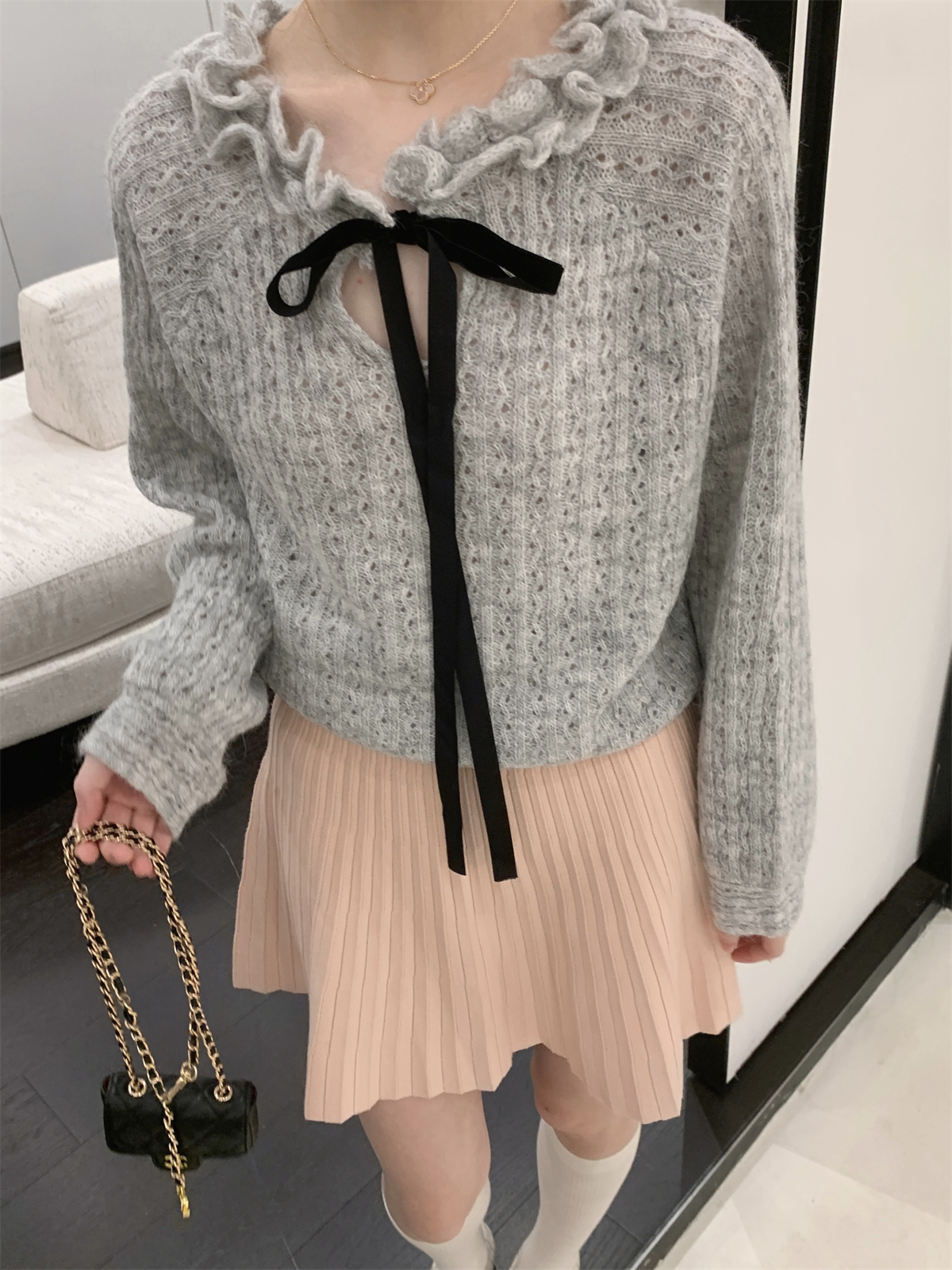 LXLILIUM【西露紗語】兩色花邊馬海毛毛衣女秋冬季繫帶鏤空針織衫