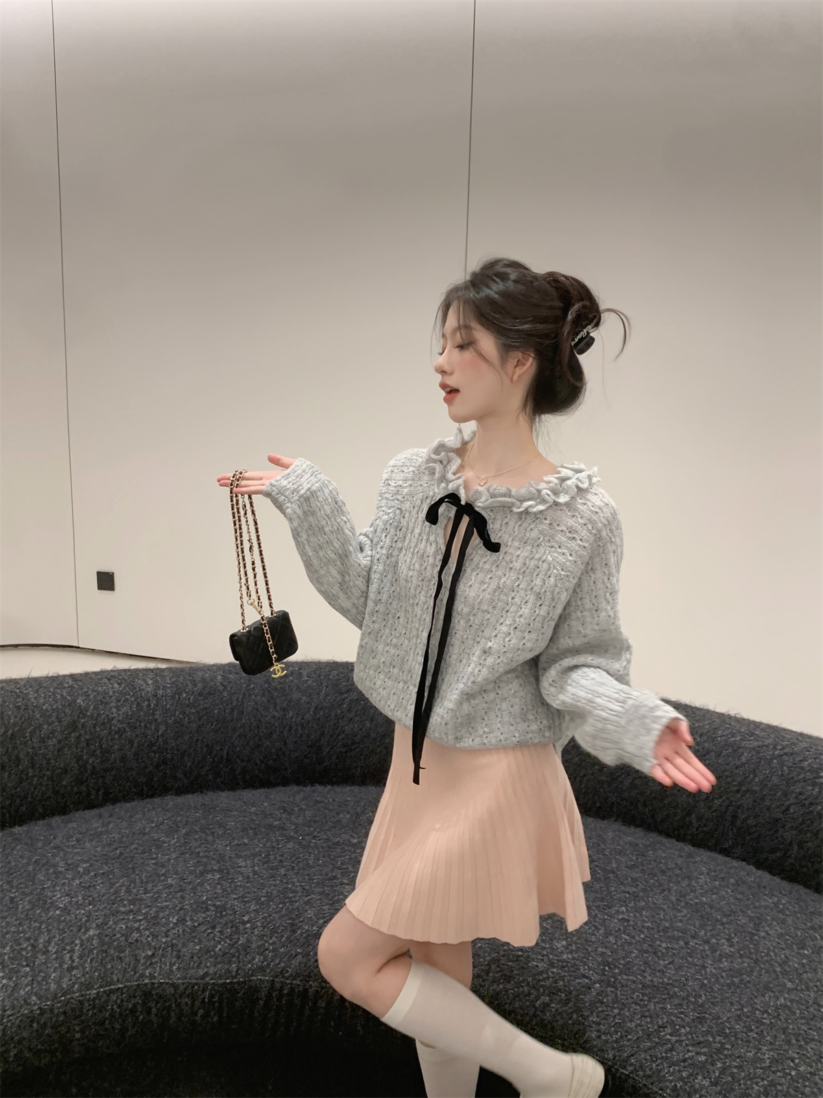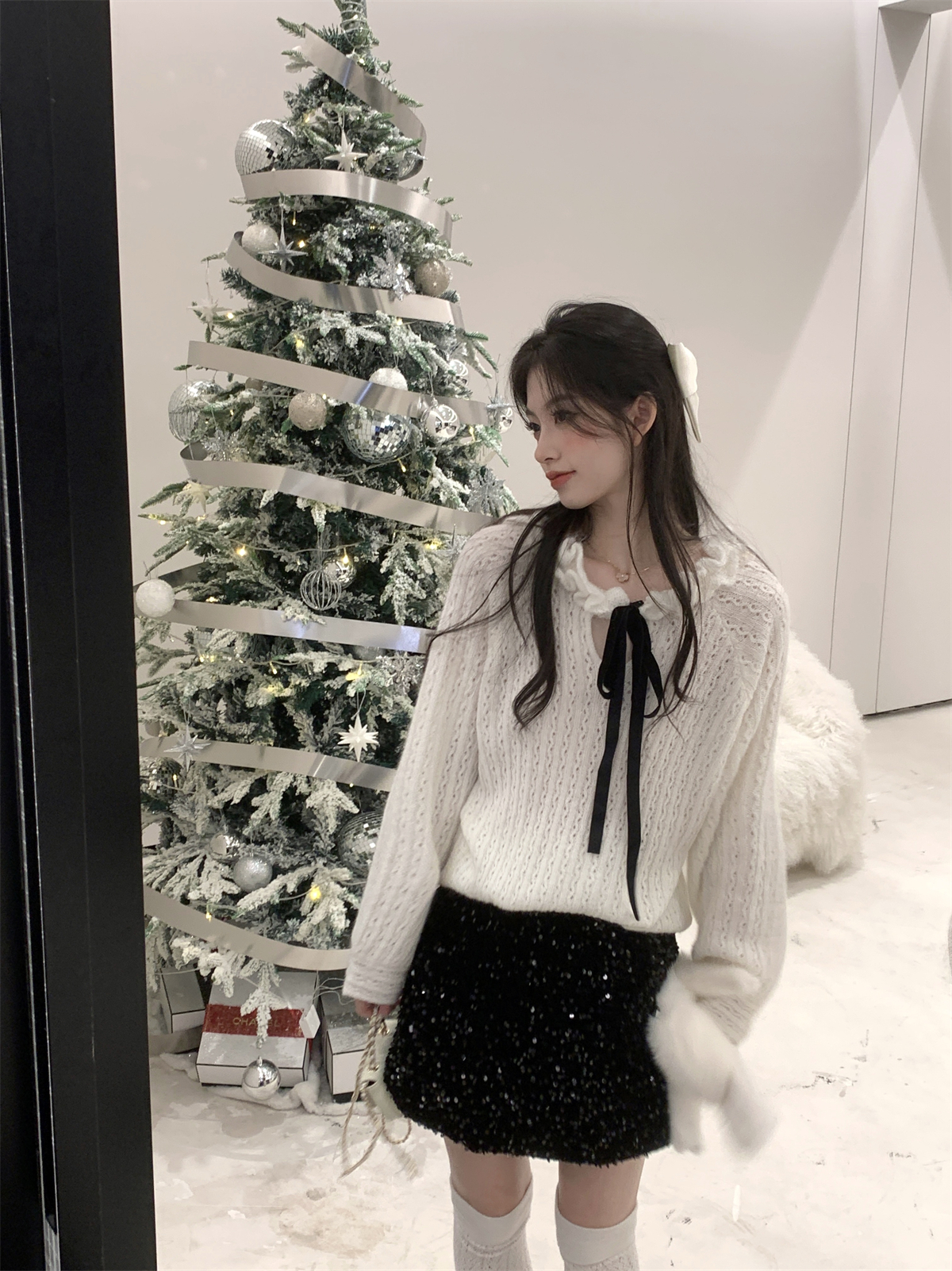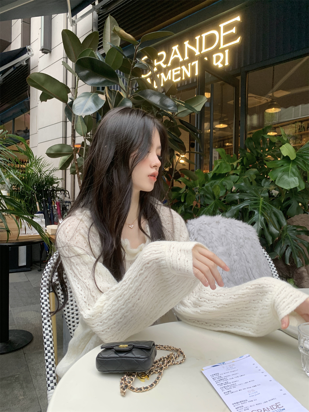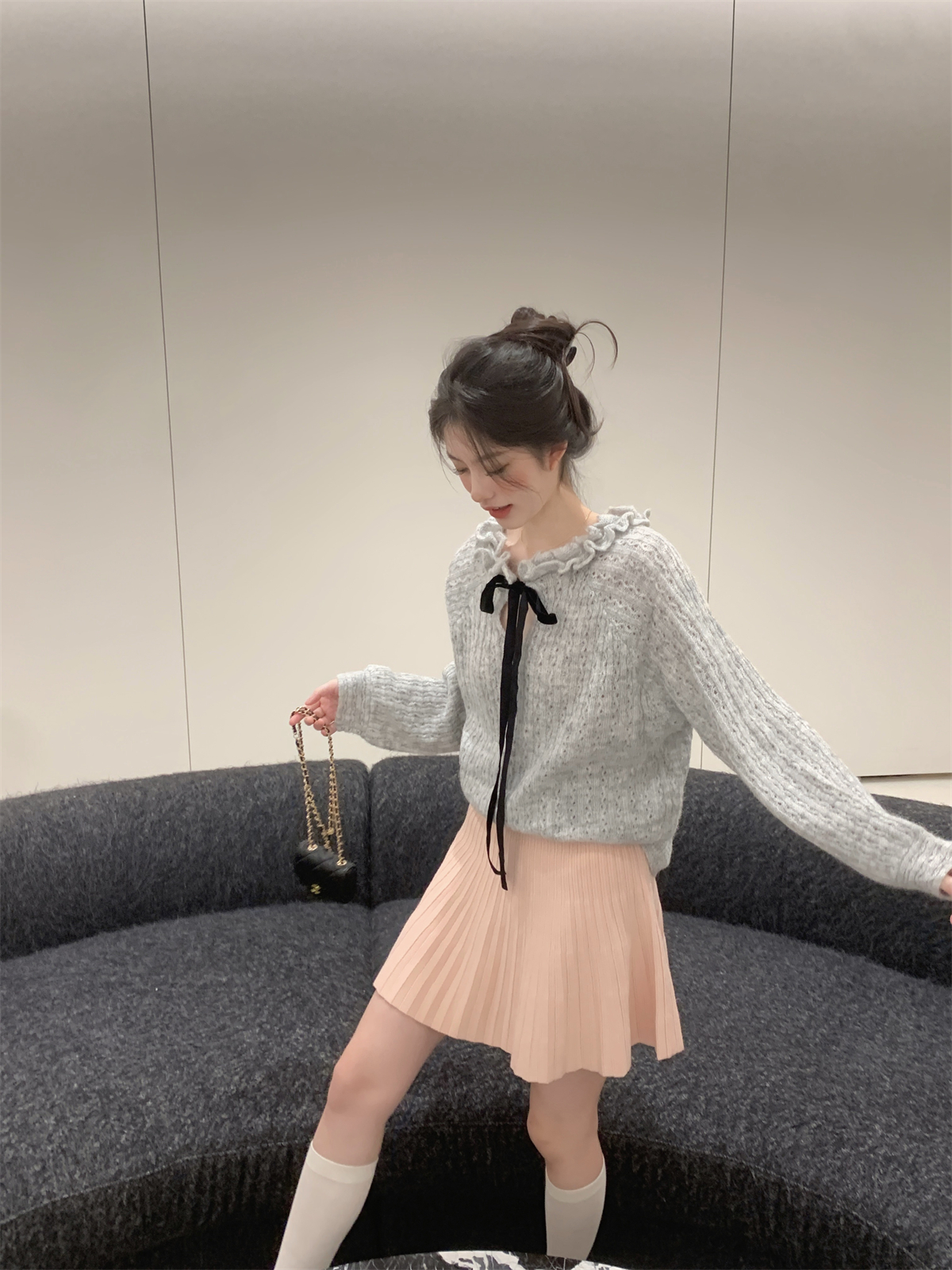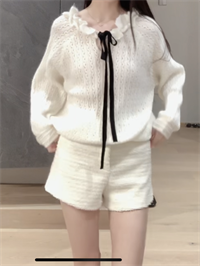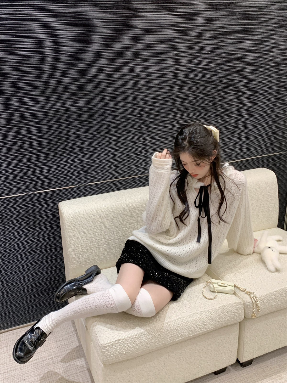 LXLILIUM【西露紗語】兩色花邊馬海毛毛衣女秋冬季繫帶鏤空針織衫