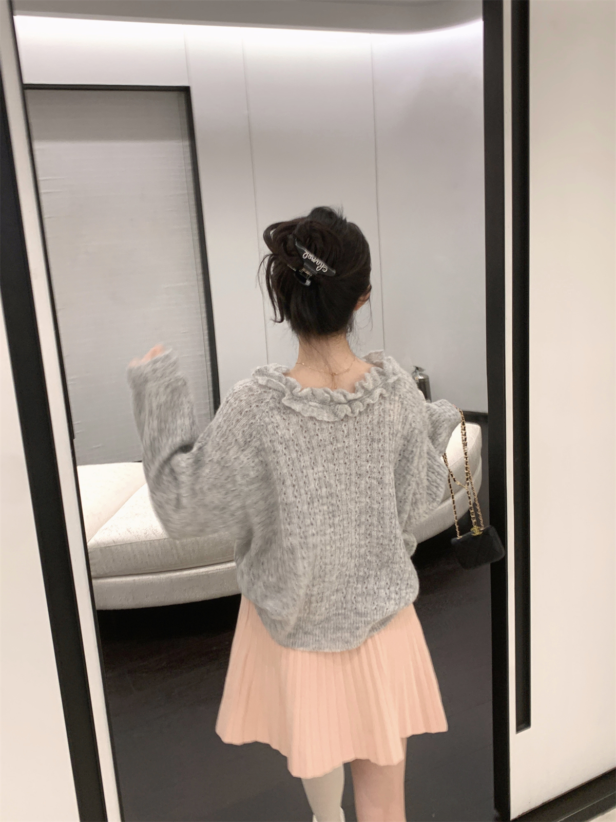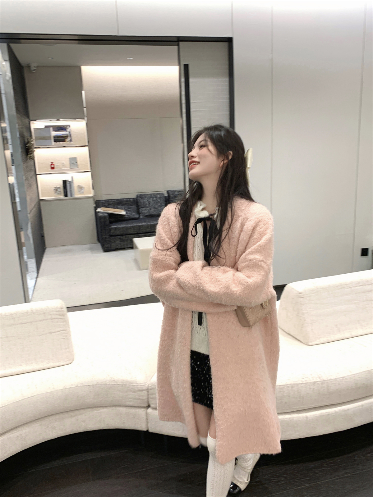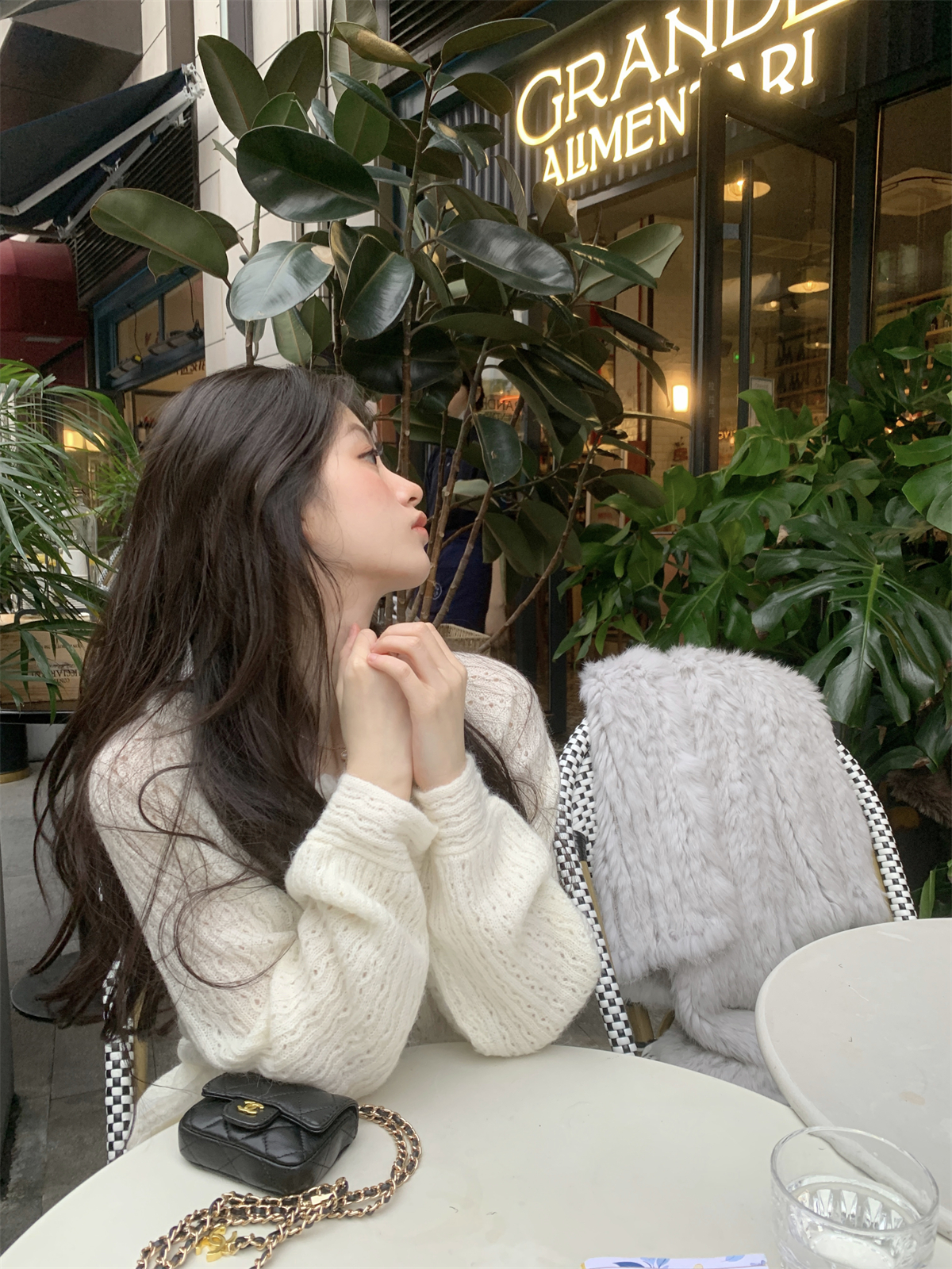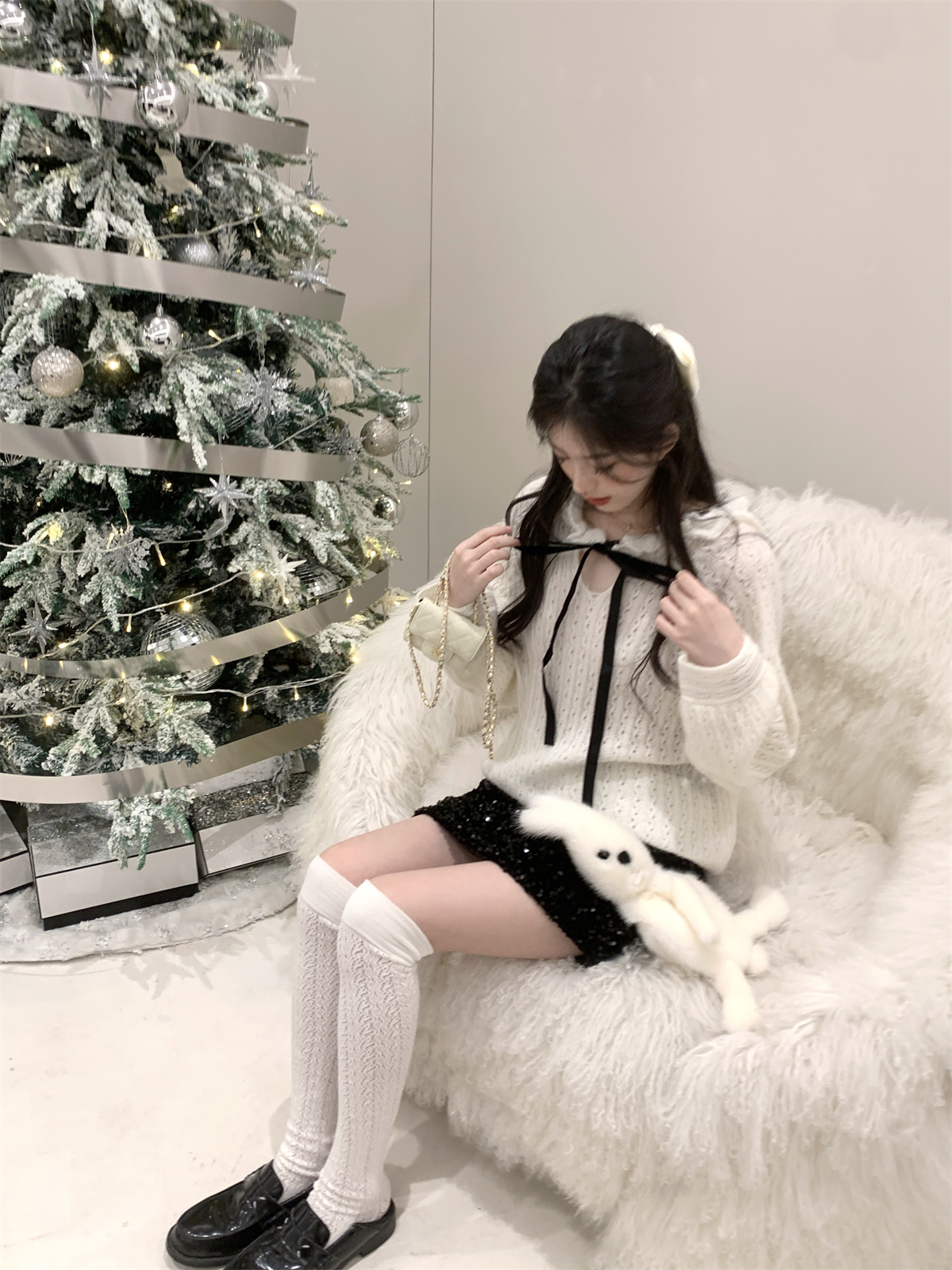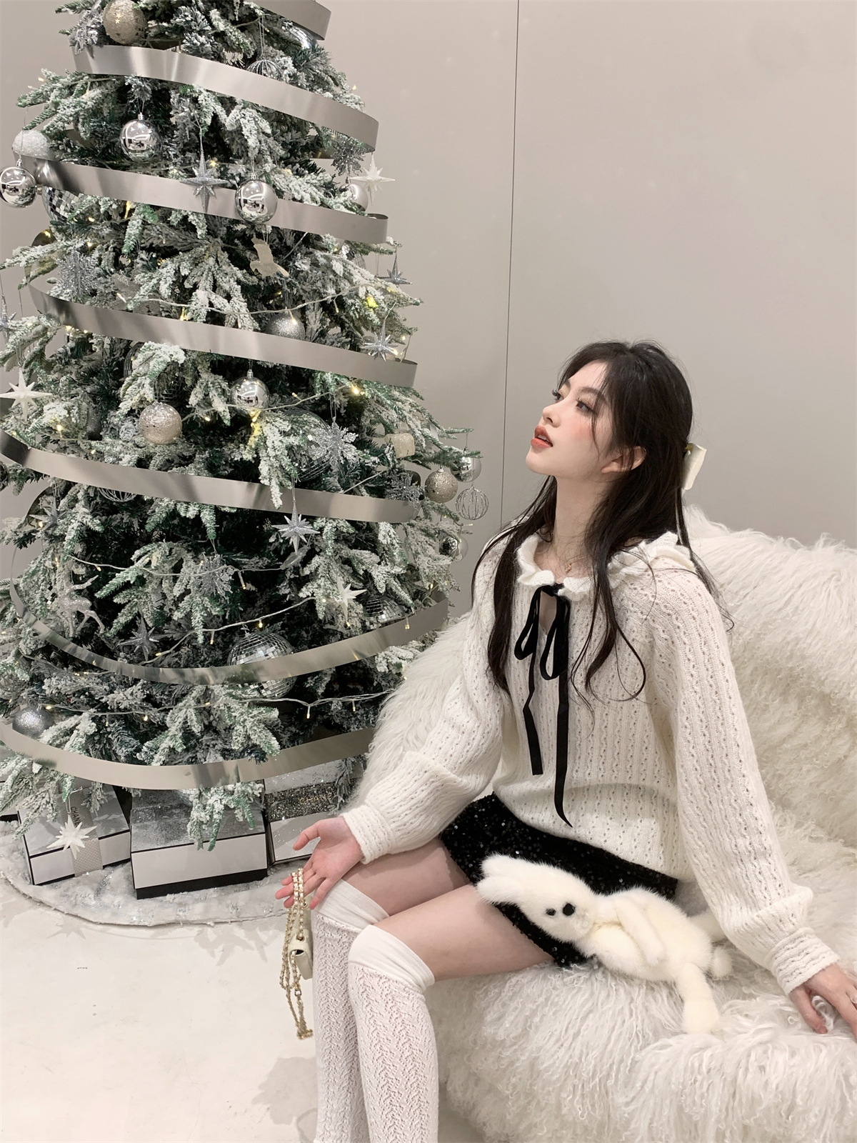 LXLILIUM【西露紗語】兩色花邊馬海毛毛衣女秋冬季繫帶鏤空針織衫