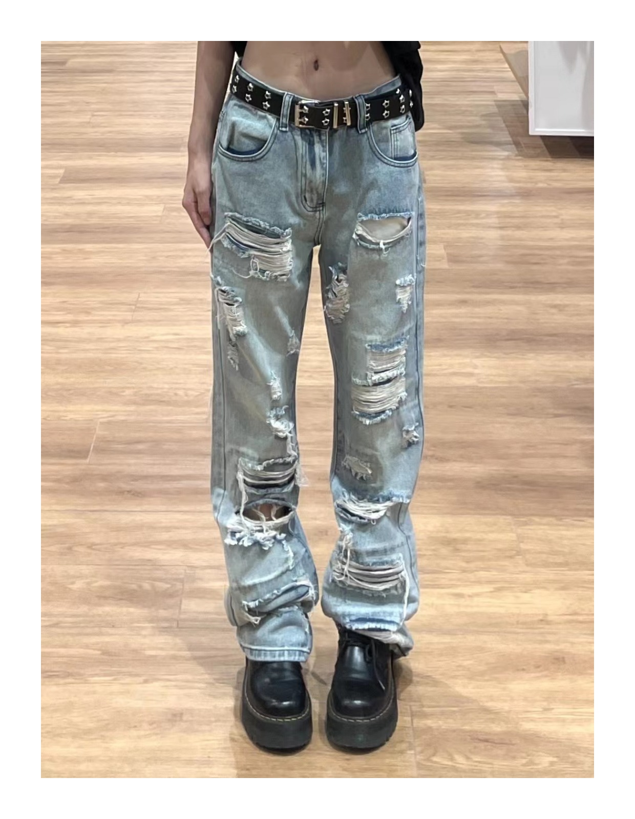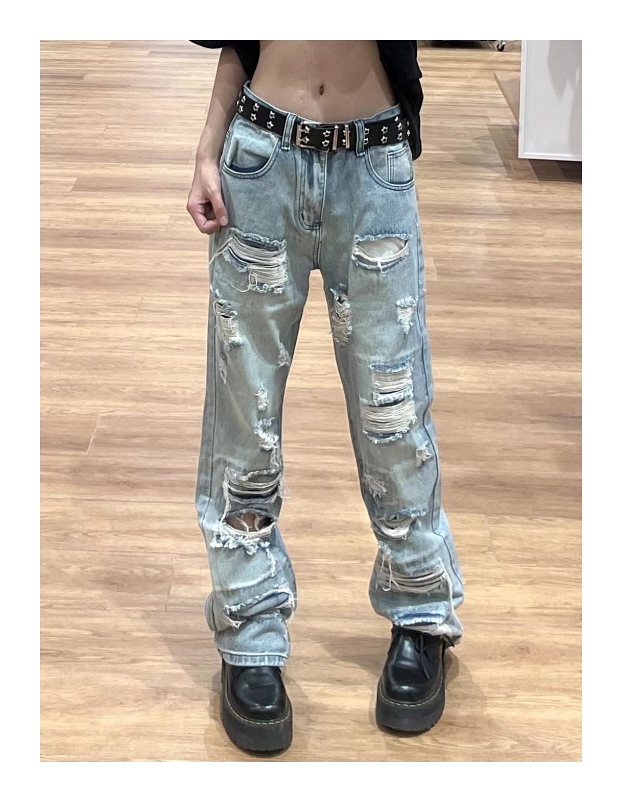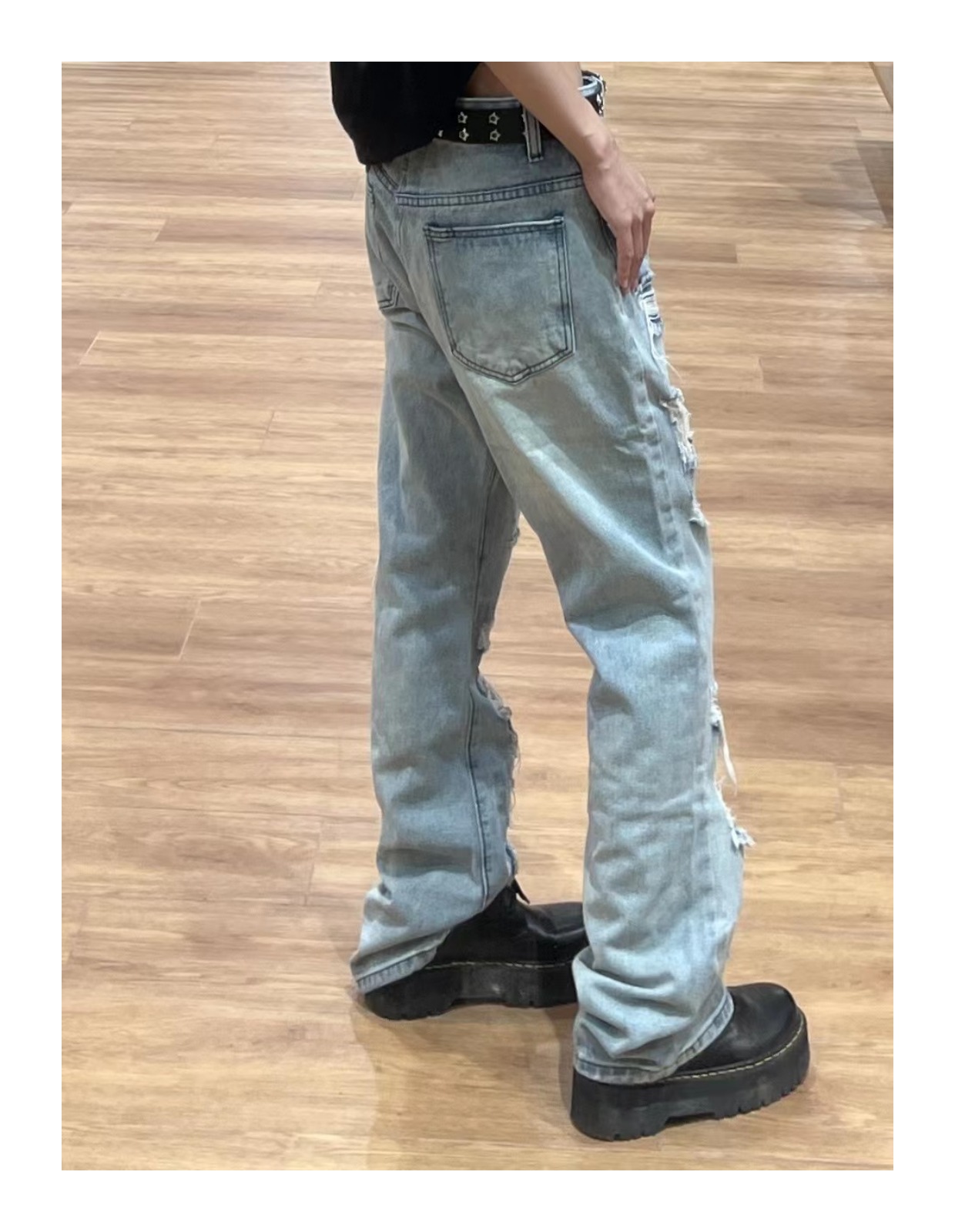 LOV1 美式復古水洗破洞微喇叭vibe風男女寬鬆高街長褲ins休閒褲子