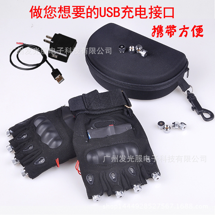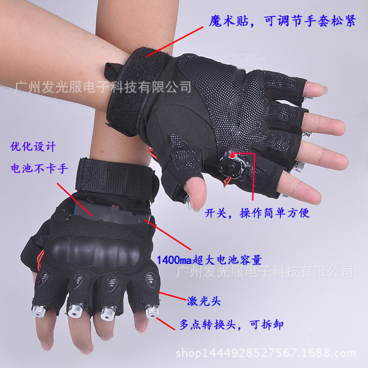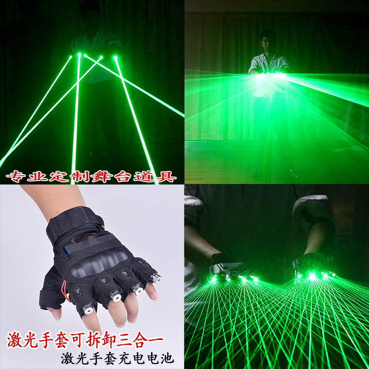 本款激光手套是本厂专业团队倾情打造的,专业舞台道具,整副手套设计合理,使用方便。工厂直销 质量有保证,且本款激光手套是二合一,三合一的激光手套,一只手套多种类型可用,激光可拆卸,可换成不同的光束(单点,多点,平面)三种类型, 配送大容量可充电池与专用充电器,充电超级方便,无需更换电池,操作简便,直接插上即可,且可反复使用,远销海外、港、奥、台,国内外许多大型演出团体订购选用。你值得拥有!