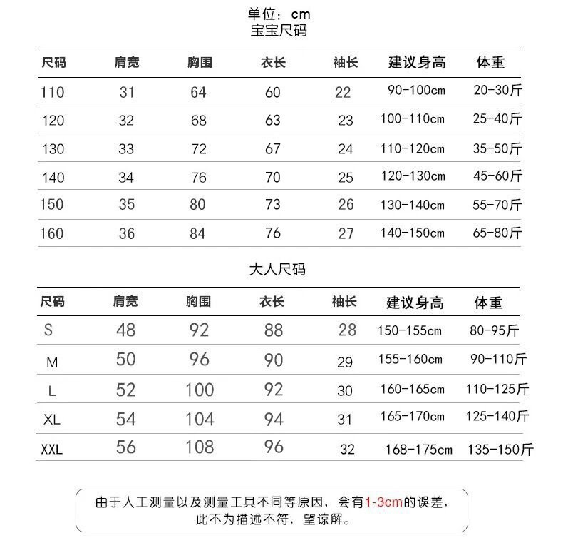 适合身高 110cm(建议身高105cm左右),120cm(建议身高115cm左右),130cm(建议身高125cm左右),140cm(建议身高135cm左右),150cm(建议身高145cm左右),160cm(建议身高155cm左右),妈妈S码(建议体重80到90斤),妈妈M码(建议体重90到105斤),妈妈L码(建议体重105到115斤),妈妈XL码(建议体重115到125斤),妈妈XXL码(建议体重125到135斤)