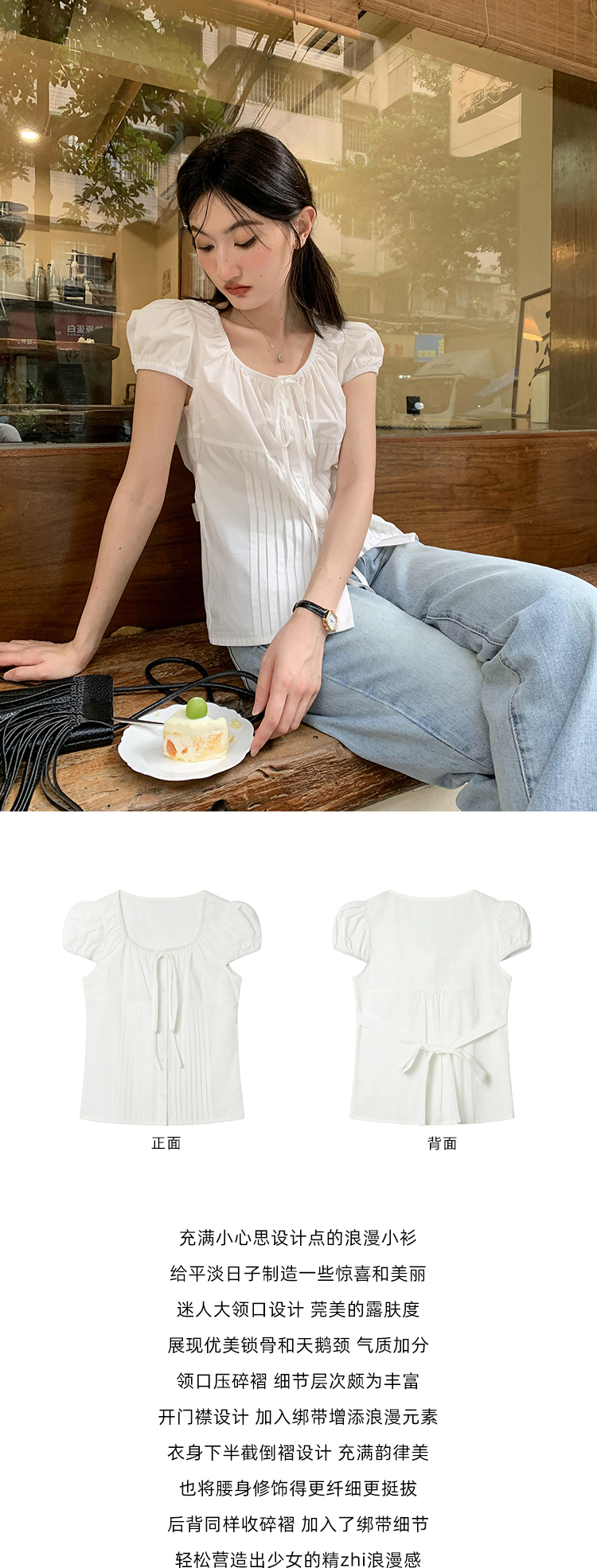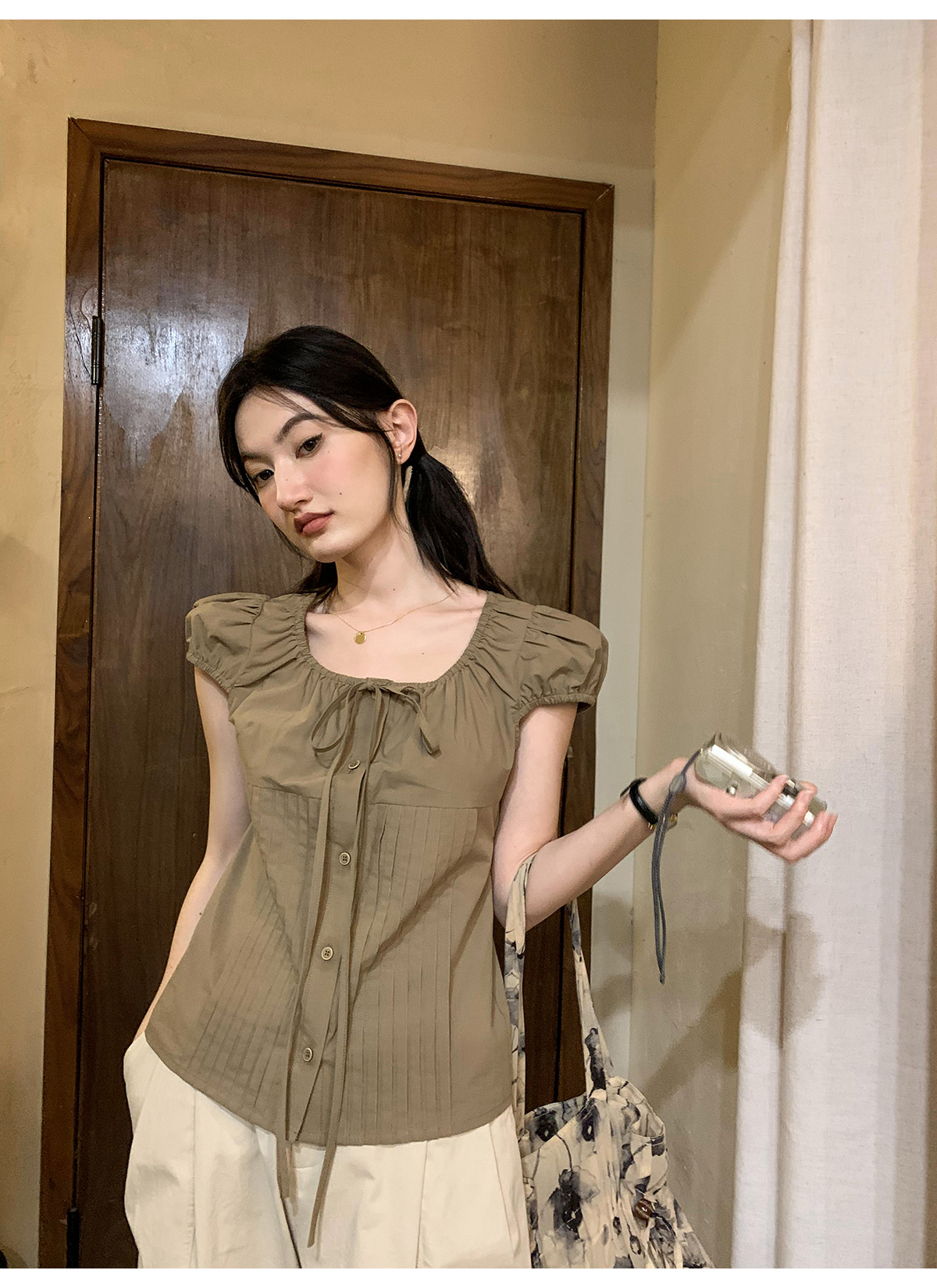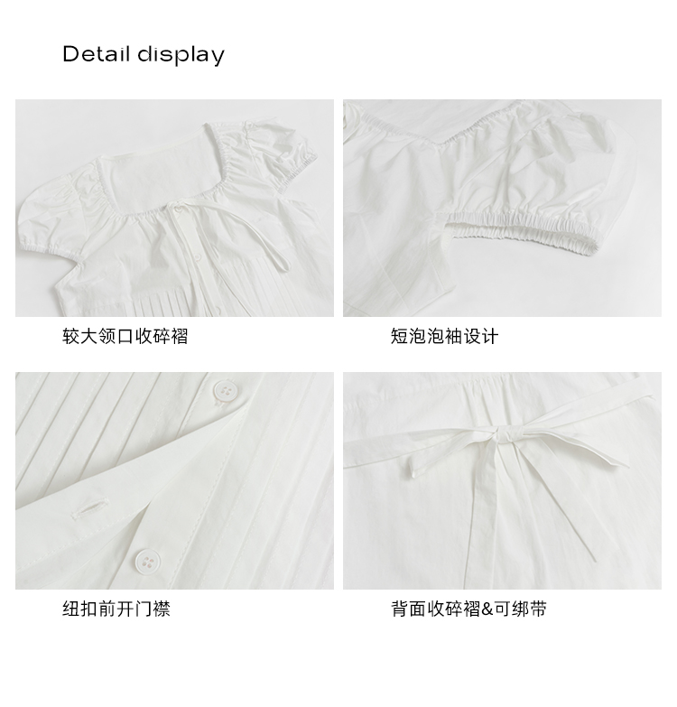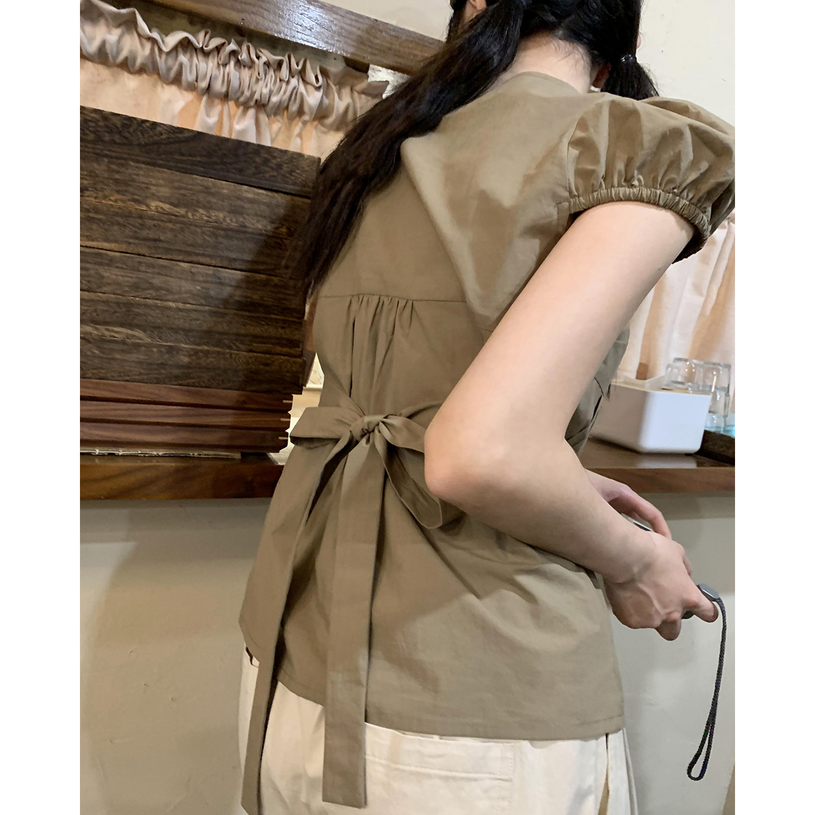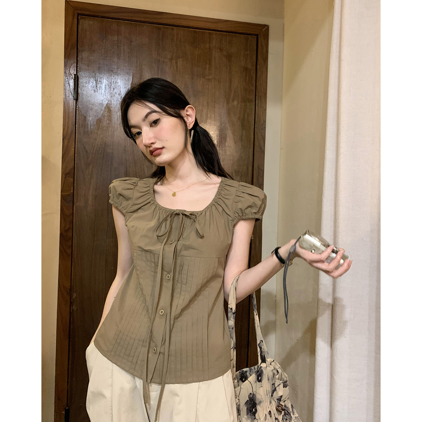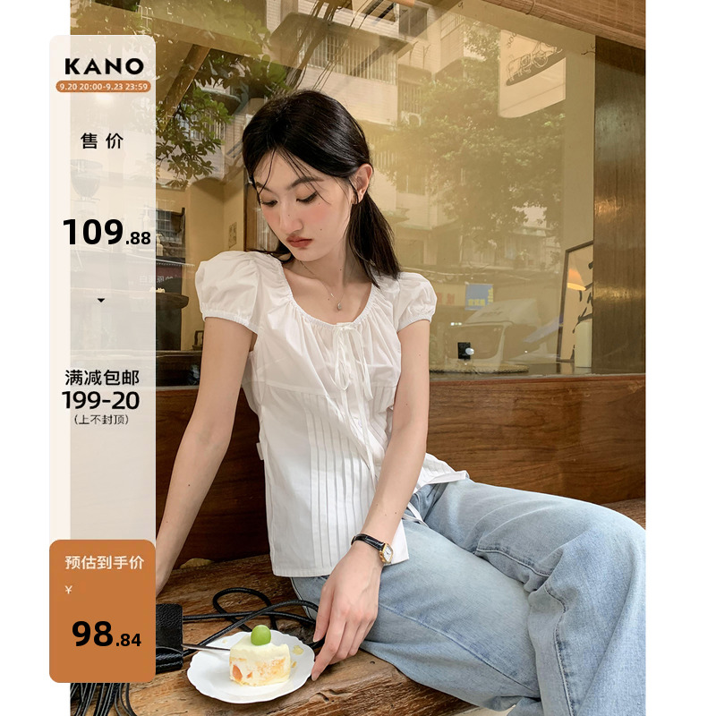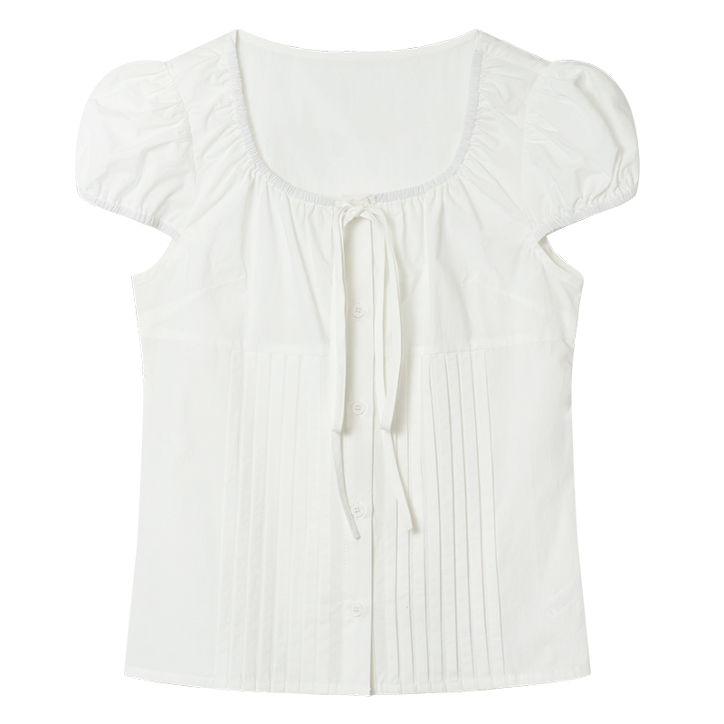 你好卡農 繫帶單排扣泡泡袖短袖上衣夏季薄款寬鬆顯瘦小個子襯衫