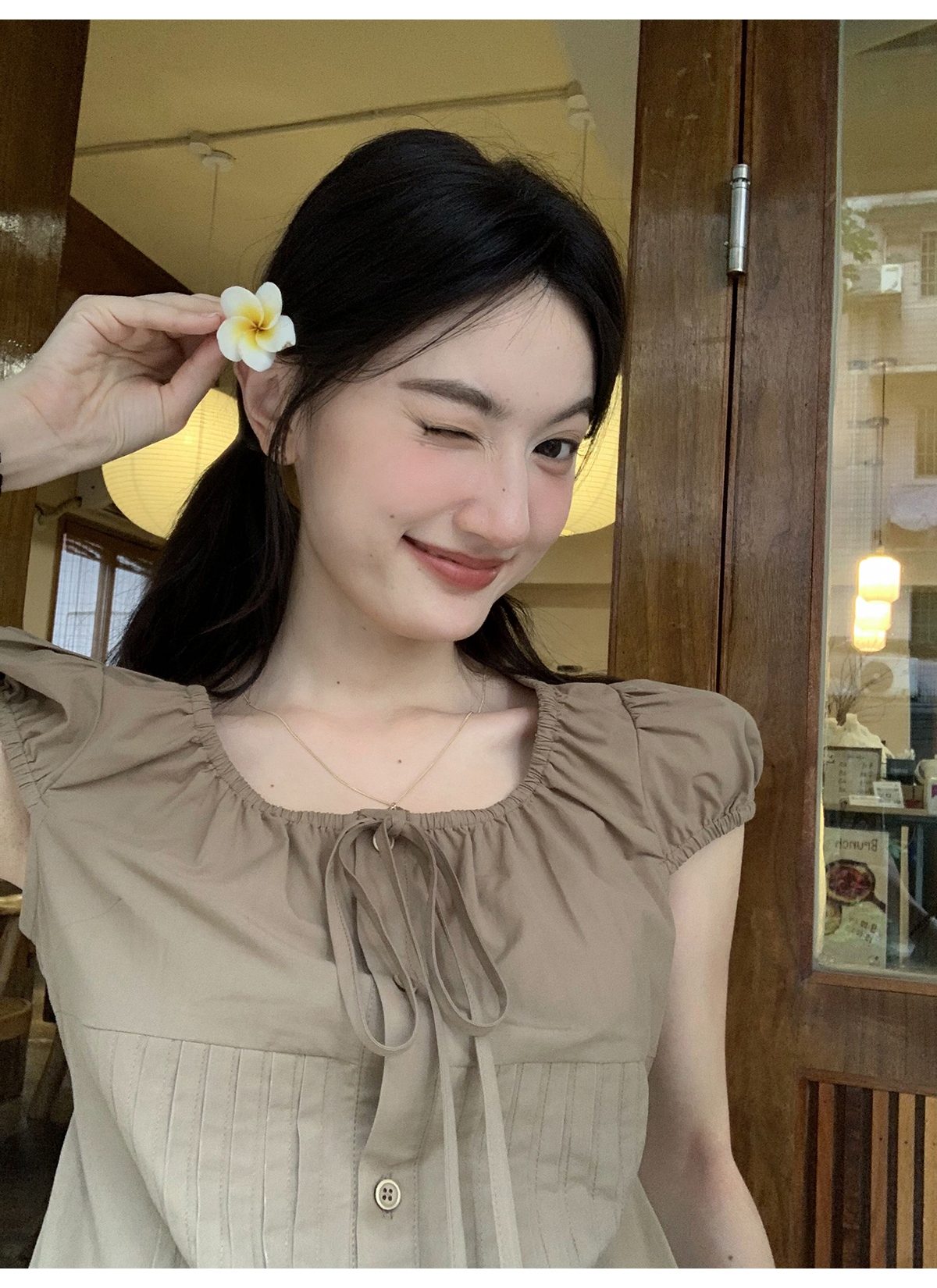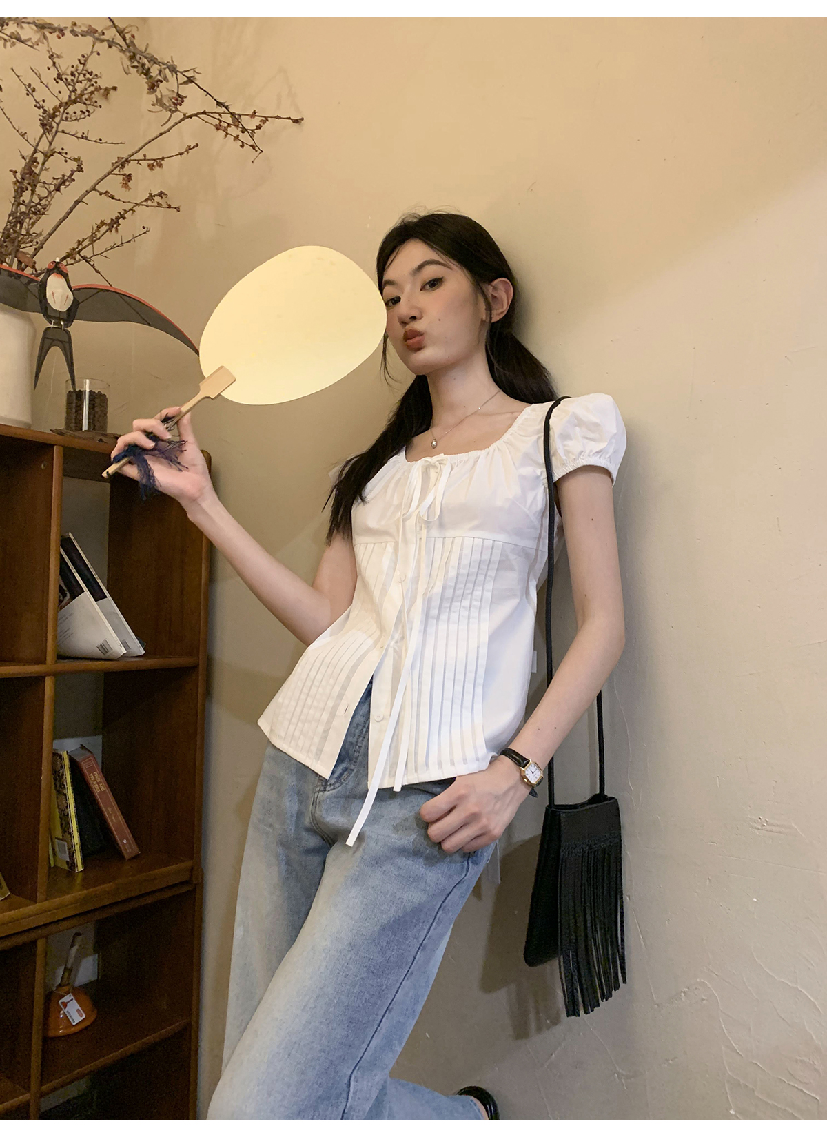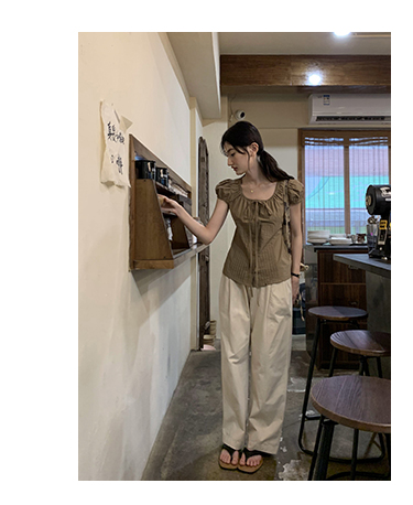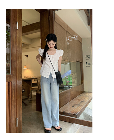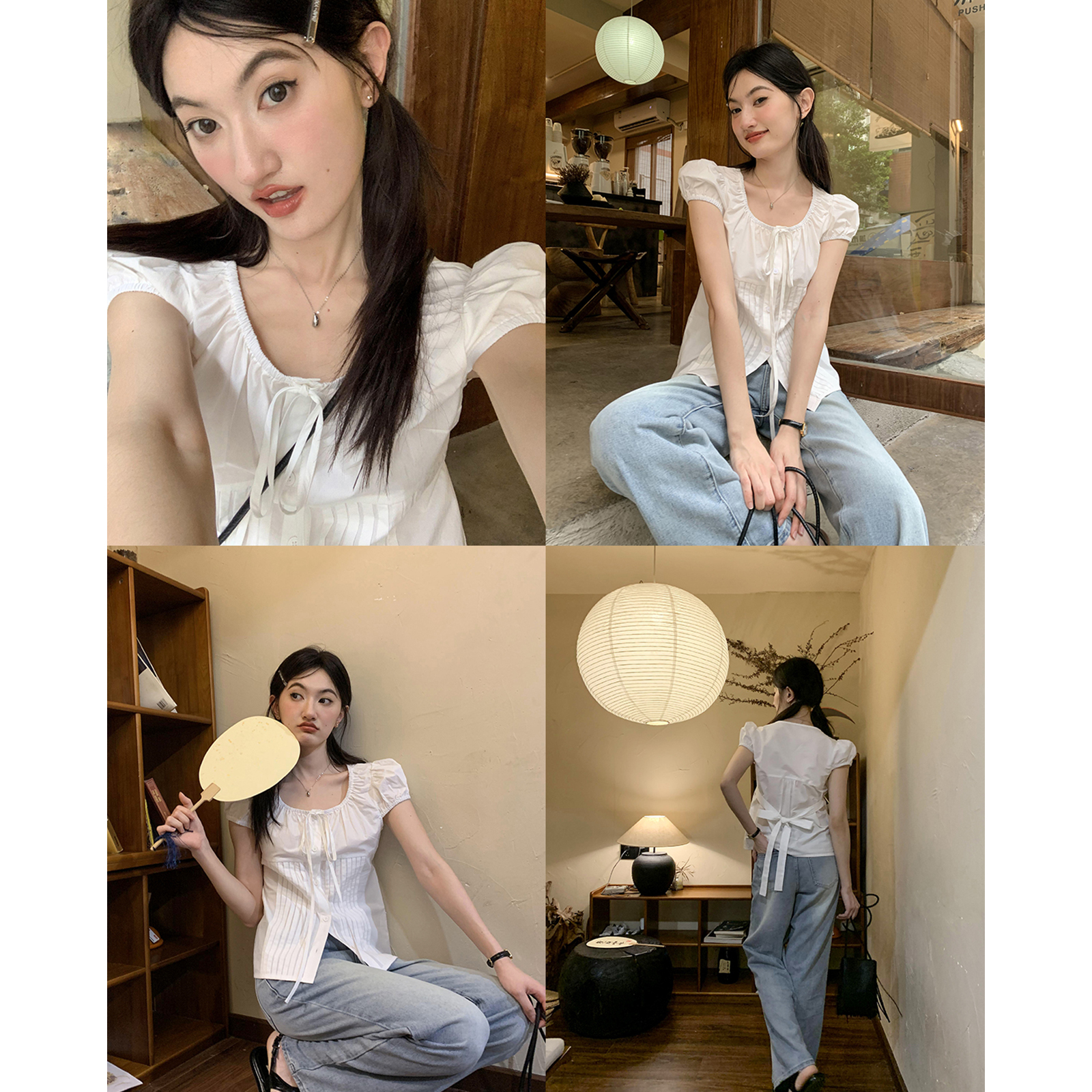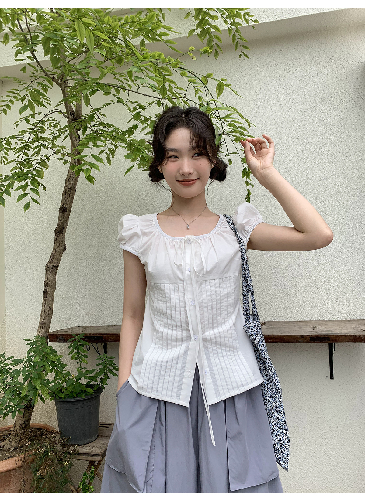 你好卡農 繫帶單排扣泡泡袖短袖上衣夏季薄款寬鬆顯瘦小個子襯衫