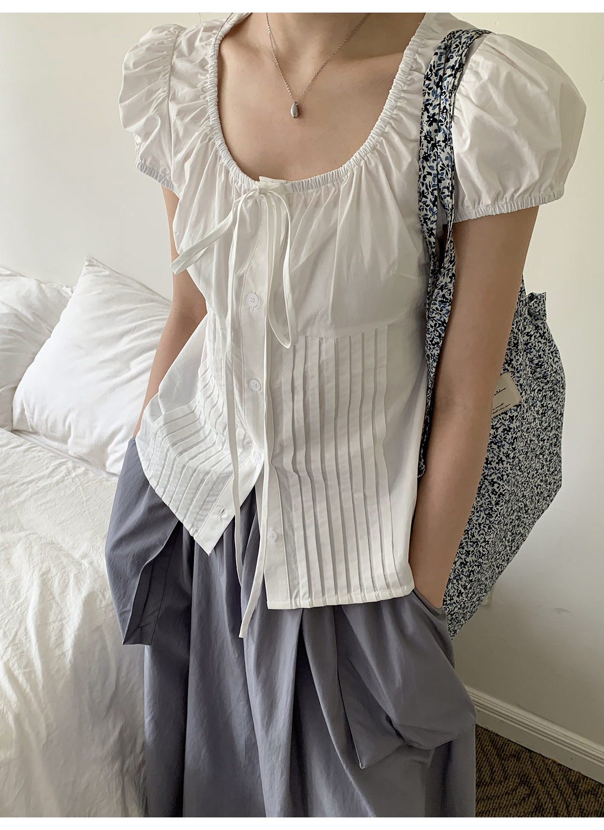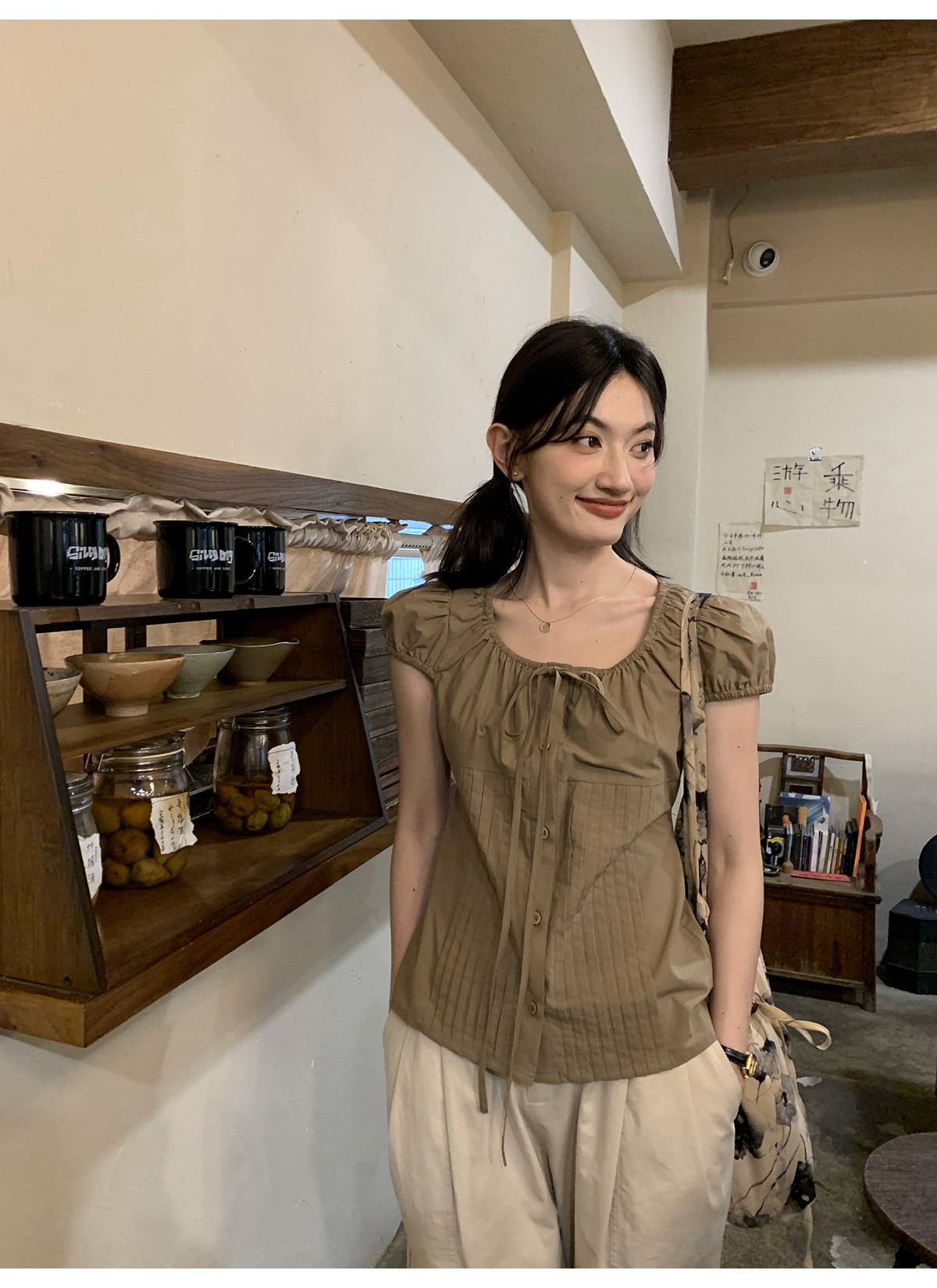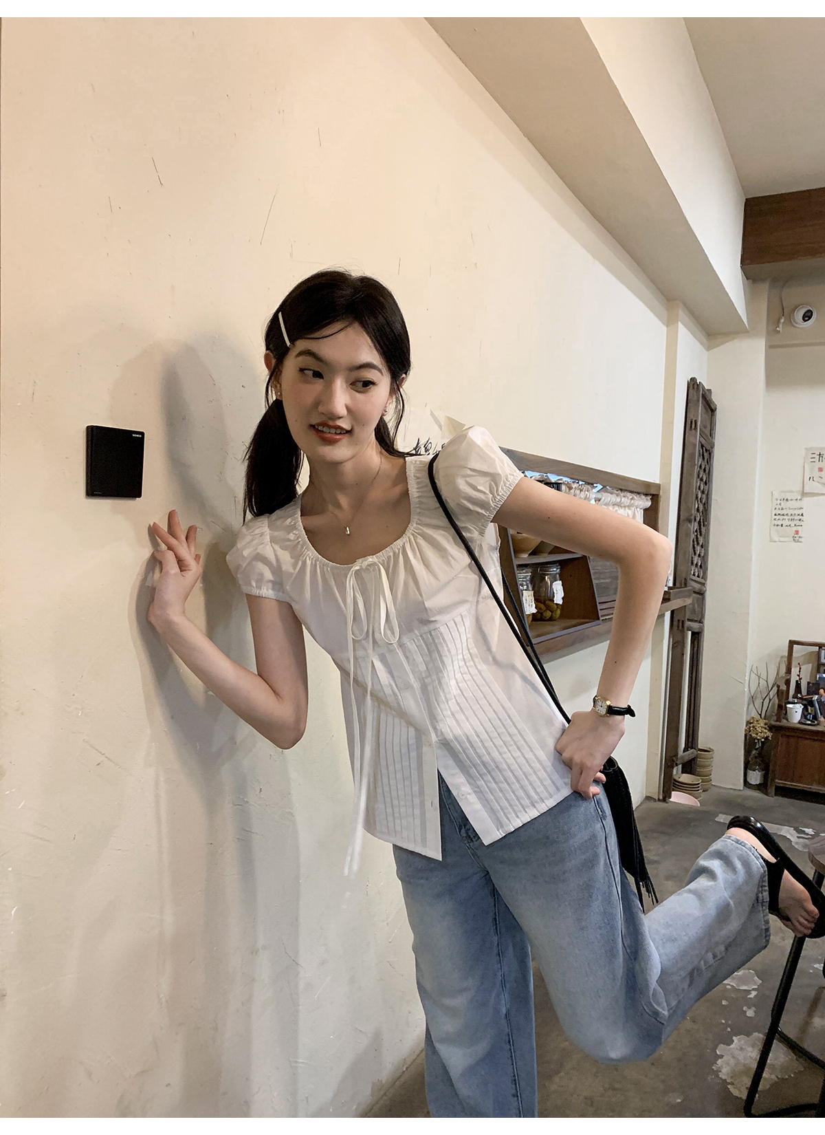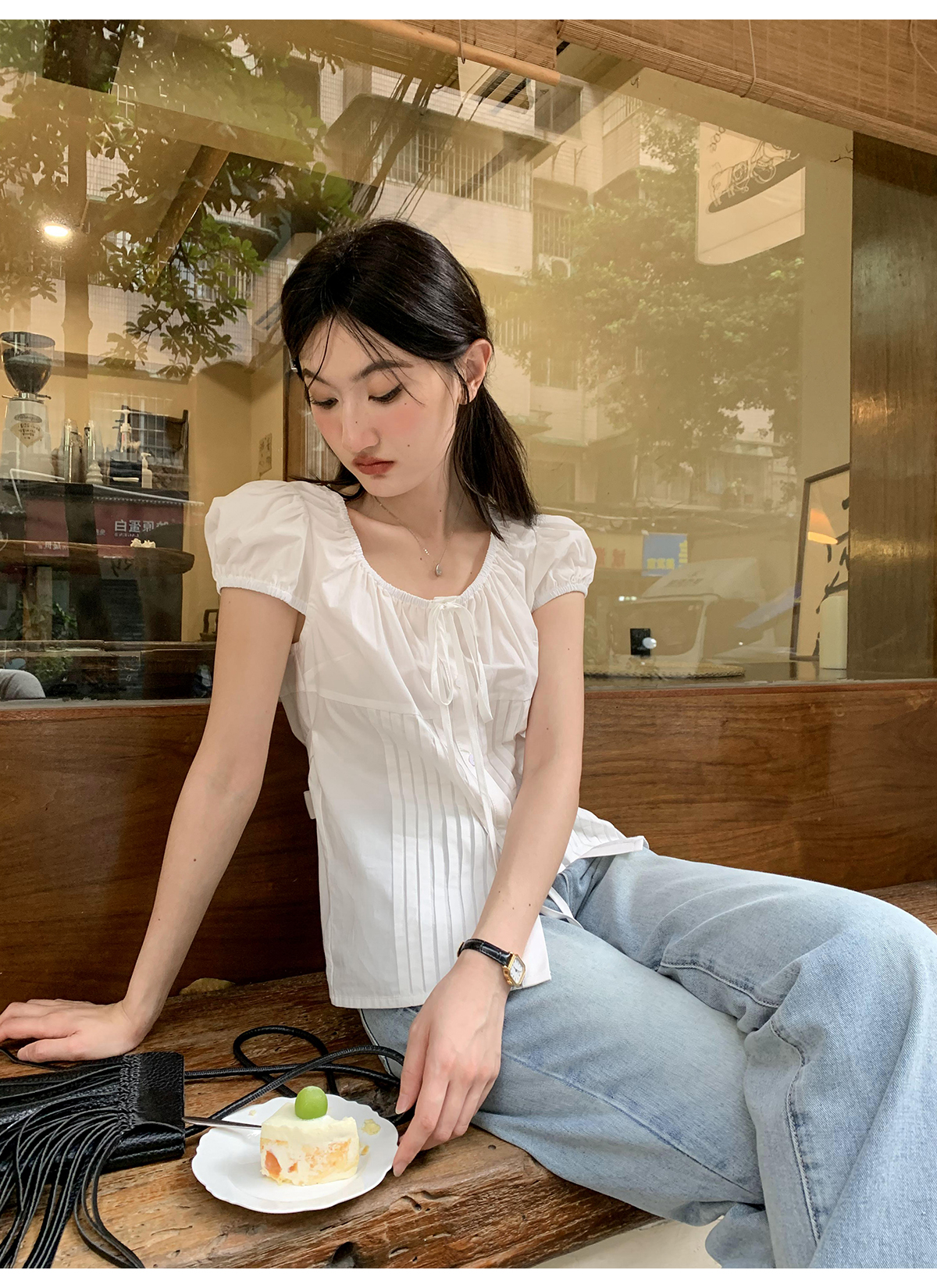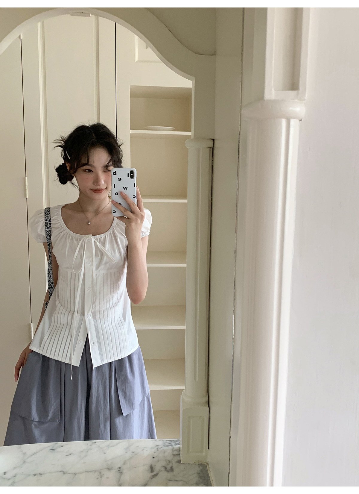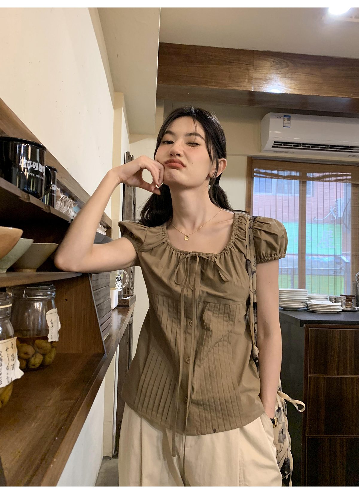 你好卡農 繫帶單排扣泡泡袖短袖上衣夏季薄款寬鬆顯瘦小個子襯衫
