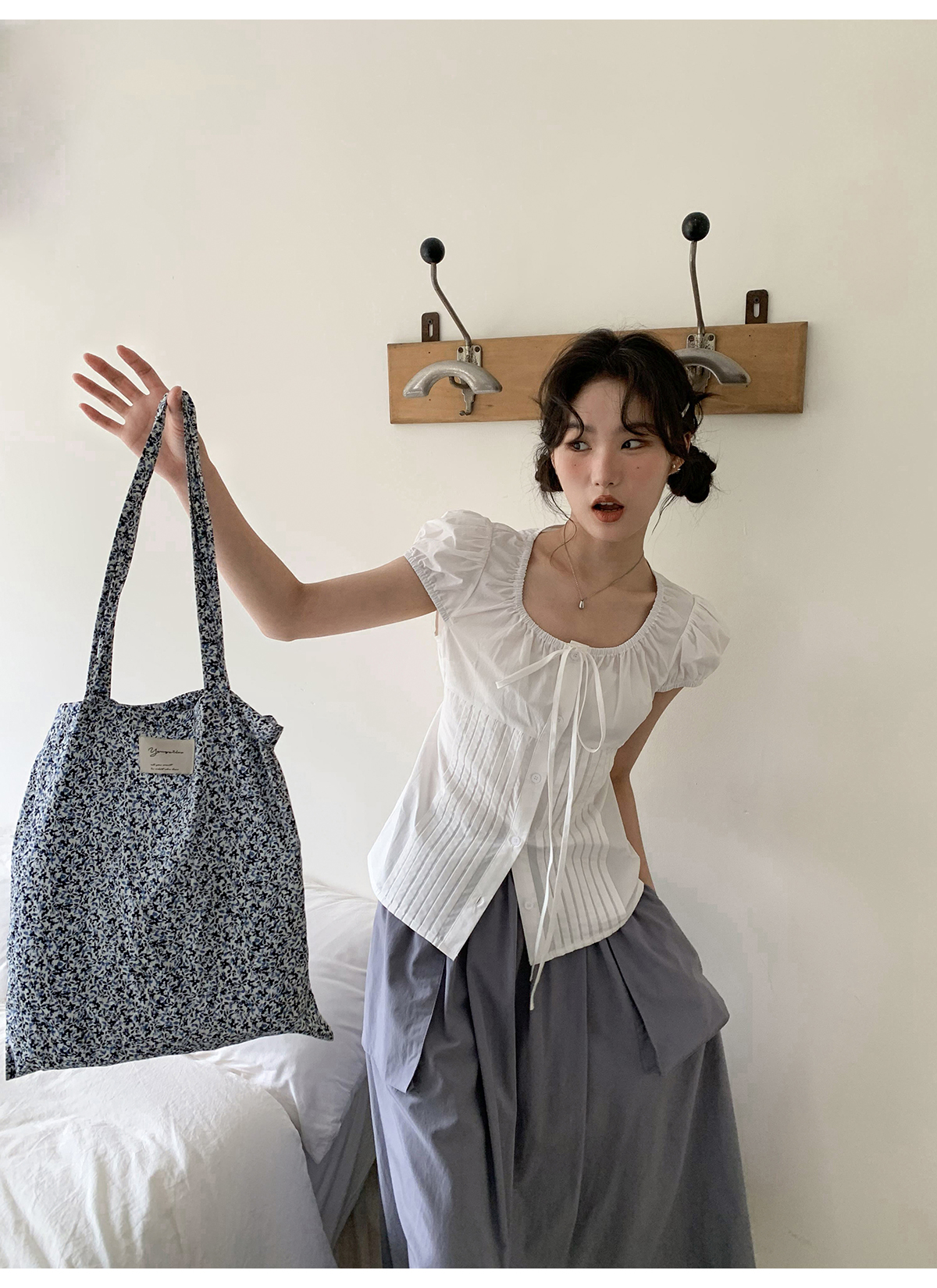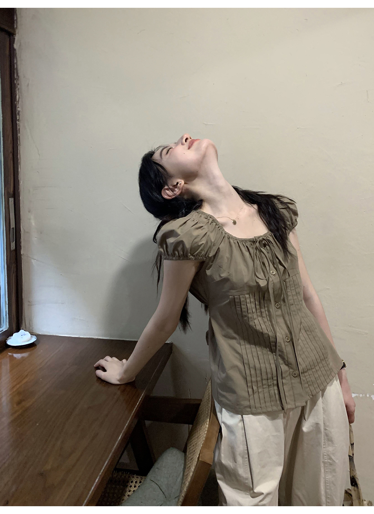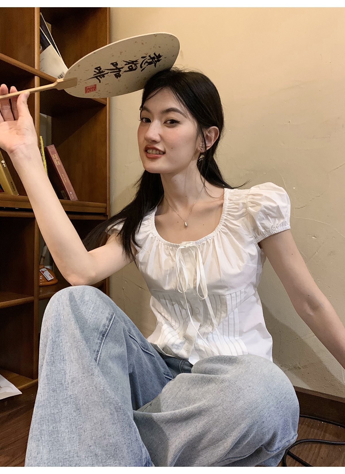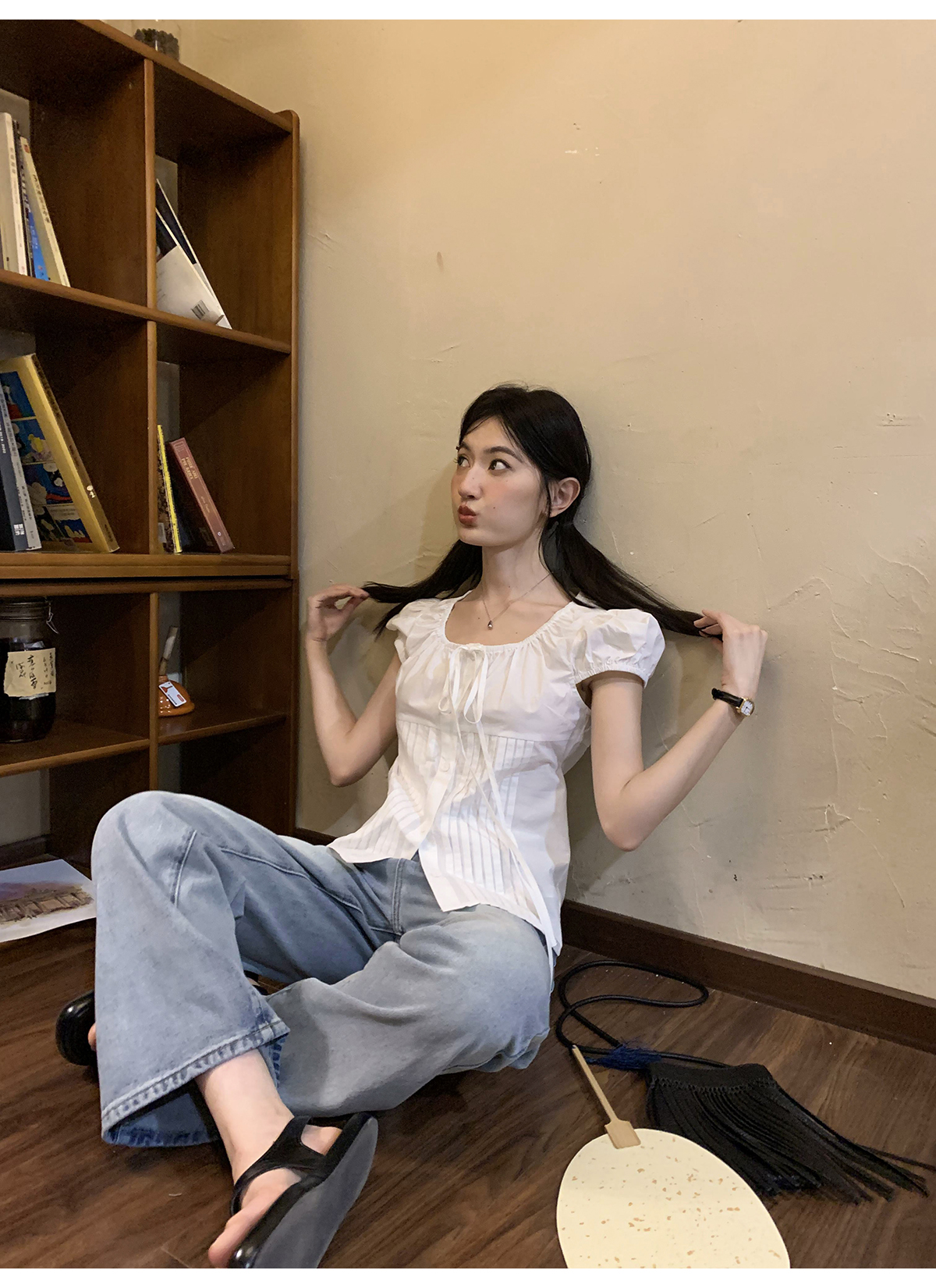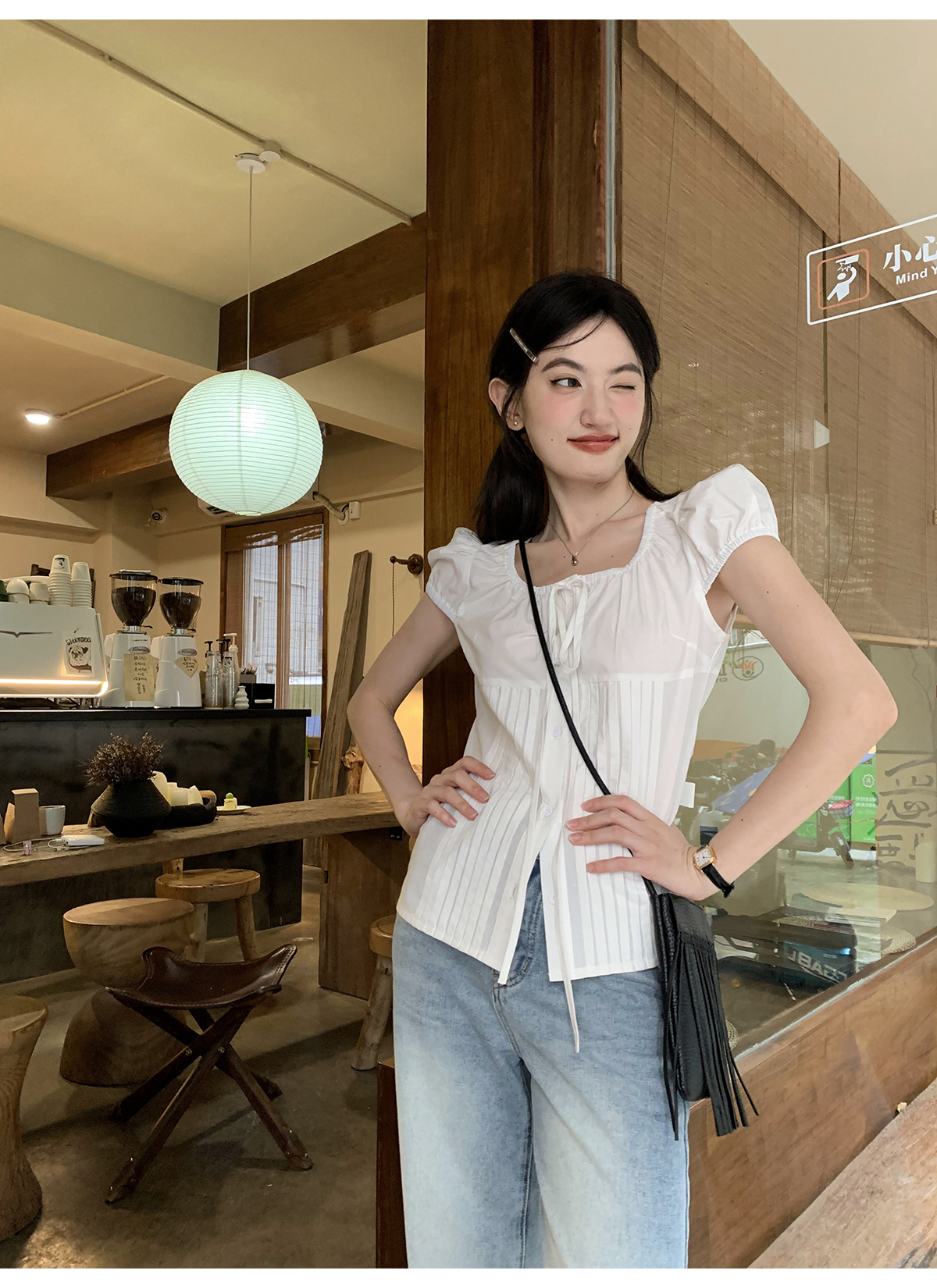 你好卡農 繫帶單排扣泡泡袖短袖上衣夏季薄款寬鬆顯瘦小個子襯衫
