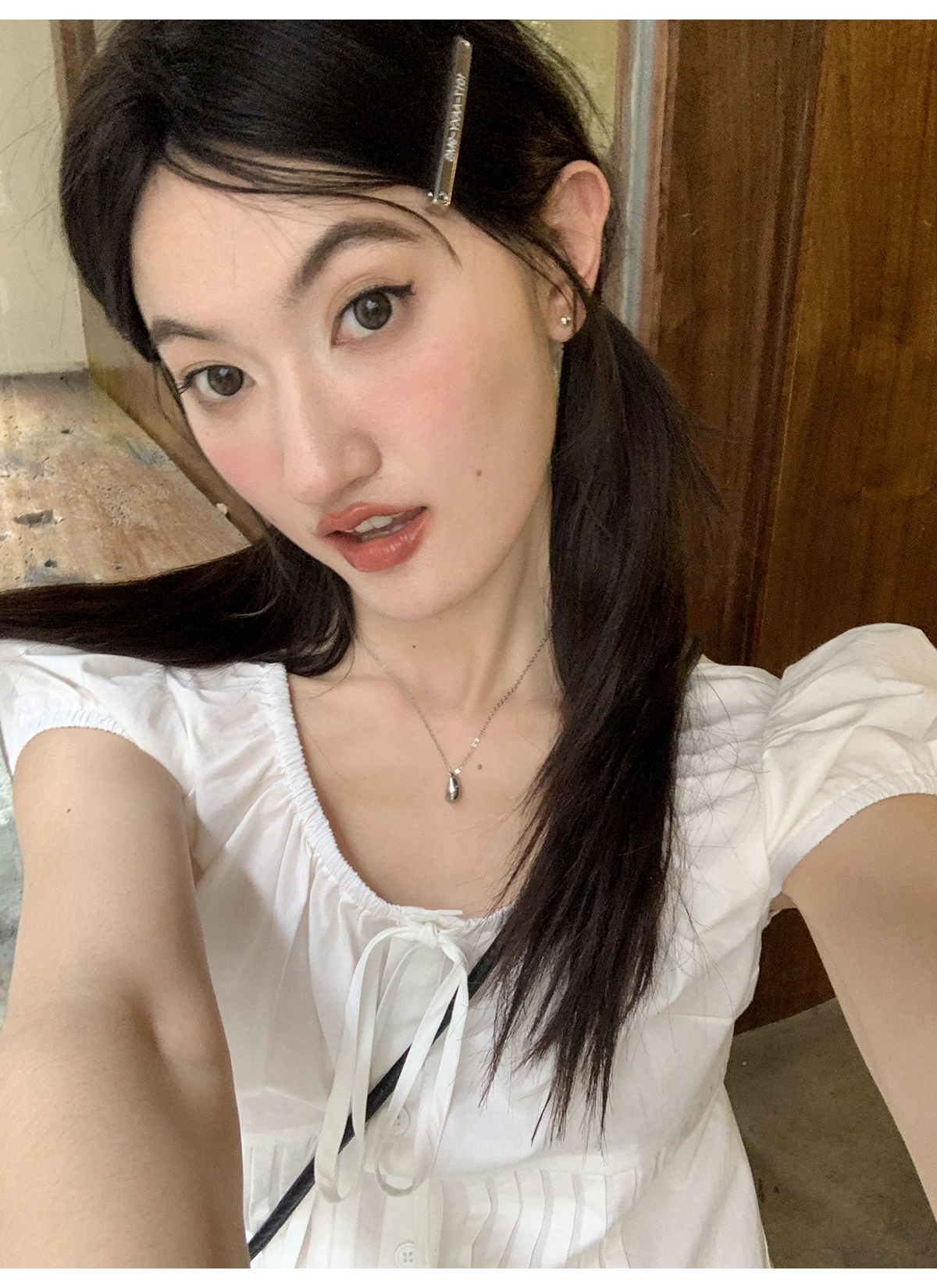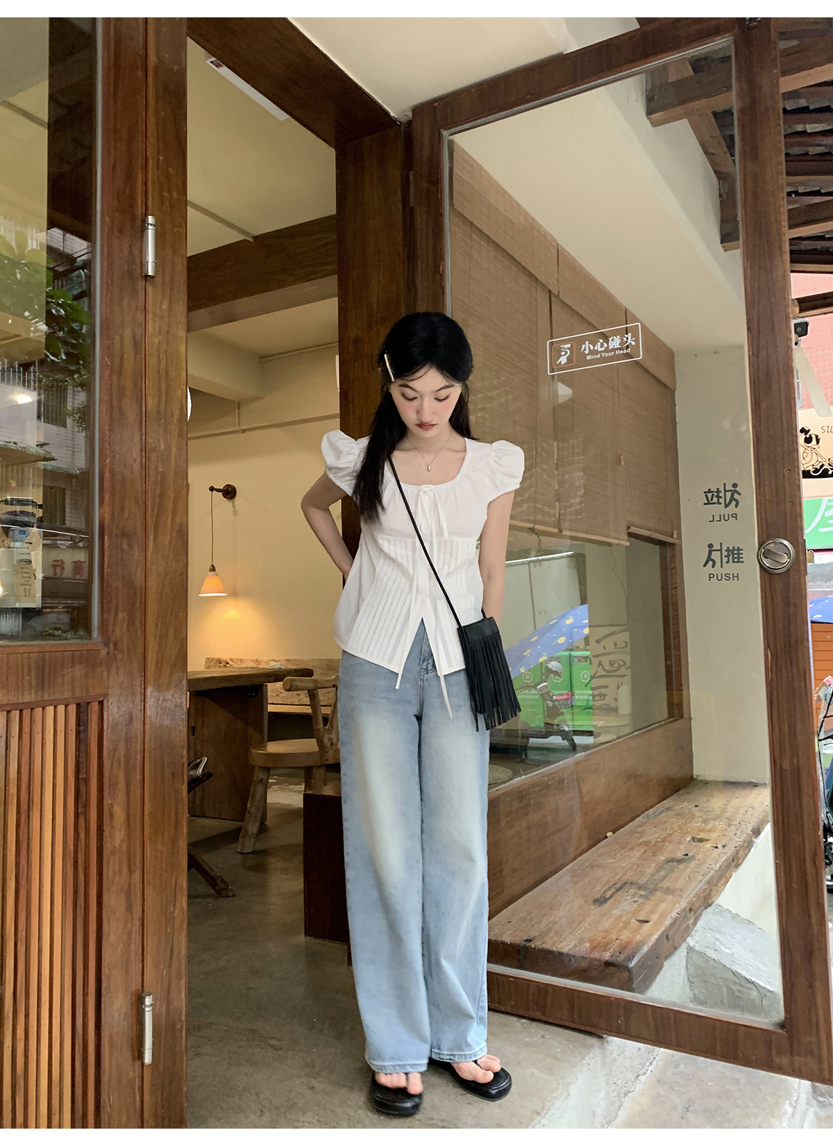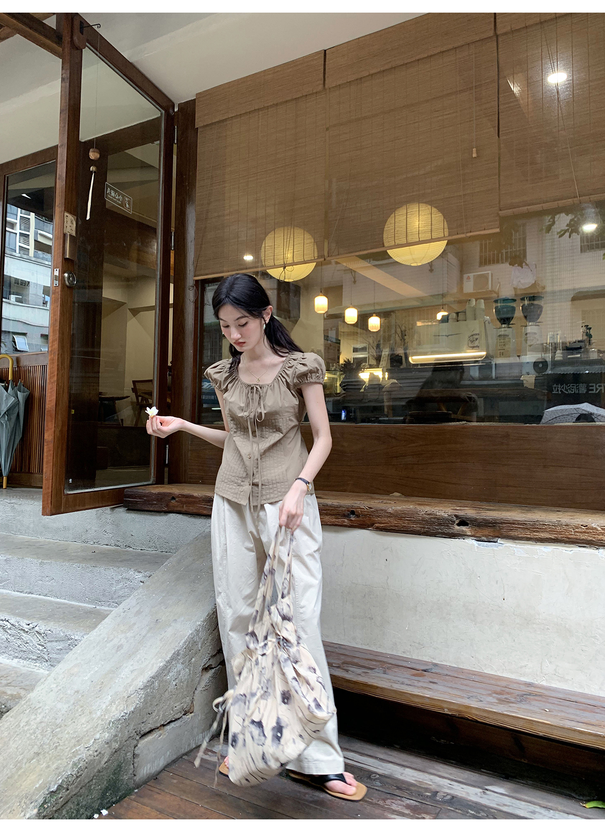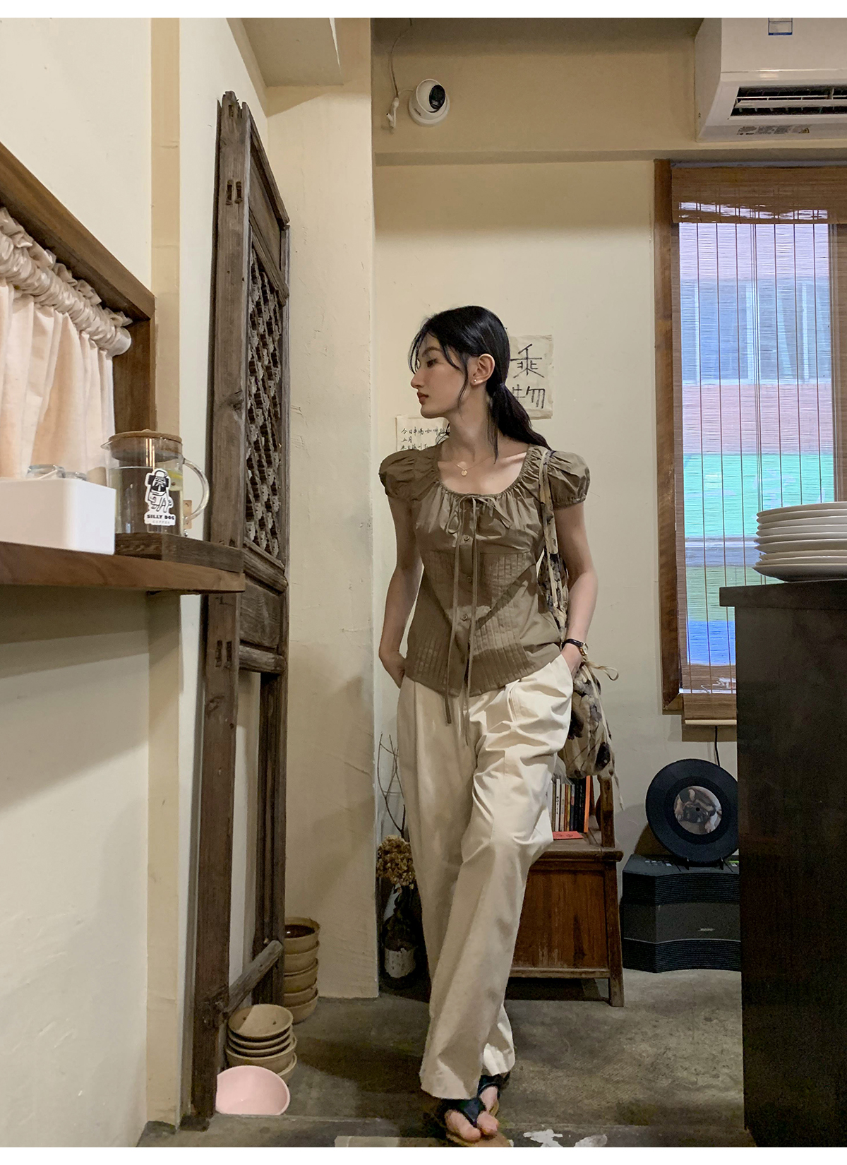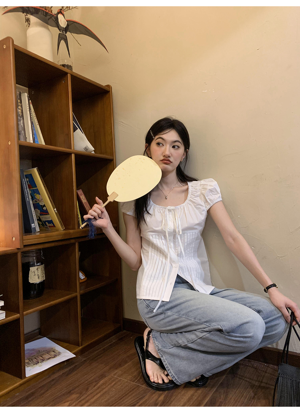 你好卡農 繫帶單排扣泡泡袖短袖上衣夏季薄款寬鬆顯瘦小個子襯衫