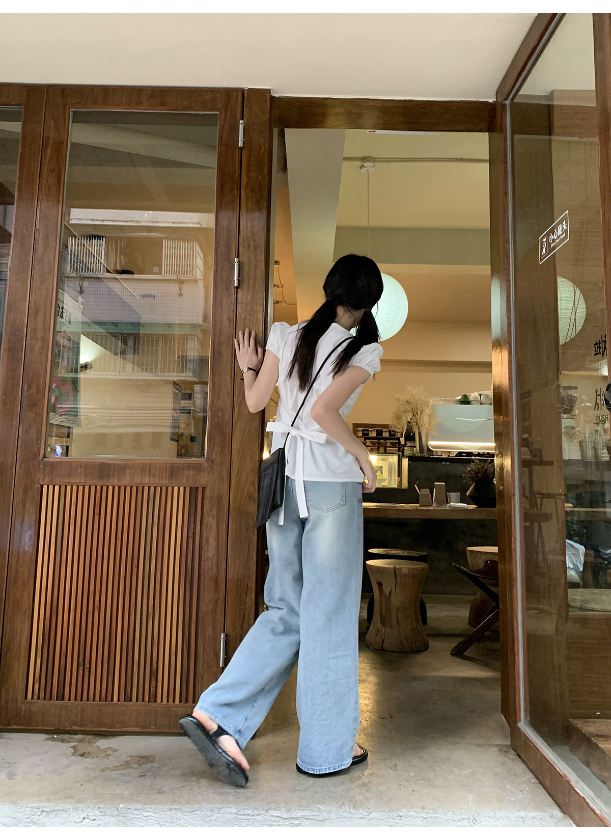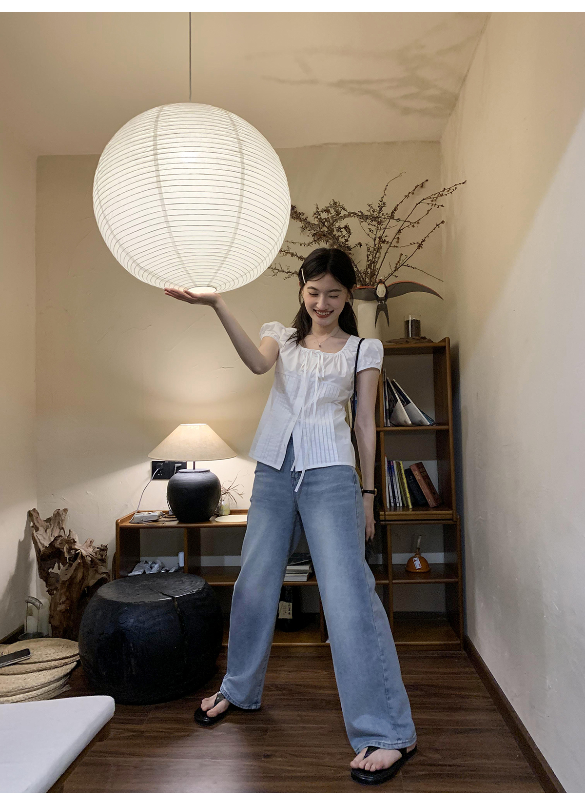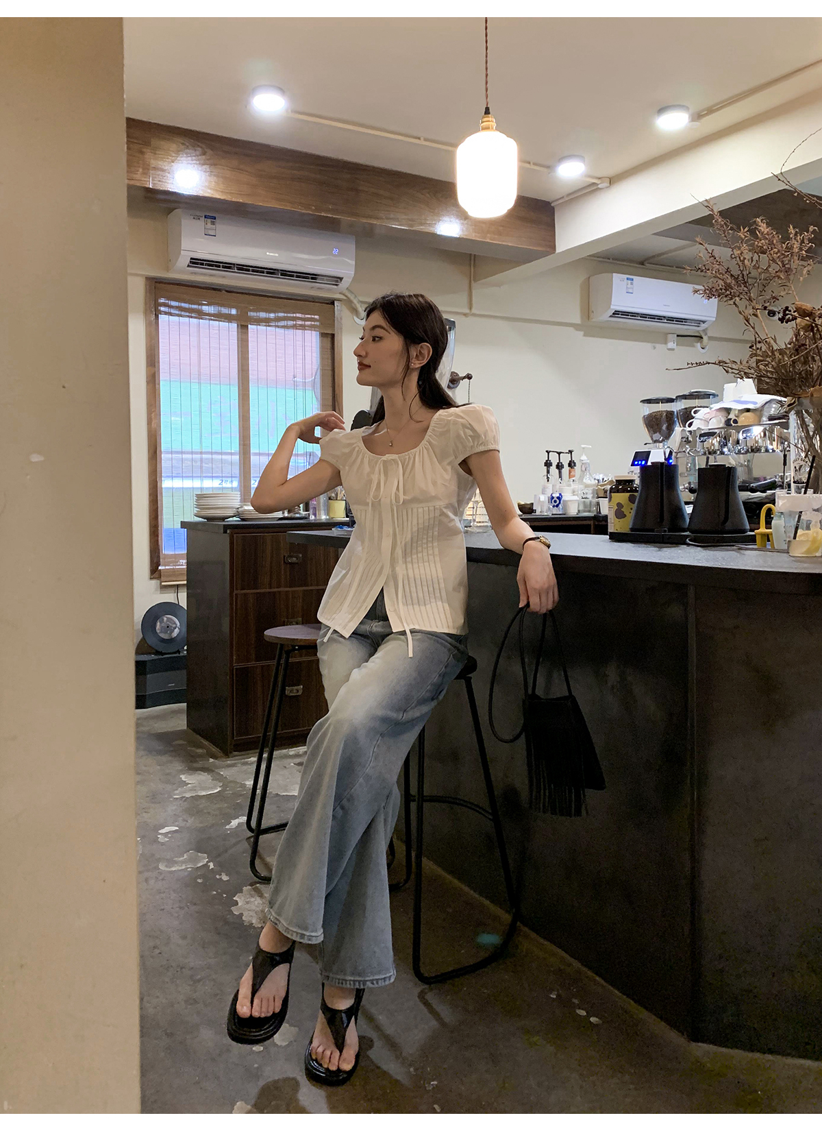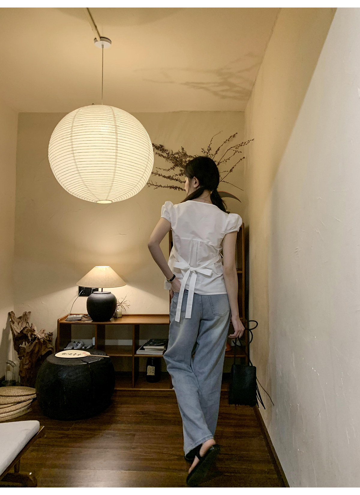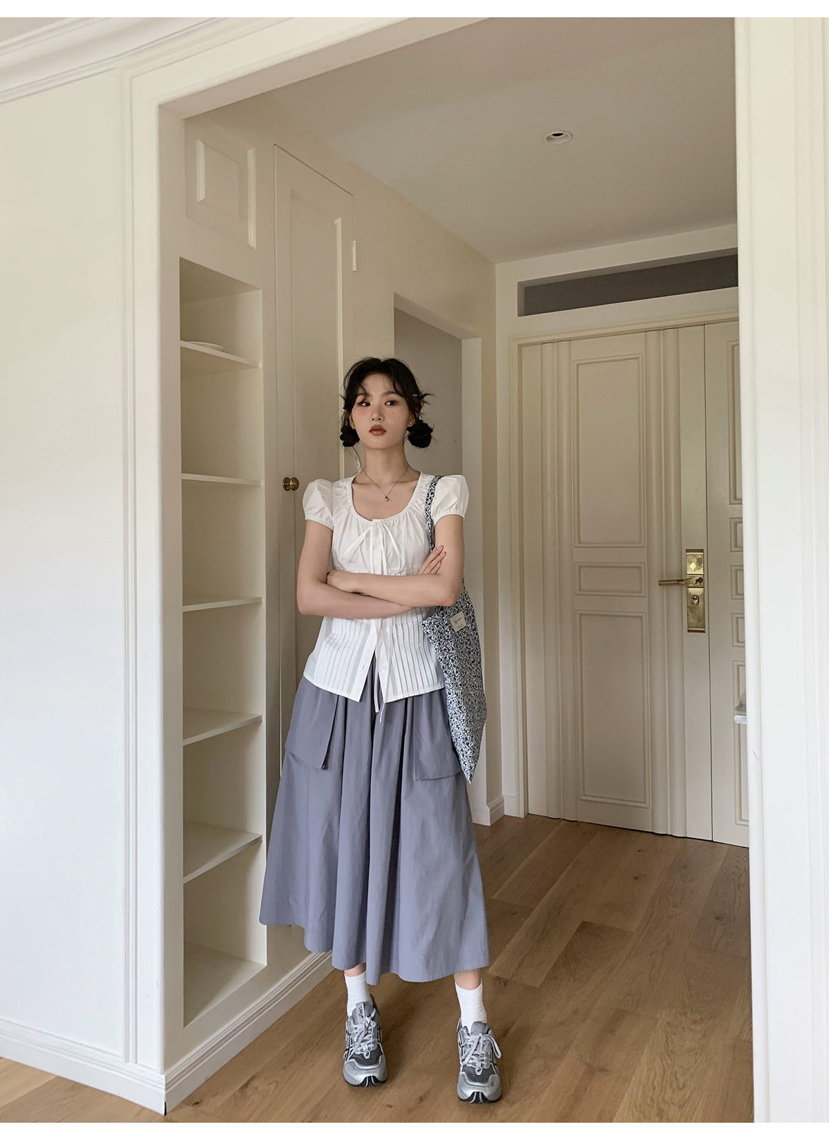 你好卡農 繫帶單排扣泡泡袖短袖上衣夏季薄款寬鬆顯瘦小個子襯衫
