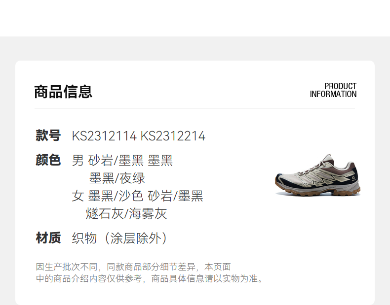 顏色分類 KS2312114 男 砂巖/墨黑遠徵3,KS2312114 男 墨黑遠徵3,KS2312114 男 月白/天青/赤紅遠徵3,KS2312214 女 墨黑/沙色遠徵3,KS2312214 女 砂巖/墨黑遠徵3,KS2312214 女 燧石灰/海霧灰遠徵3,KS2312338墨黑男遠徵2,KS2312338月亮灰/月石色男遠徵2,KS2312338鋼鐵灰/墨黑男遠徵2,KS2312438古巴沙色/漂白女遠徵2,KS2312438墨黑女遠徵2