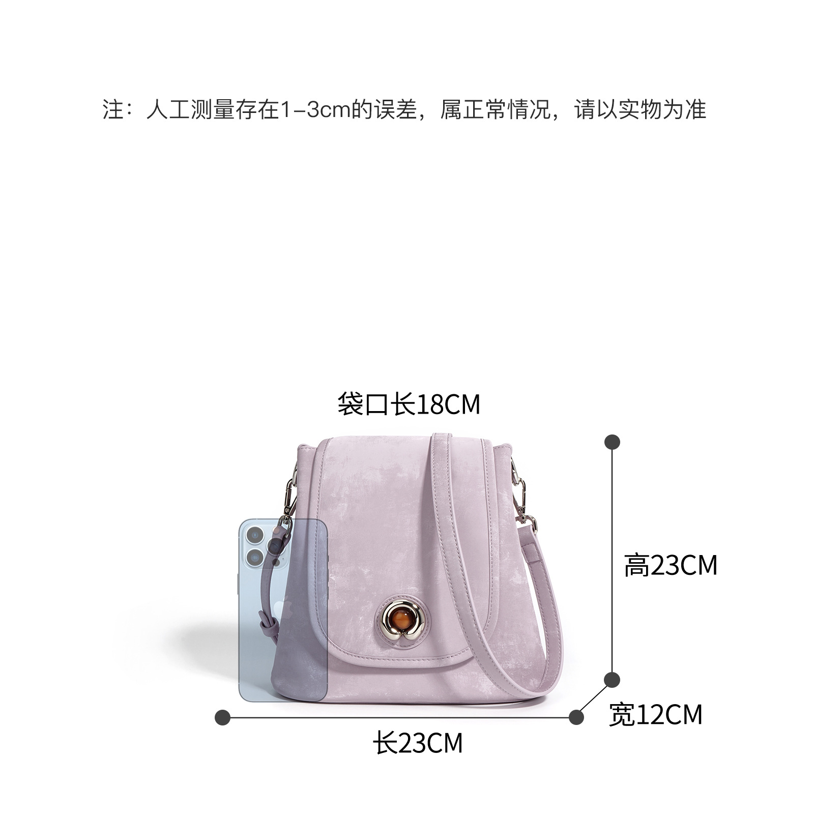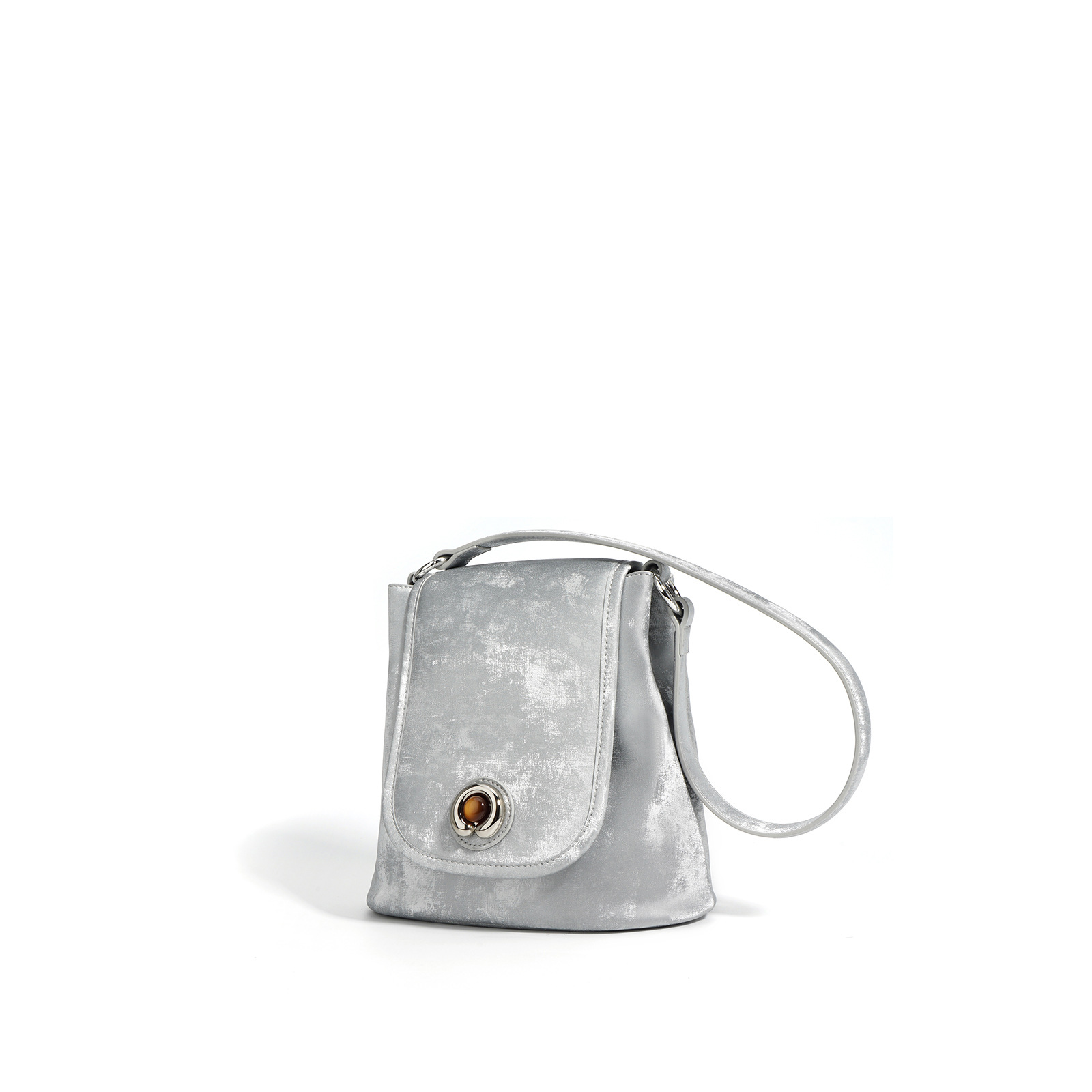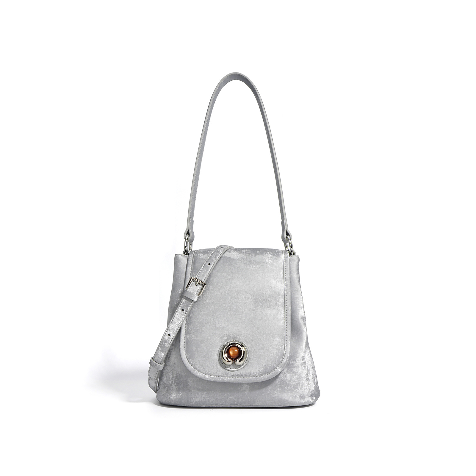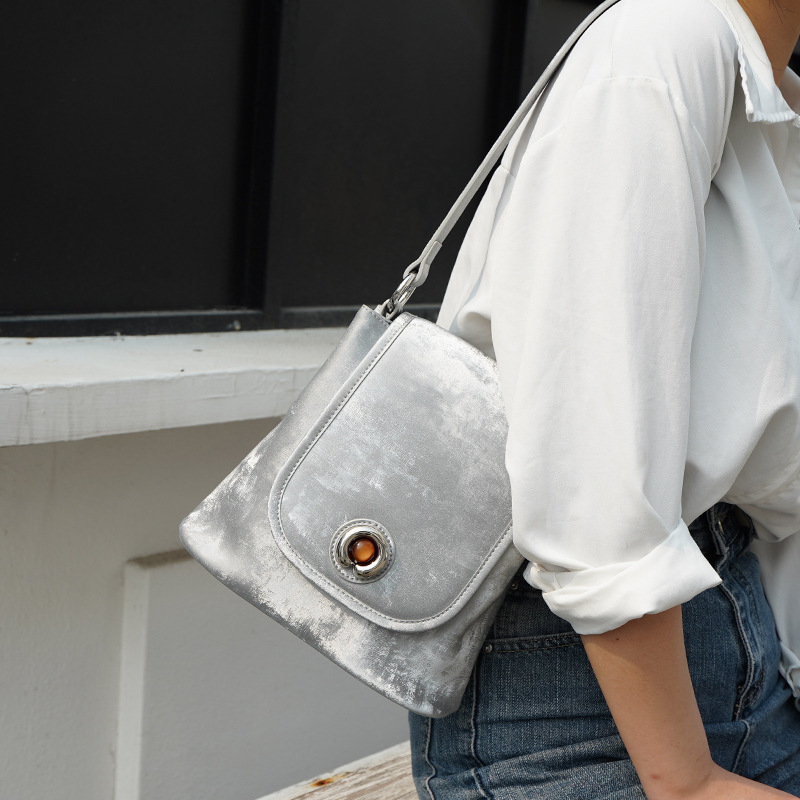 新中式绸缎牛皮翻盖水桶包质感真皮斜挎流行包包小众腋下包