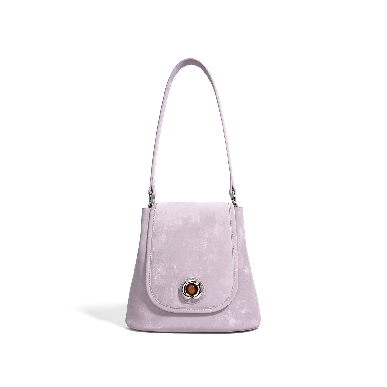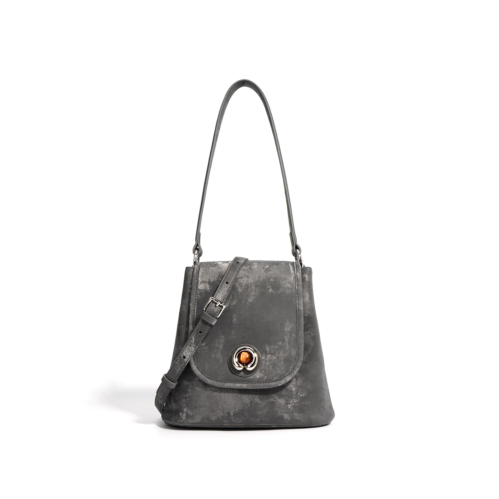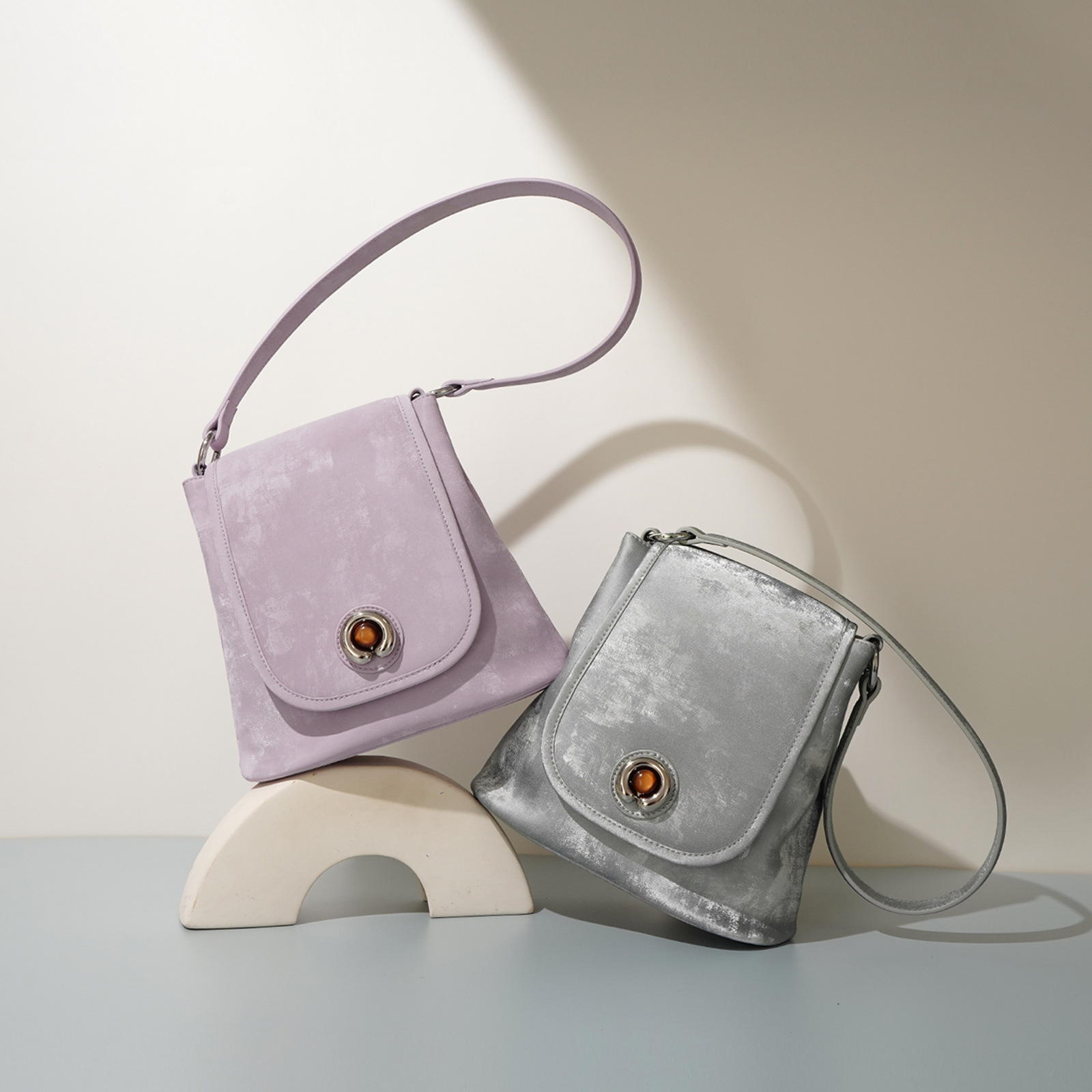 新中式绸缎牛皮翻盖水桶包质感真皮斜挎流行包包小众腋下包