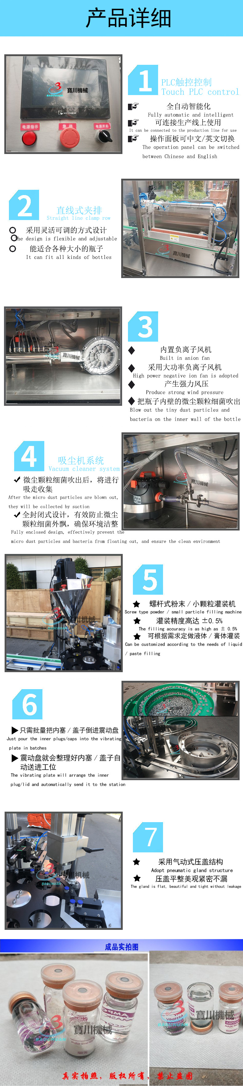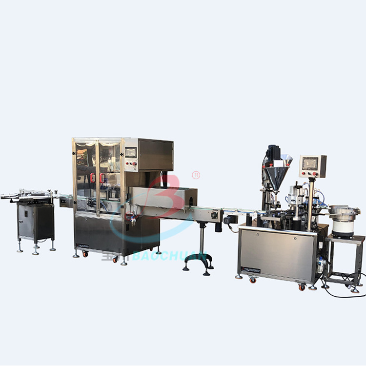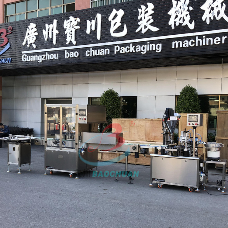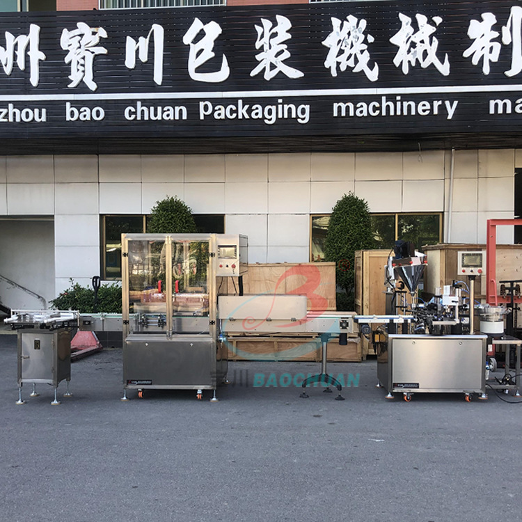 本机主要适用于各种小剂量灌装、压塞、轧(旋)盖如液体、粉剂、精油,广泛用于医药、化工、试剂机科研领域。盖机可以单机使用,也可跟洗瓶机隧道式烘箱;贴标机等设备组成生产线使用。采用不锈钢制作完全符合国家要求。可根据产量要求做成多头灌装轧(旋)盖设备。