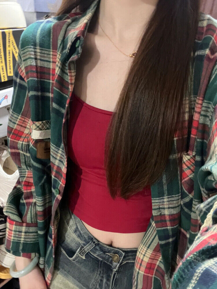 清倉撤櫃外貿日系復古港風格子襯衫女夏季設計感小眾辣妹小吊帶潮