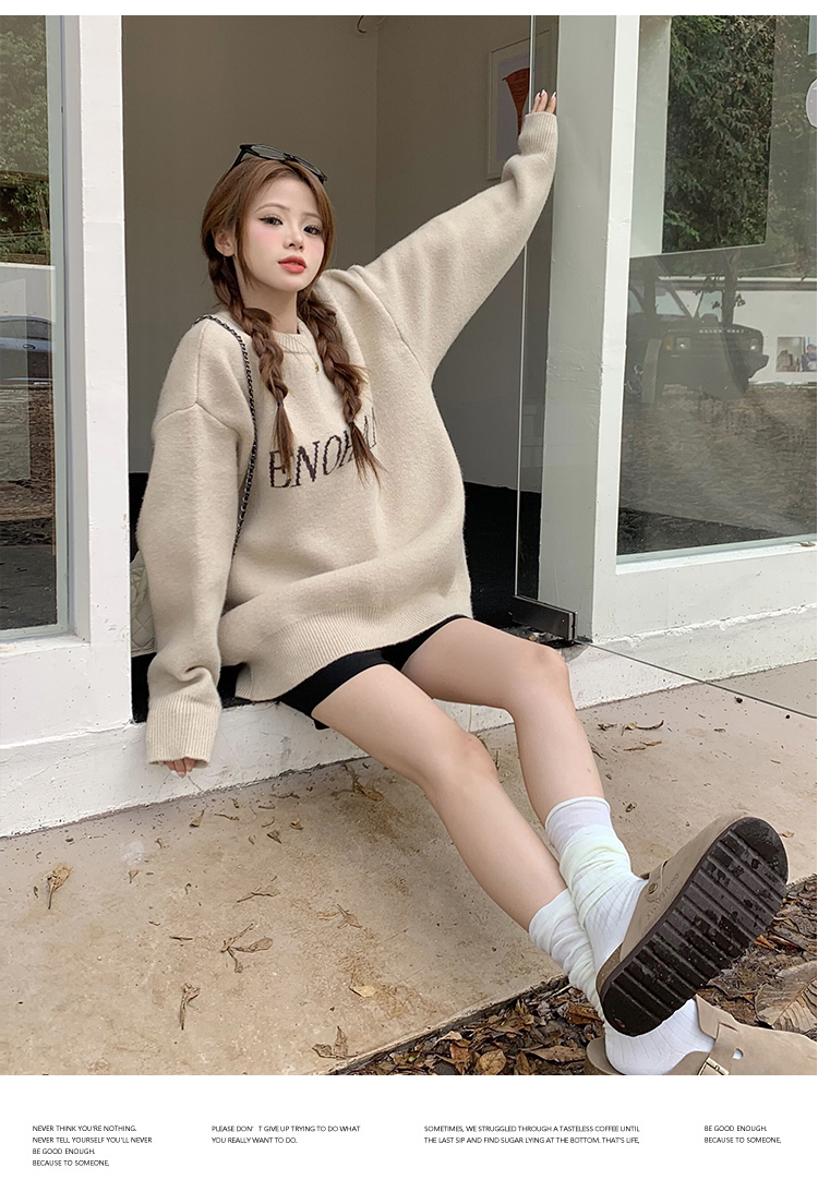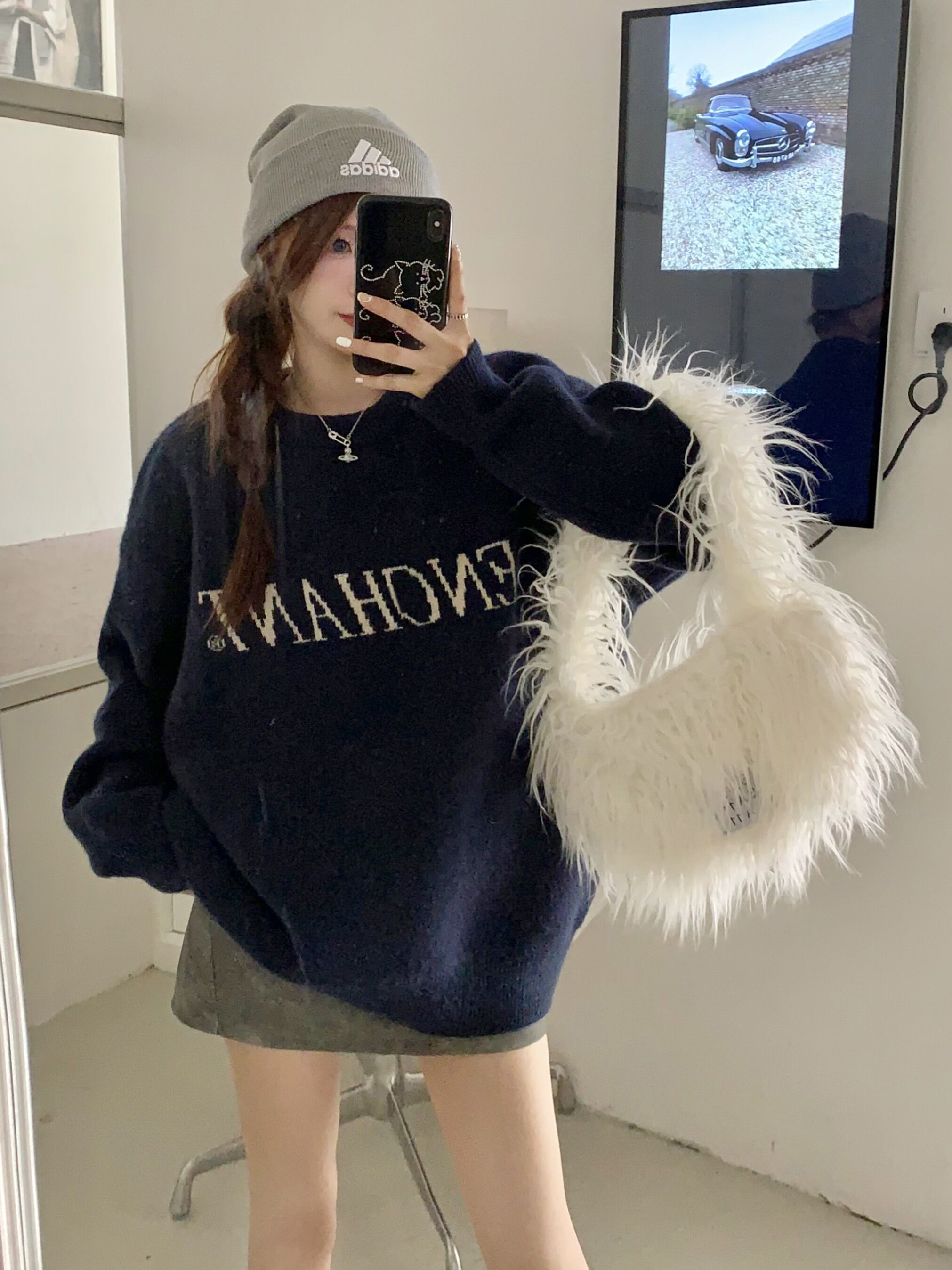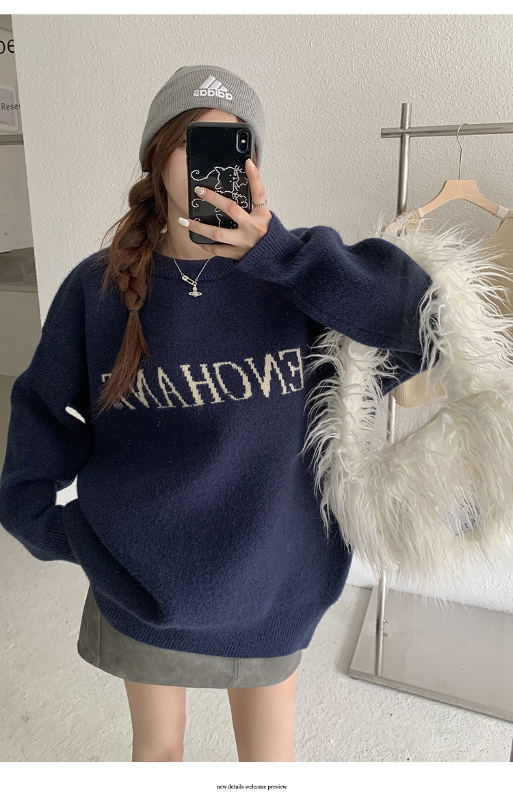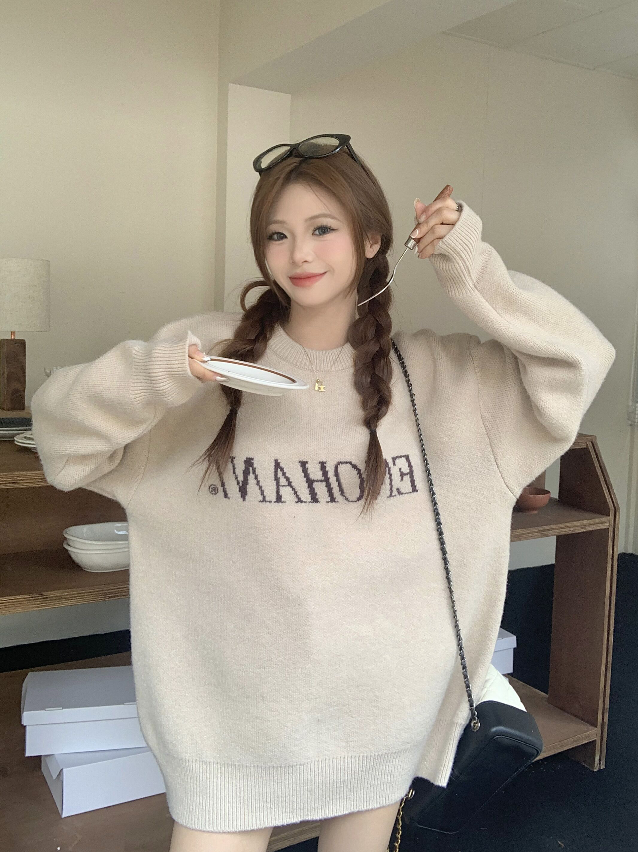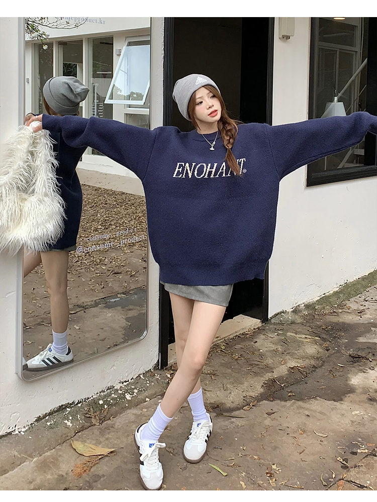 kumikumi慵懶風軟糯字母毛衣女秋季寬鬆套頭針織衫長袖情侶裝上衣