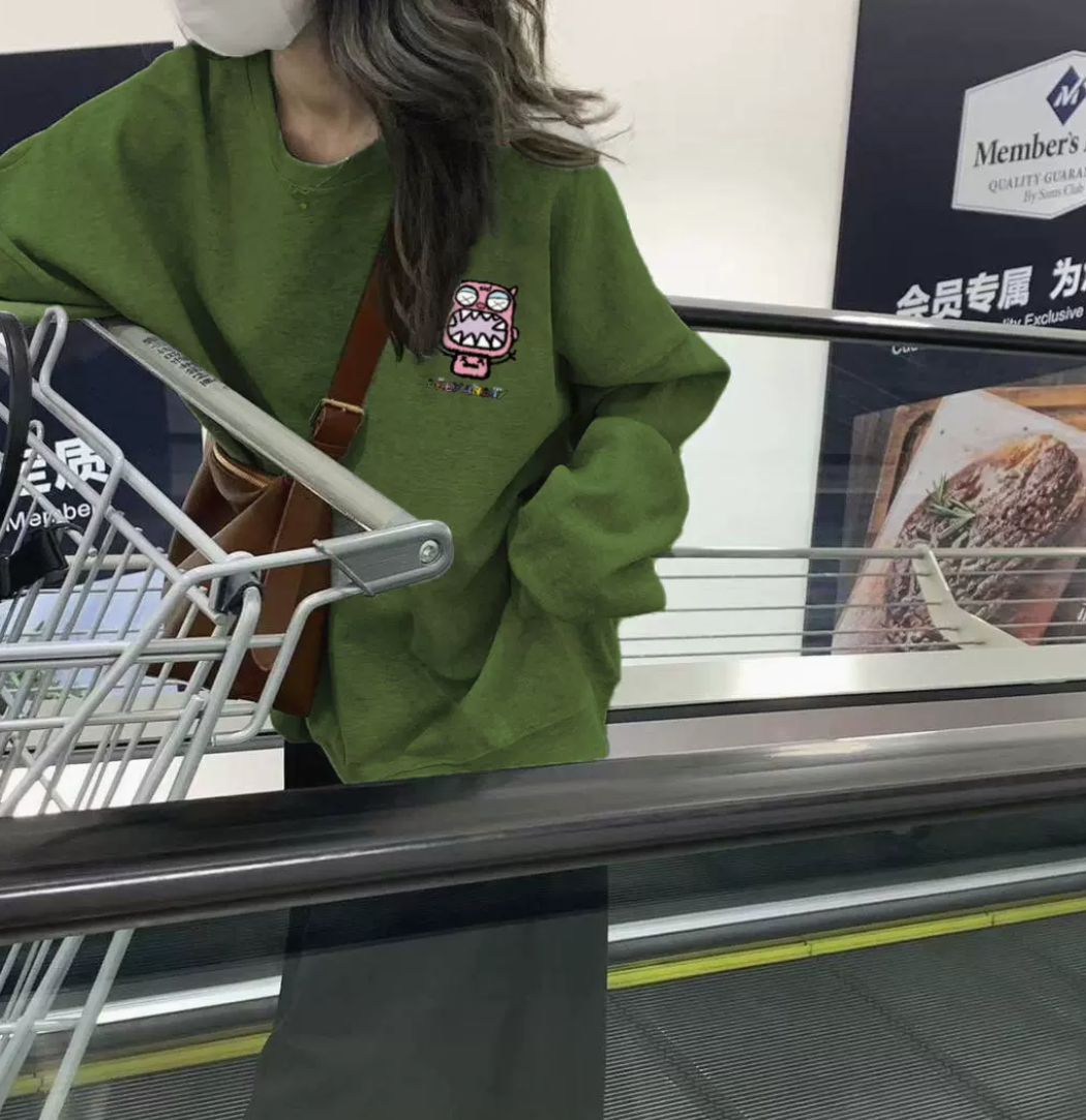 一萬個推薦!慵懶風軟糯套頭休閒上衣女高級感綠色卡通印花上衣外套潮