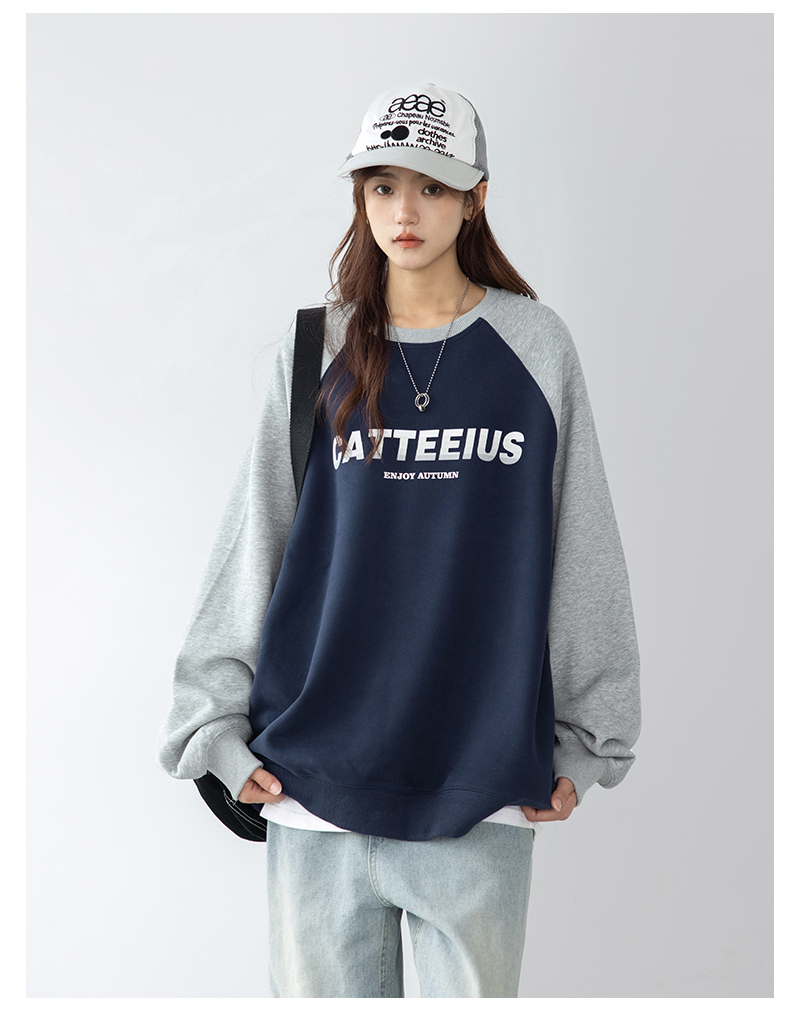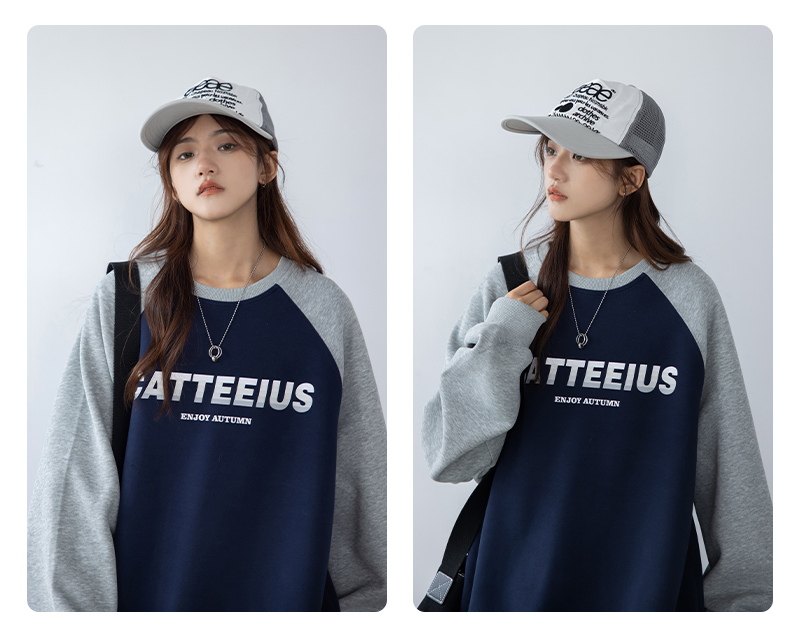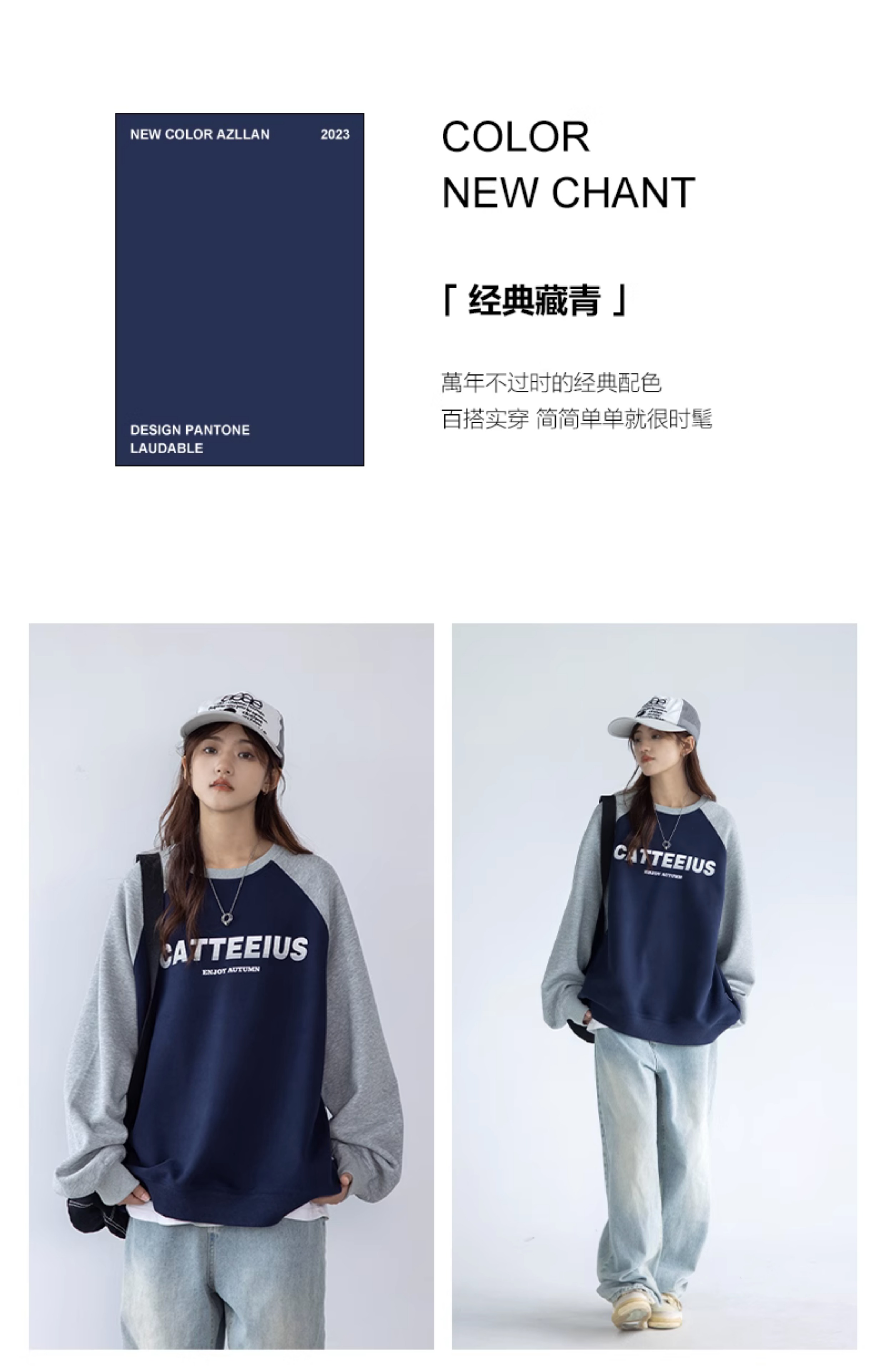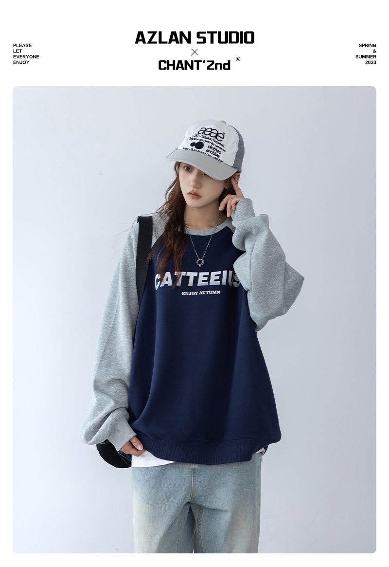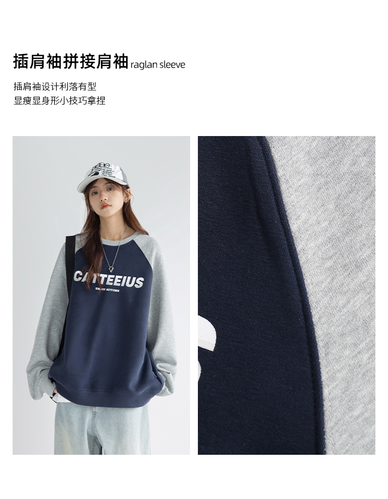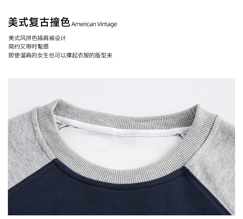 AzLan380G重磅美式復古衛衣女小個子圓領寬鬆拼接插肩袖印花上衣