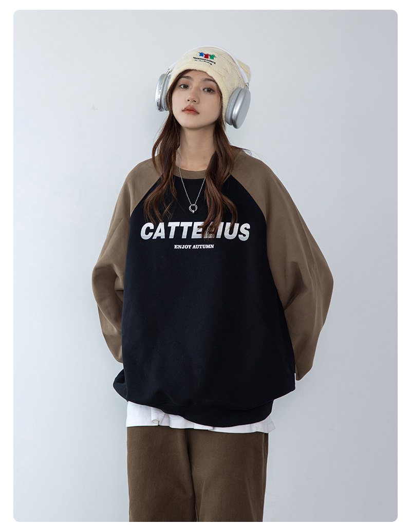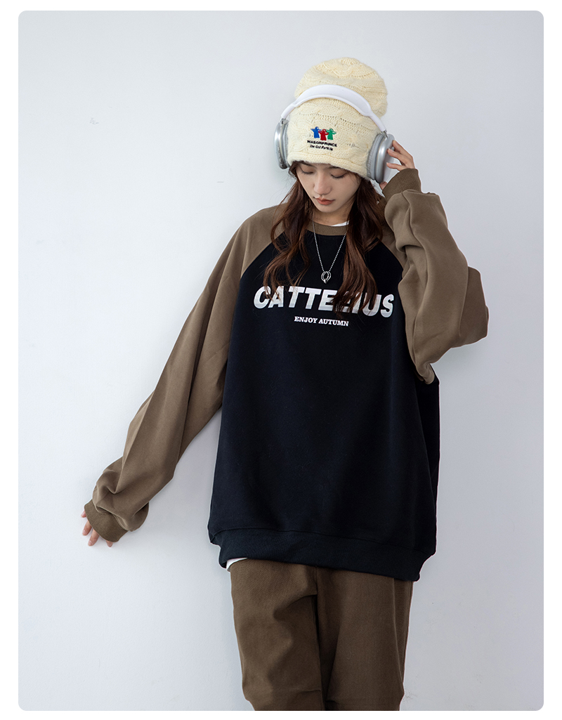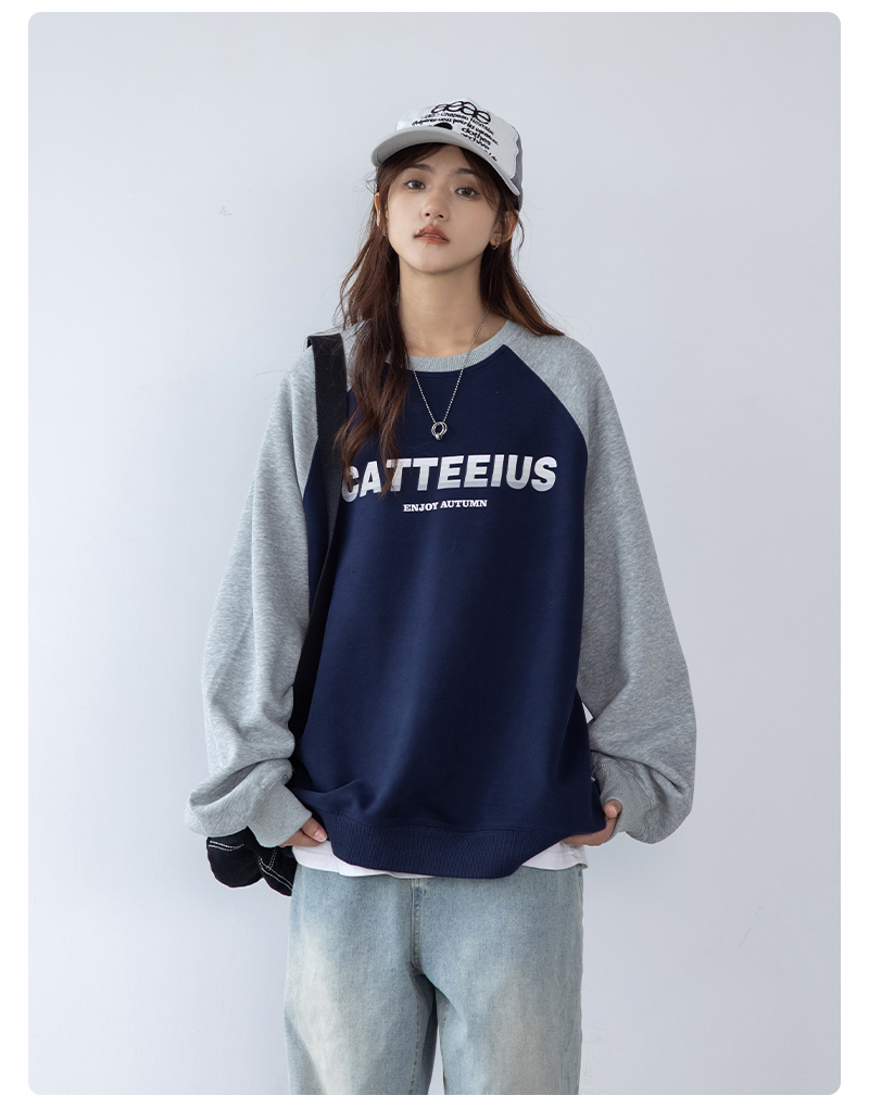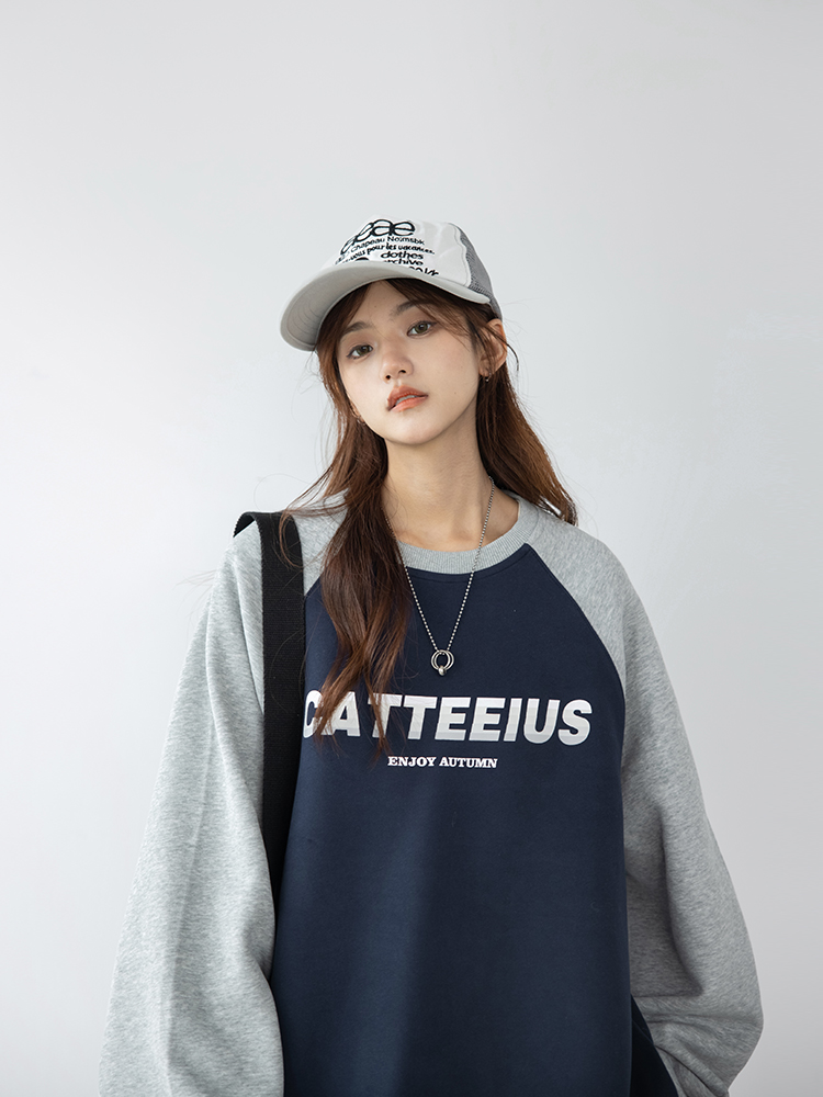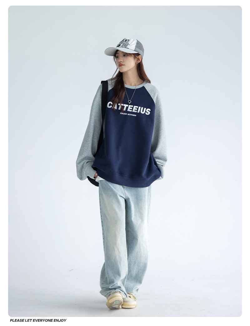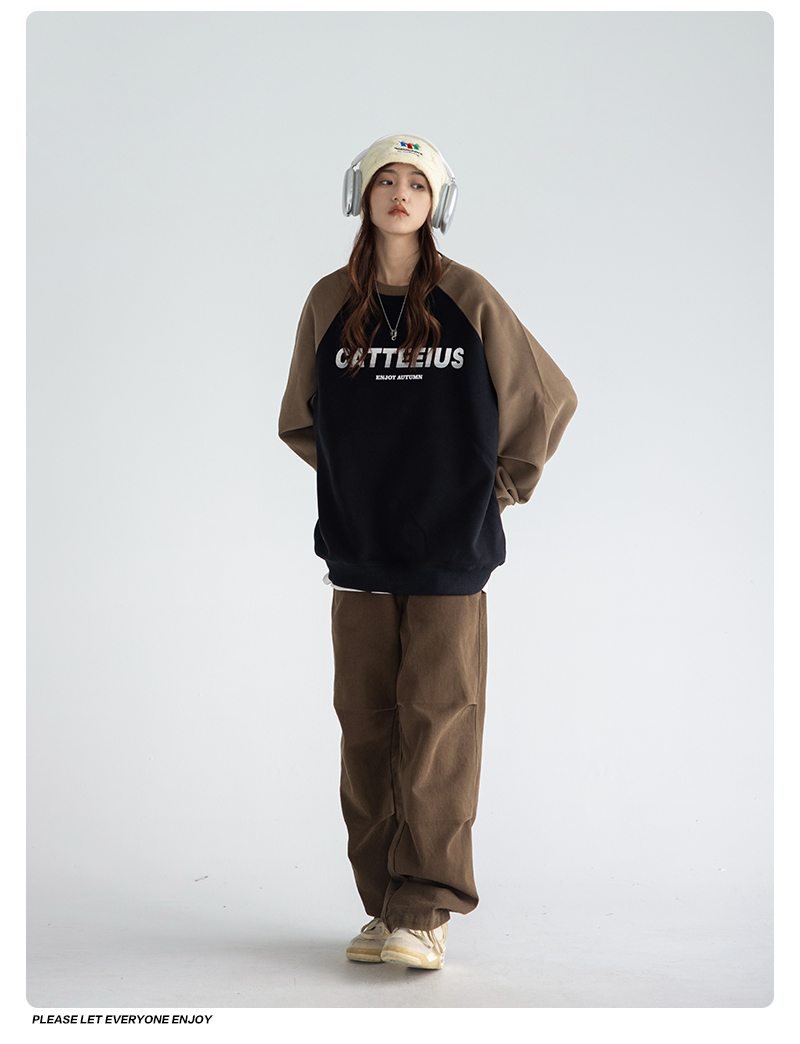 AzLan380G重磅美式復古衛衣女小個子圓領寬鬆拼接插肩袖印花上衣