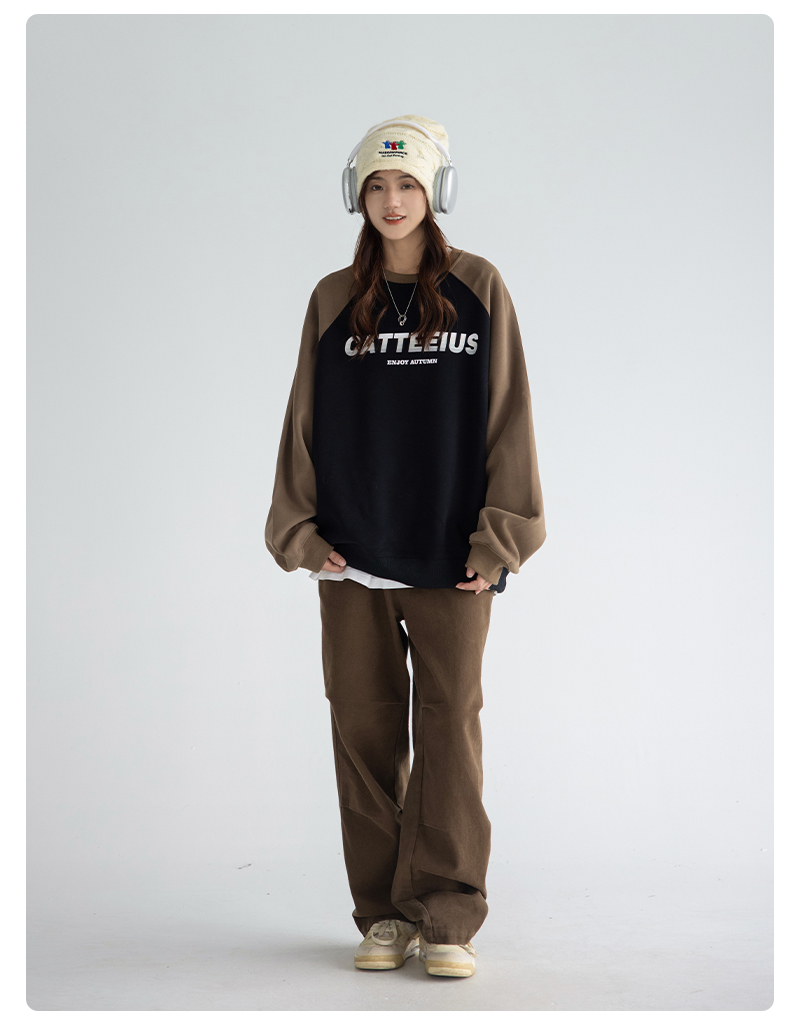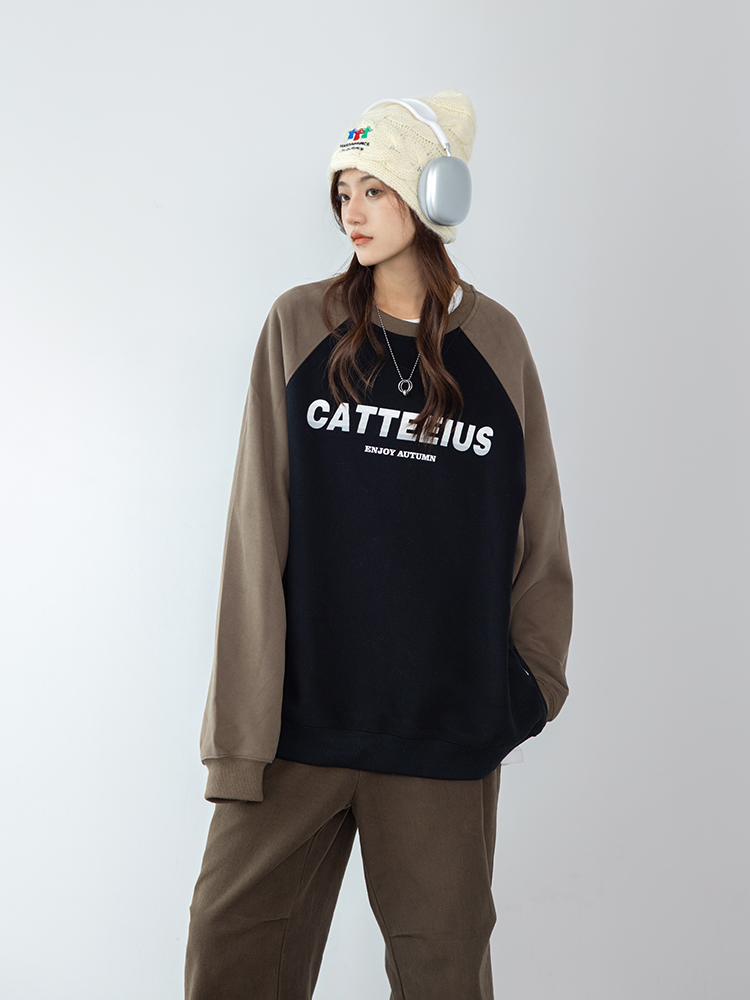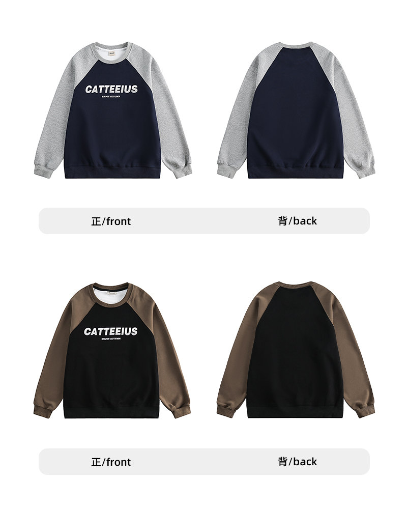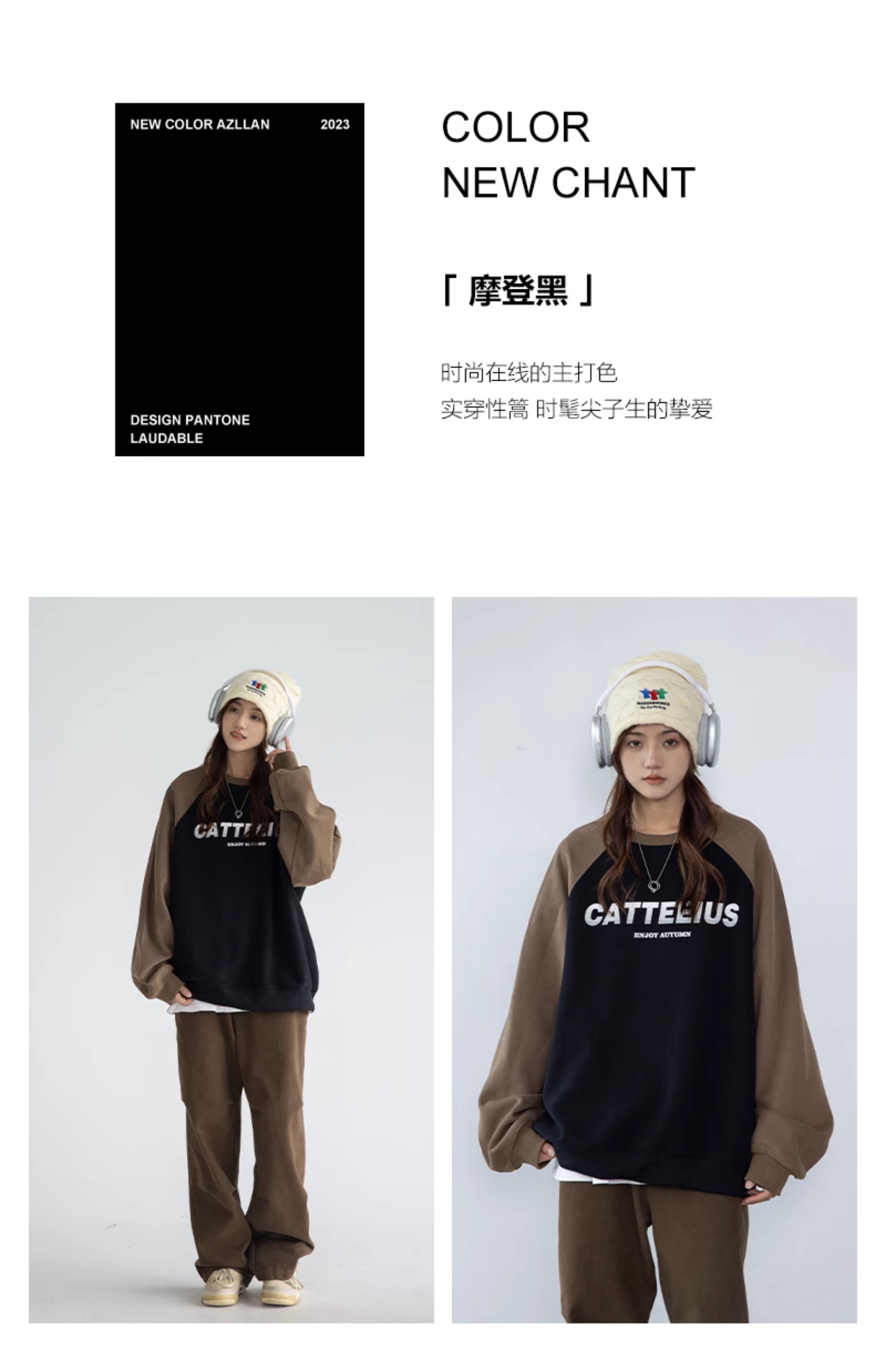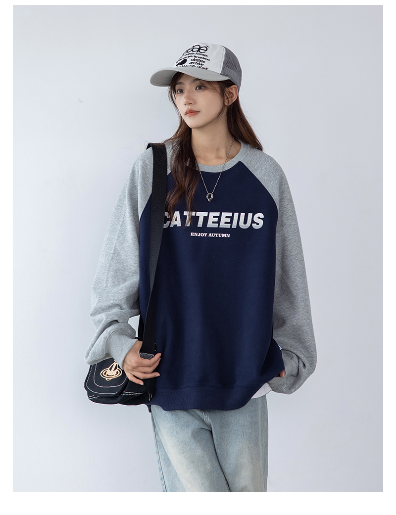 AzLan380G重磅美式復古衛衣女小個子圓領寬鬆拼接插肩袖印花上衣