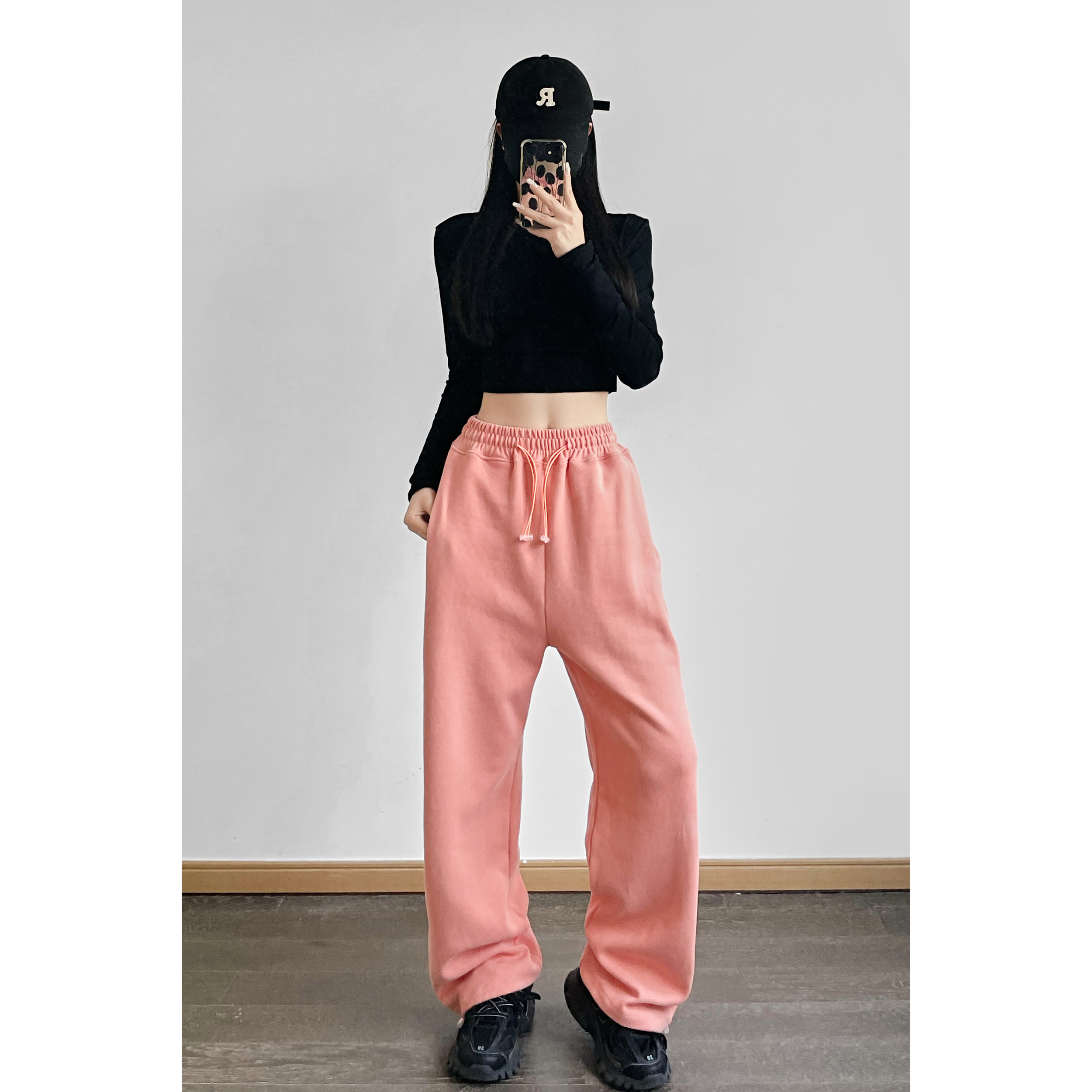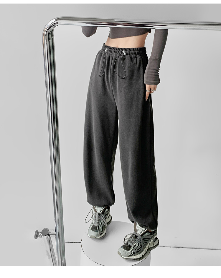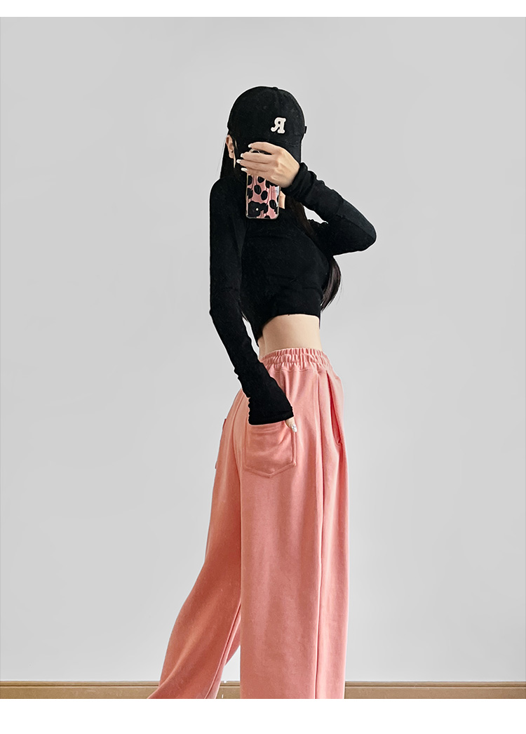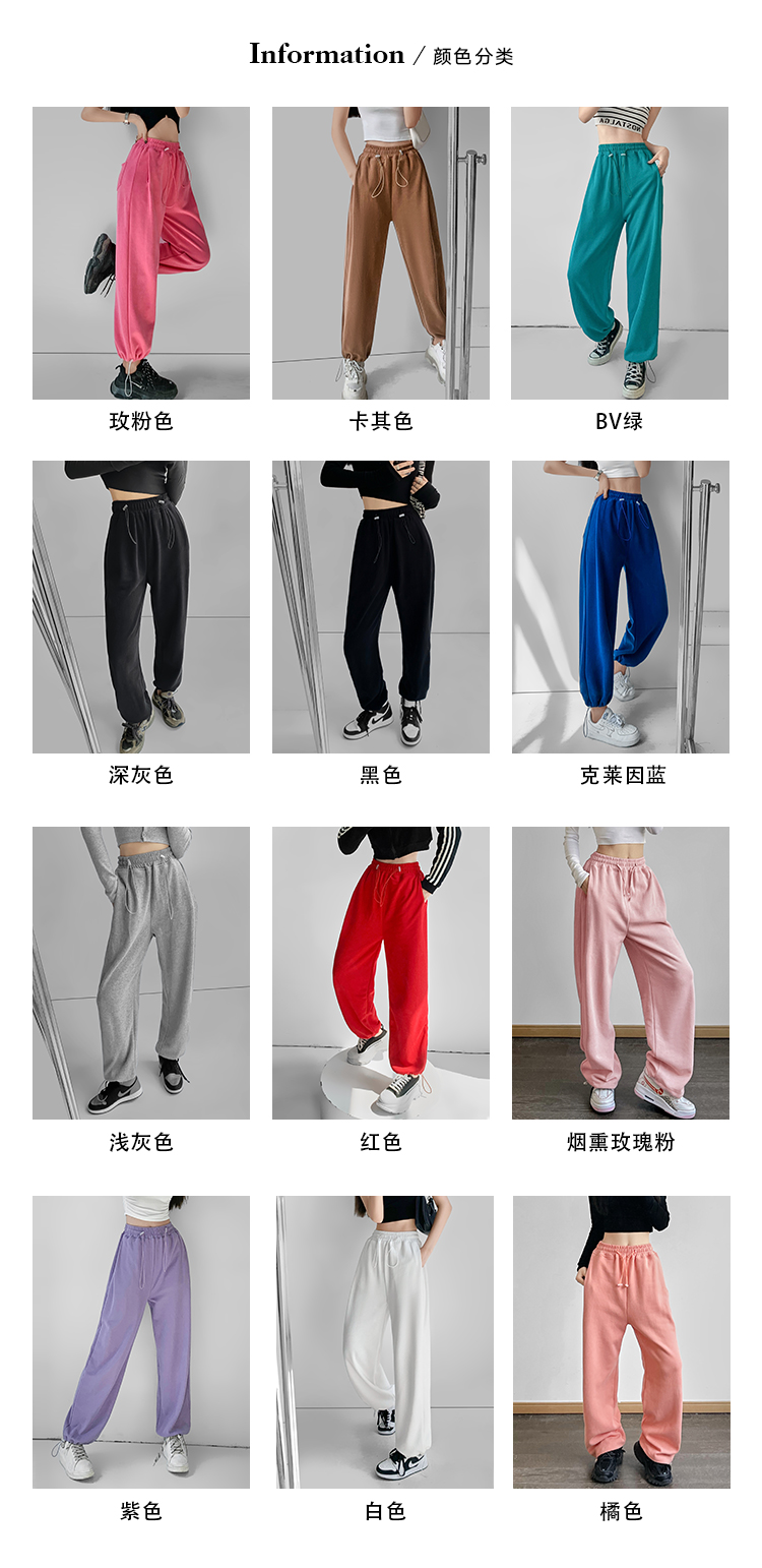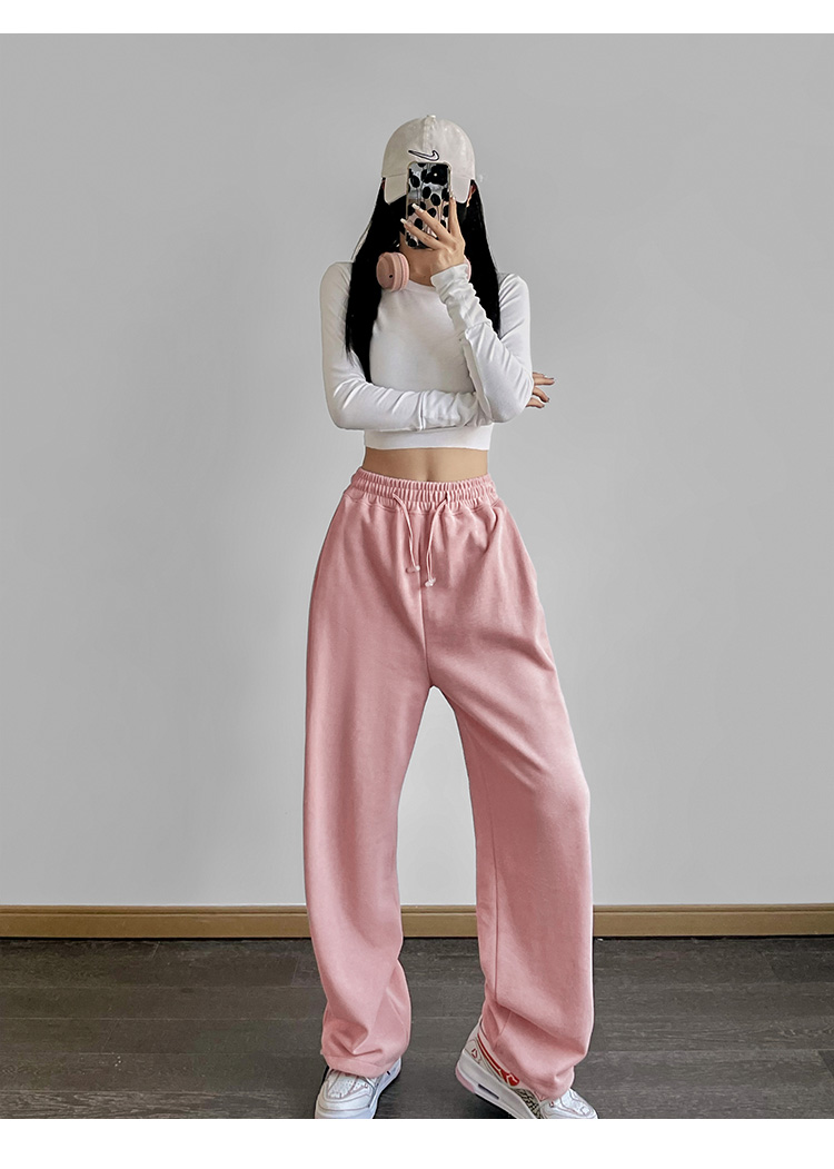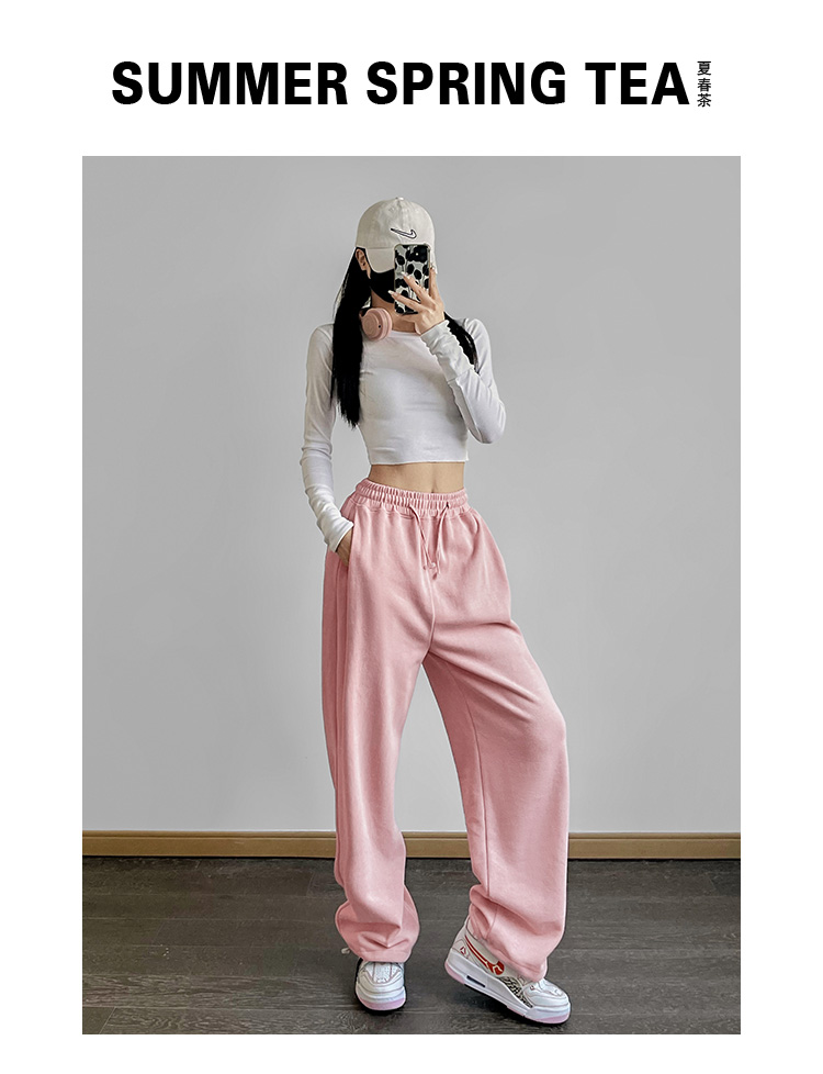 夏春茶粉色褲子女秋季辣妹闊腿褲女秋冬顯瘦鬆緊腰寬鬆休閒運動褲