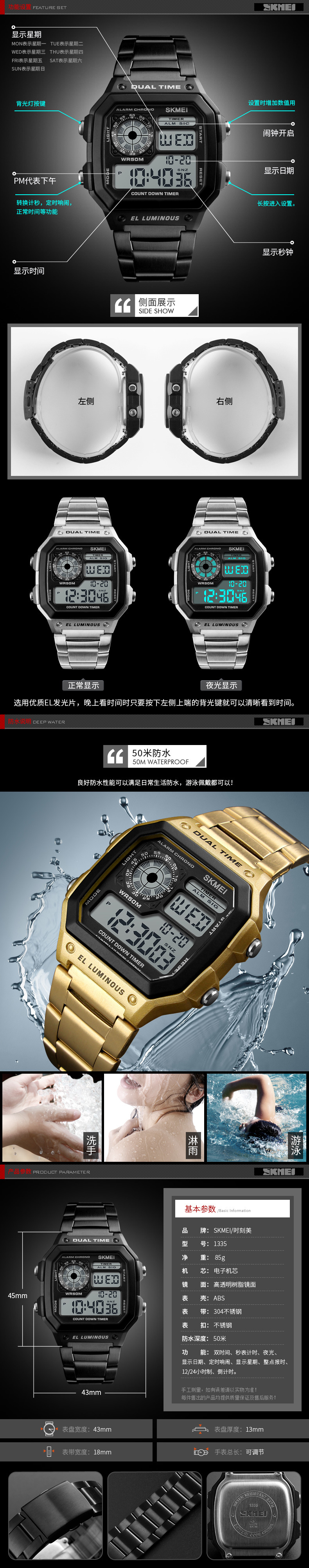 特殊功能 :双时间、秒表计时、夜光、显示日期、定时响闹、显示星期、整点报时12/24小时制、倒计时
