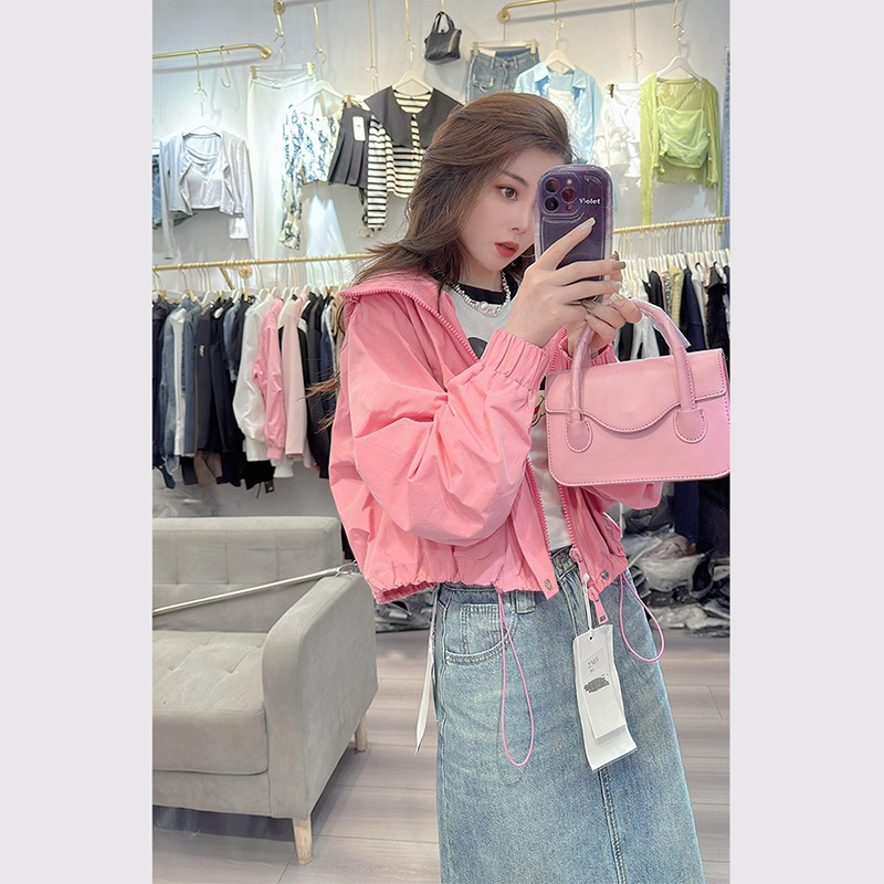 秋季百搭防曬衣衝鋒衣休閒小香風防曬服粉色短款外套2023新款女裝