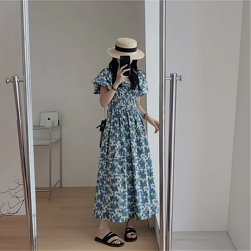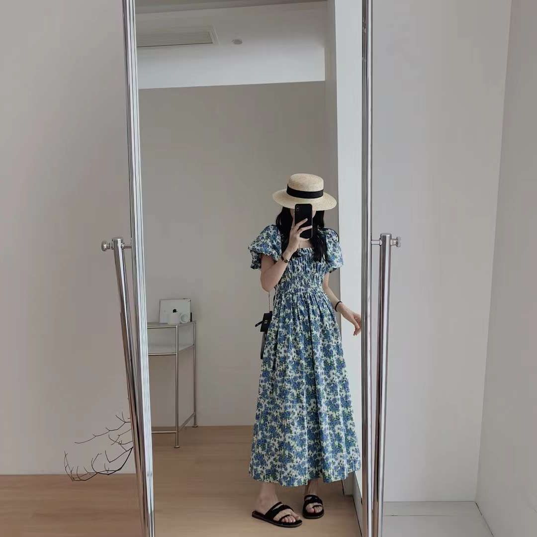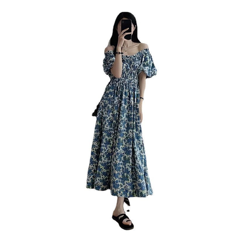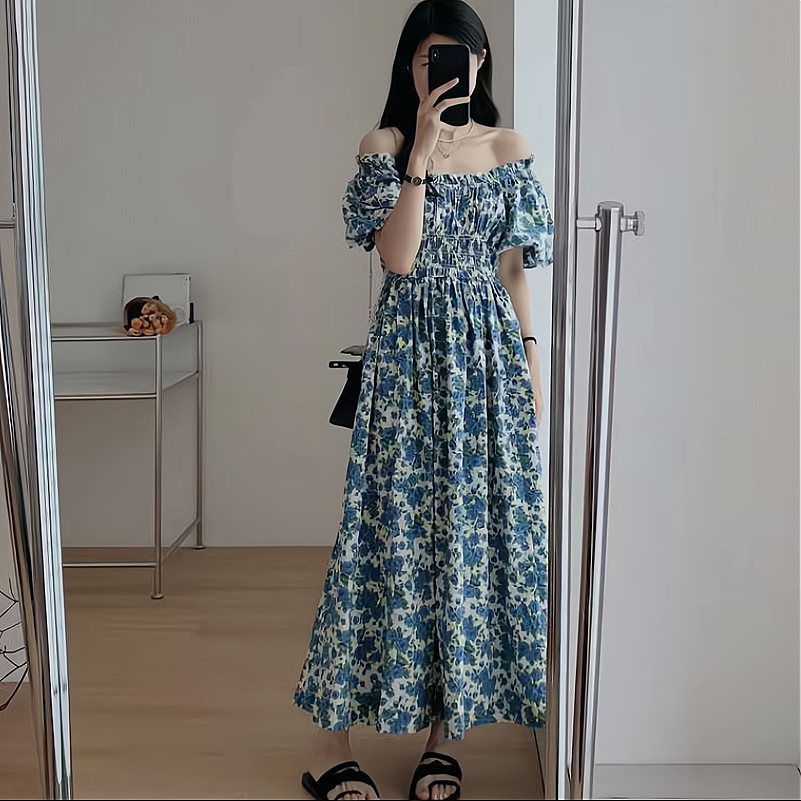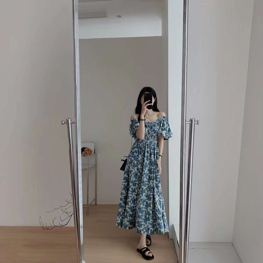 蓝色韩版宽松显瘦长裙一字肩泡泡袖褶皱收腰碎花连衣裙女夏季新款