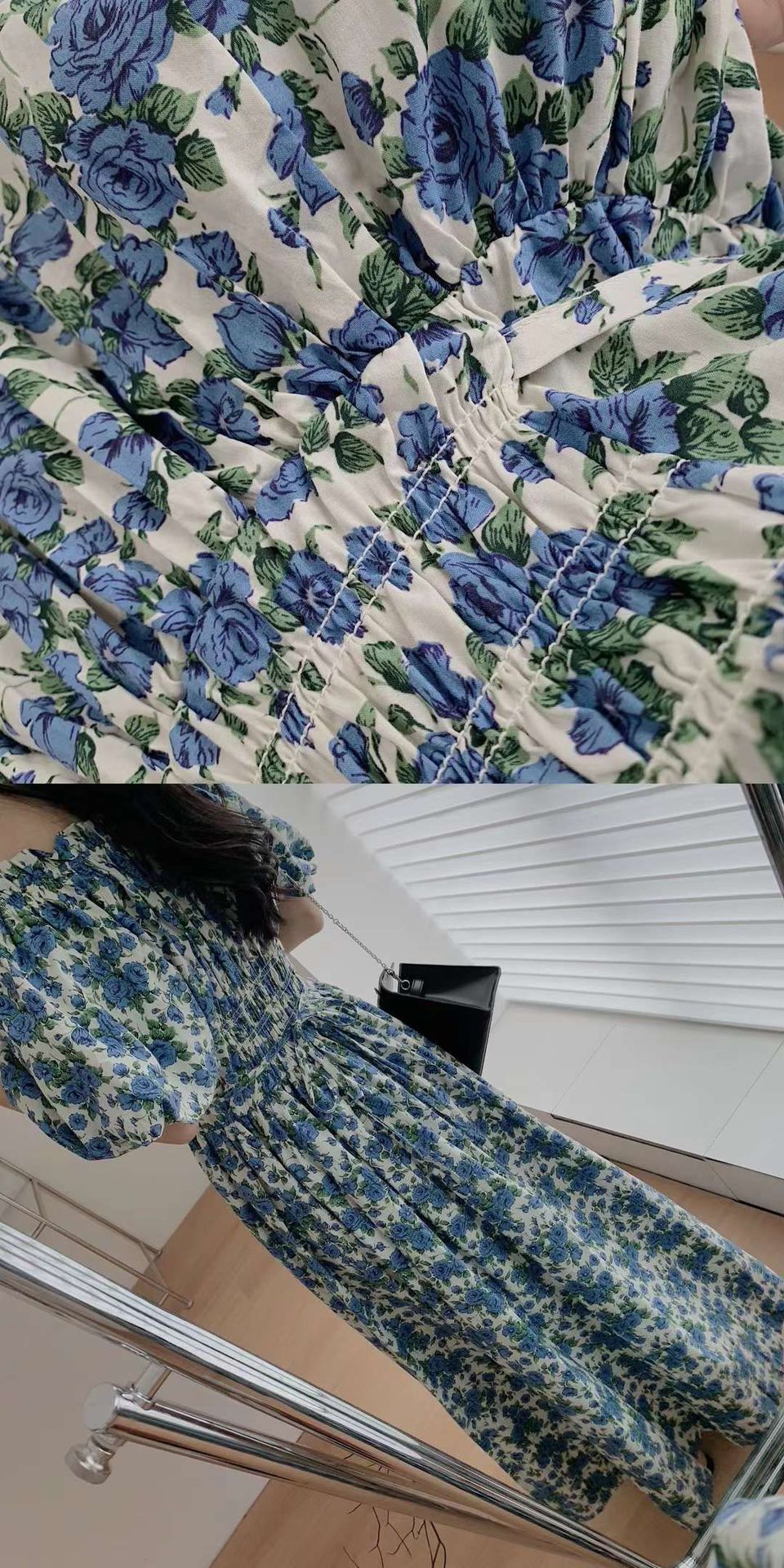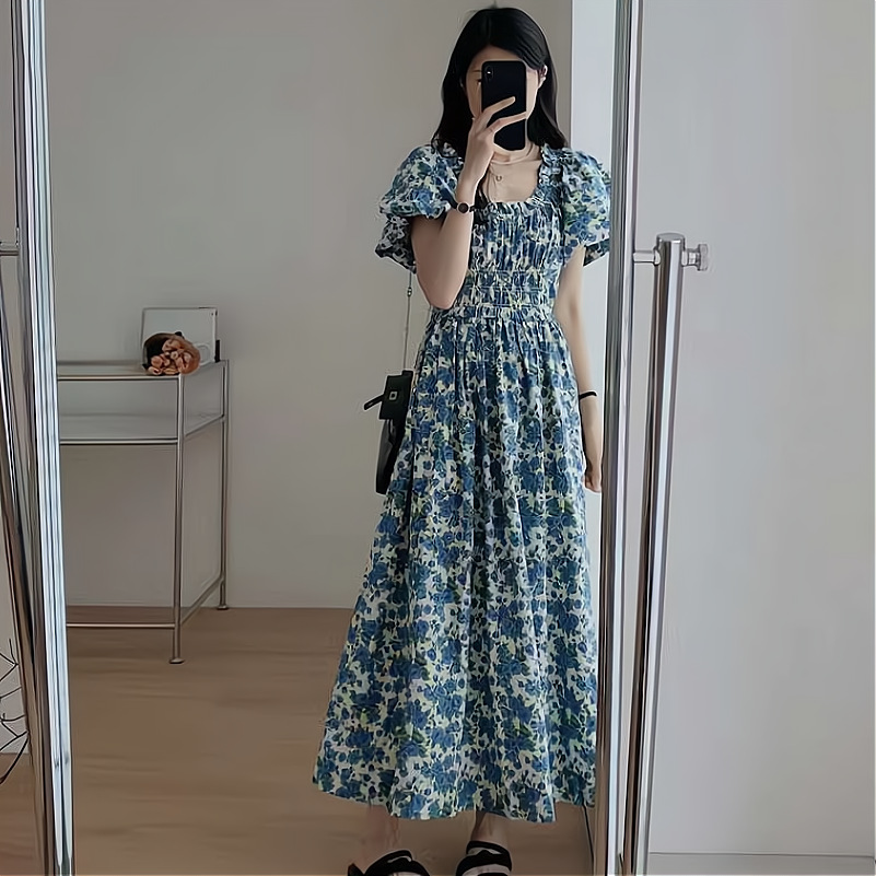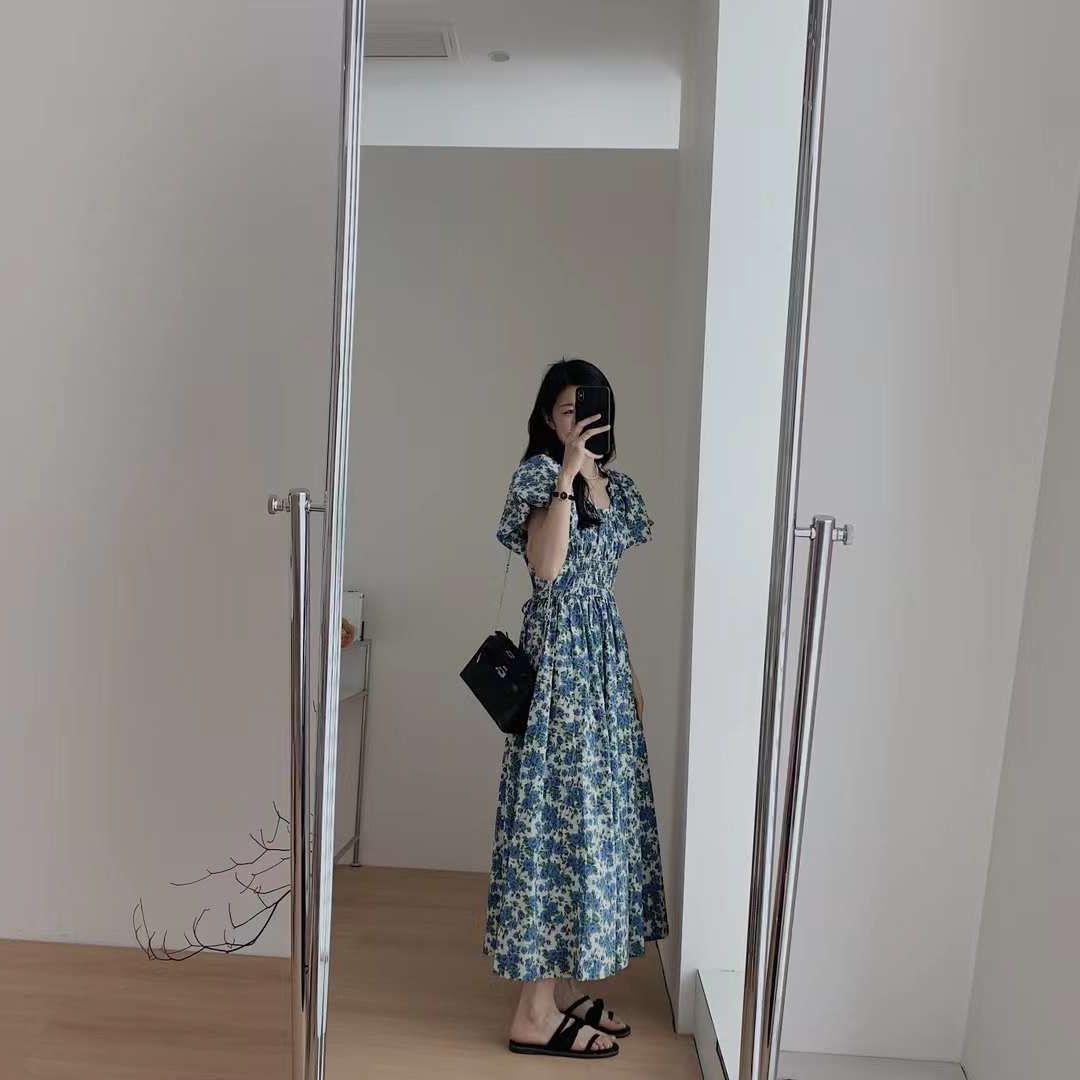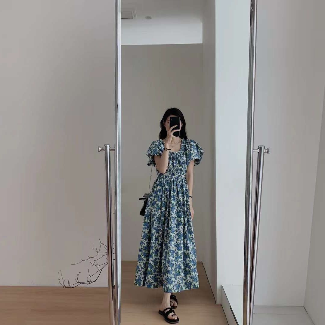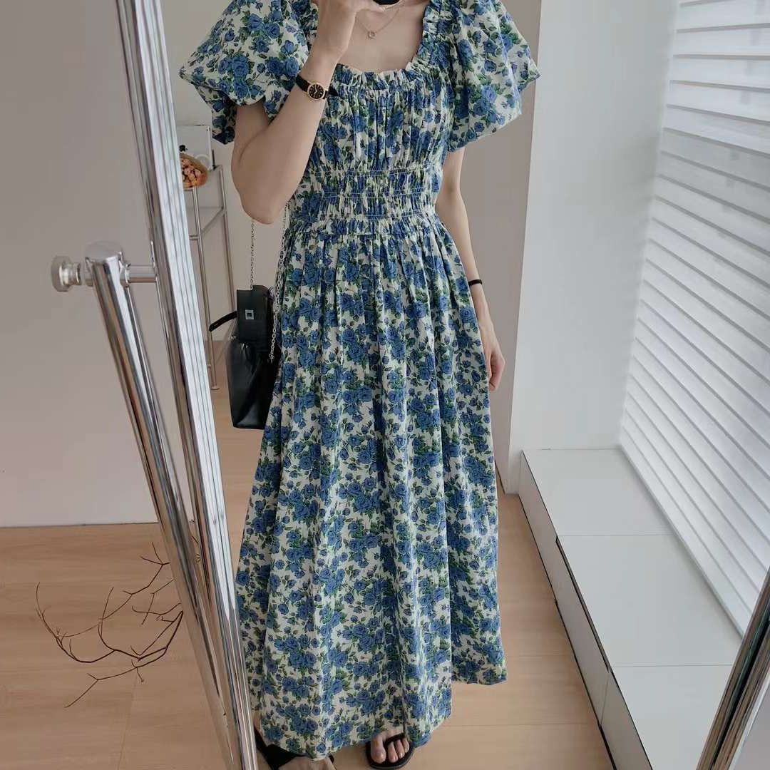 蓝色韩版宽松显瘦长裙一字肩泡泡袖褶皱收腰碎花连衣裙女夏季新款