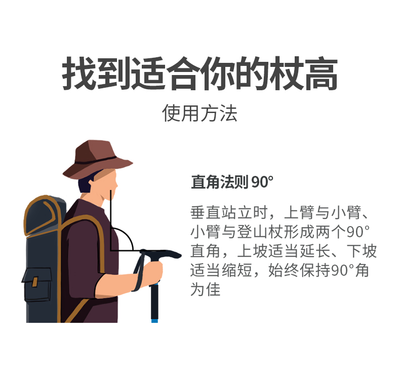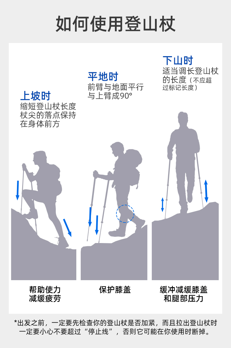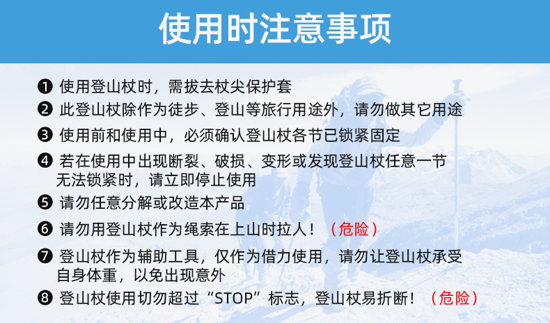 登山杖调节器拉伸一定要盖住"STOP"标识,切勿使调节器超过"STOP"标识尺线,否则会造成调节器损坏甚至断裂!