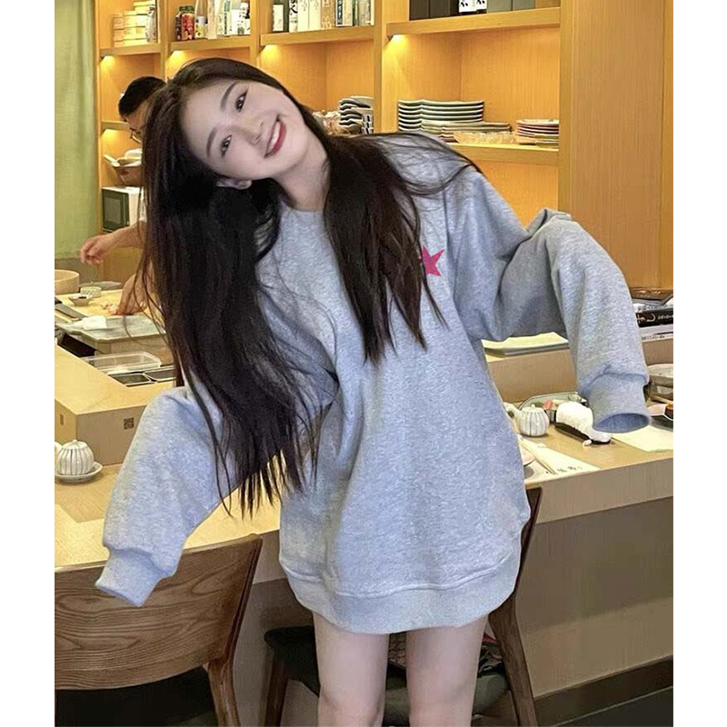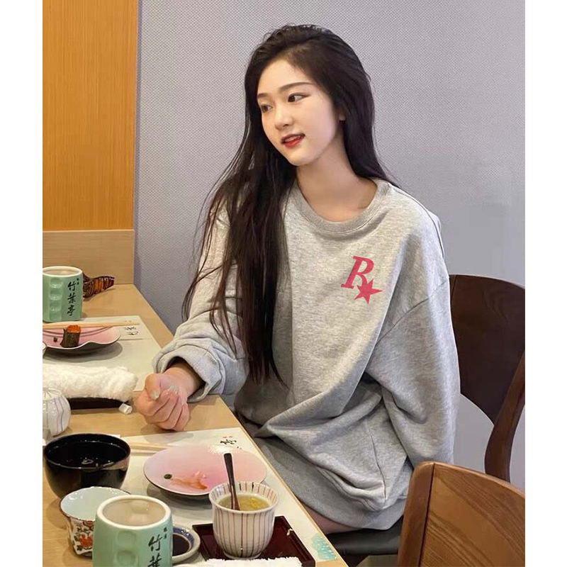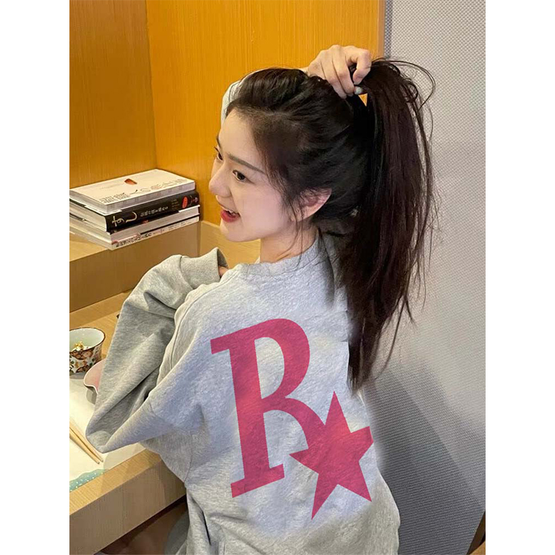 vintage美式淺灰色衛衣女春秋2023新款爆款oversize薄款圓領外套