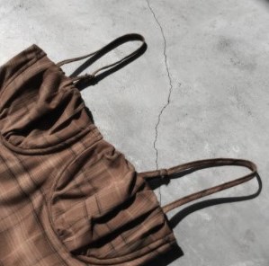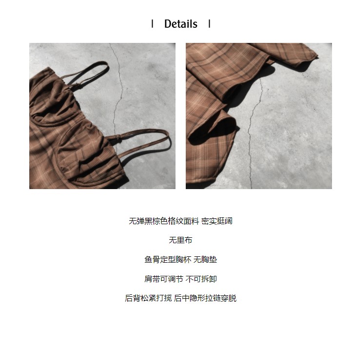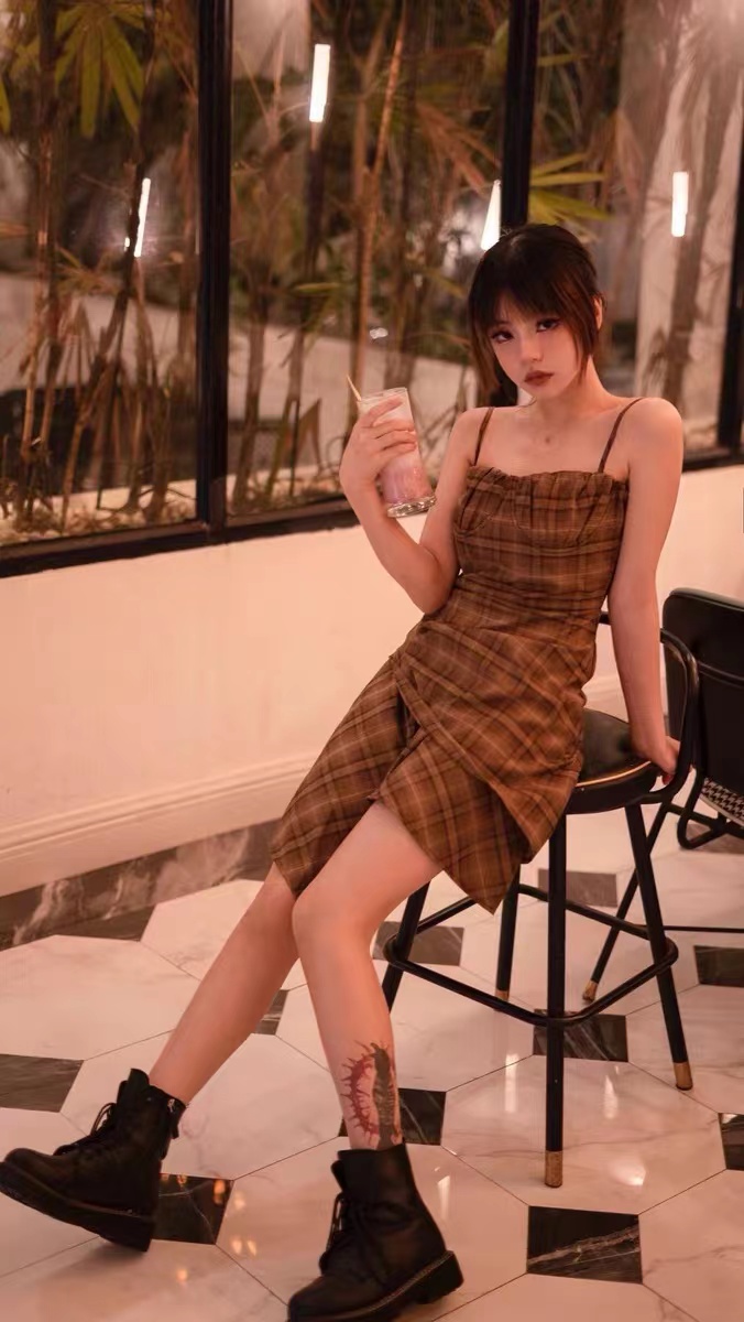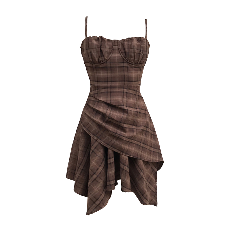 Ms XIDU焦糖慄子色系 法式復古少女格紋不規則褶皺顯瘦吊帶裙女夏