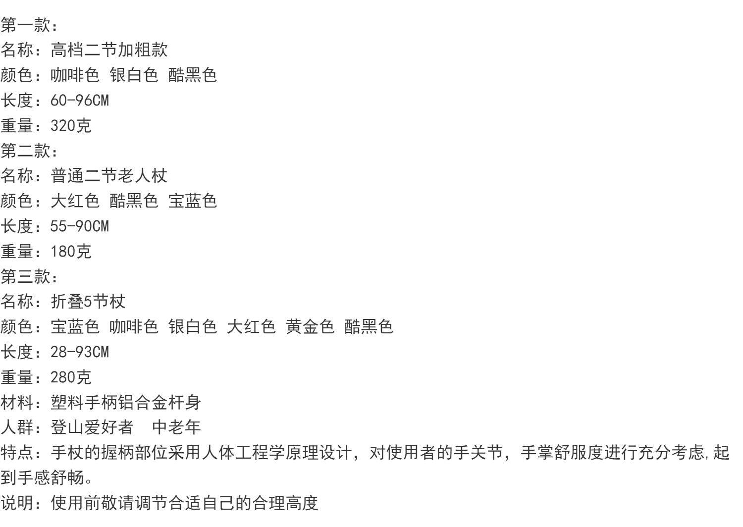 顏色分類 高檔二節加粗酷黑色,高檔二節加粗古銅色,高檔二節加粗亮銀色,普通二節杖紅色,普通二節杖黑色,普通二節杖藍色,摺疊5節杖酷黑色,摺疊5節杖大紅色,摺疊5節杖寶藍色,摺疊5節杖銀白色,摺疊5節杖黃金色,摺疊5節杖咖啡色,普通二節杖咖啡色