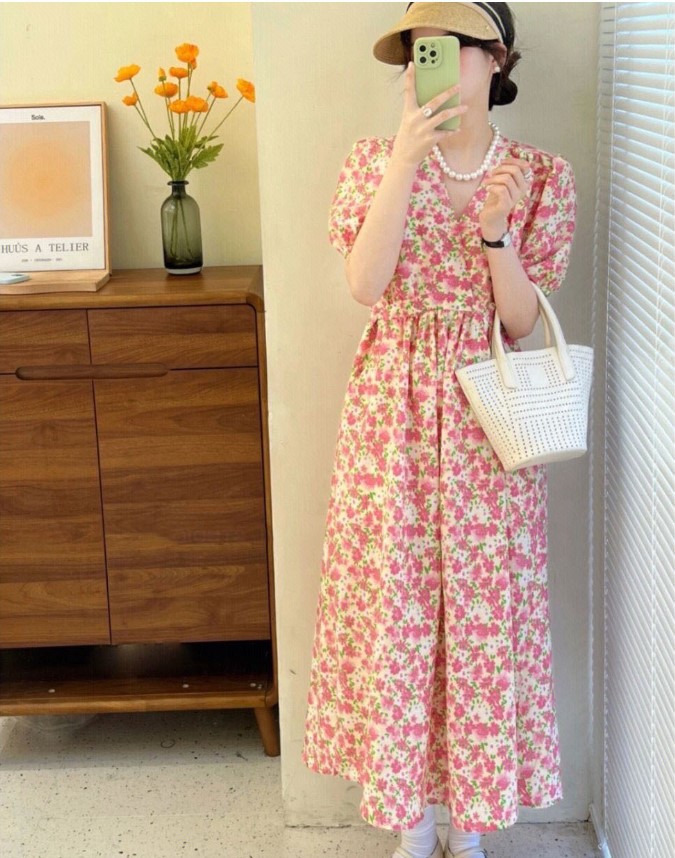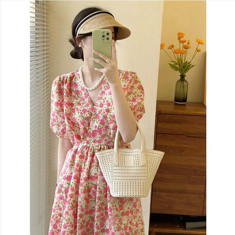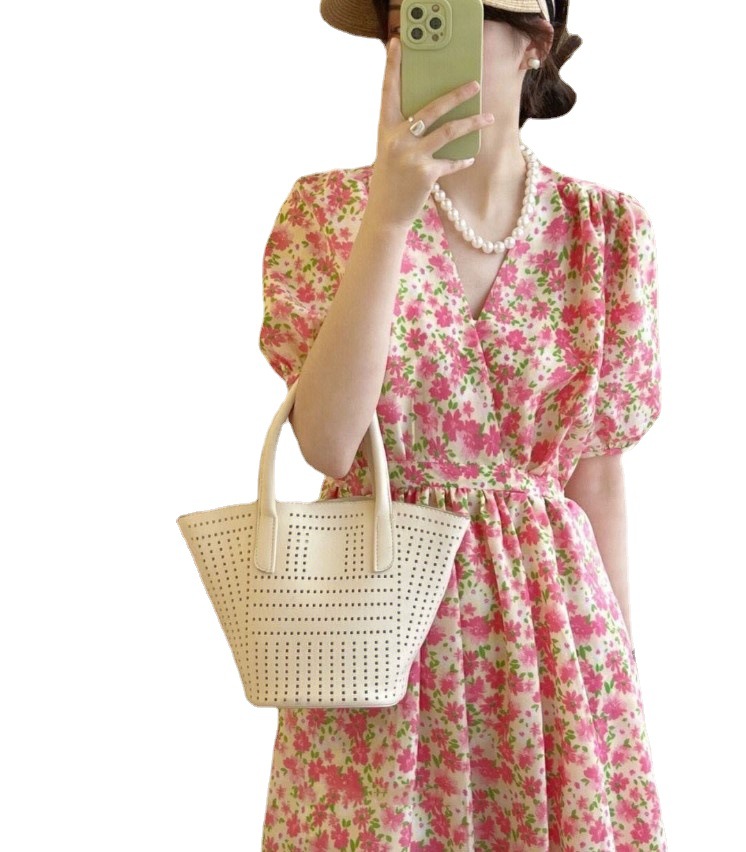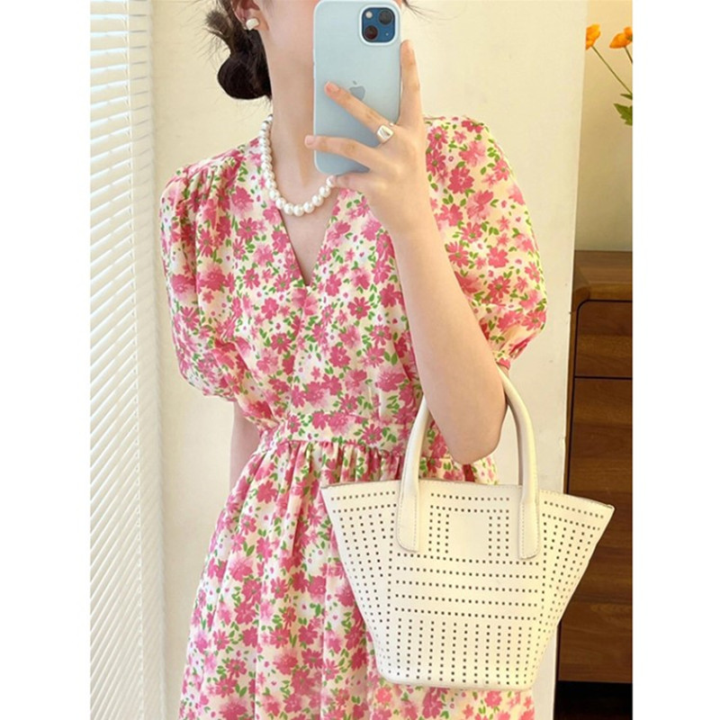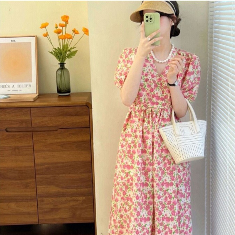 2023年夏季法式初恋温柔风长裙气质别致显瘦V领粉色碎花连衣裙子