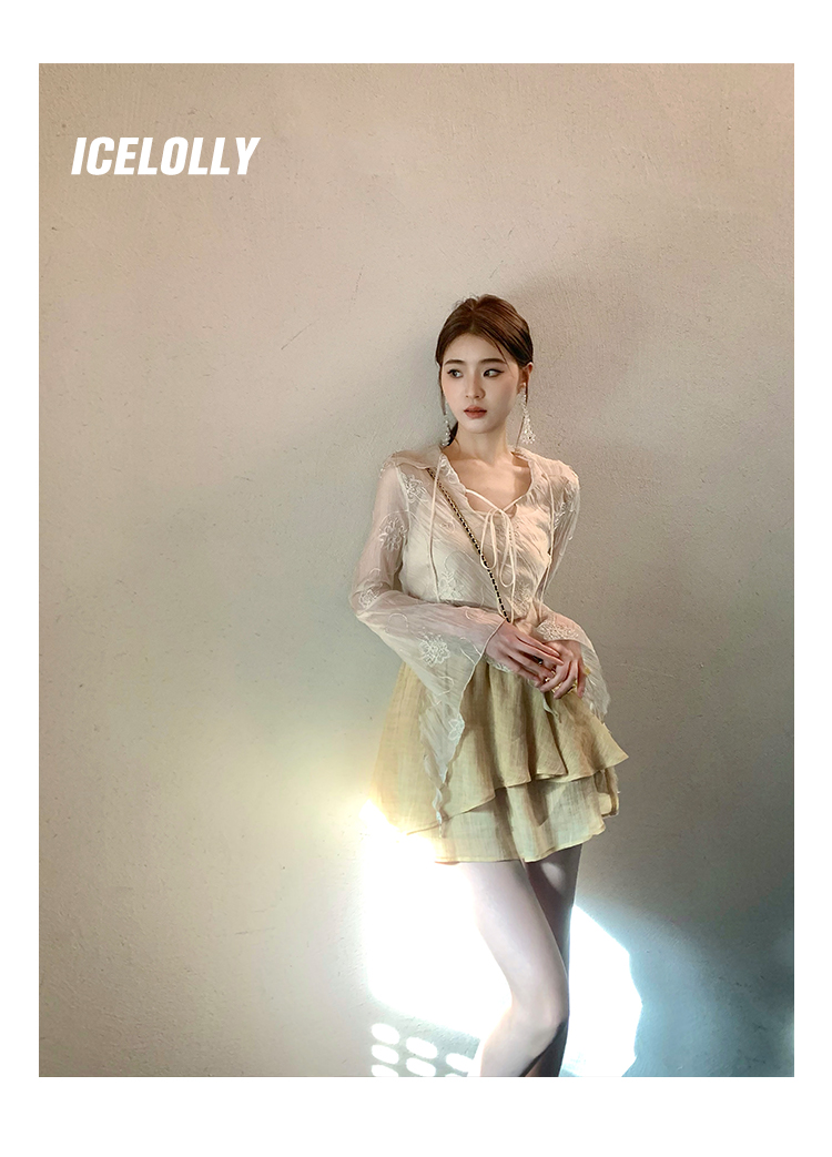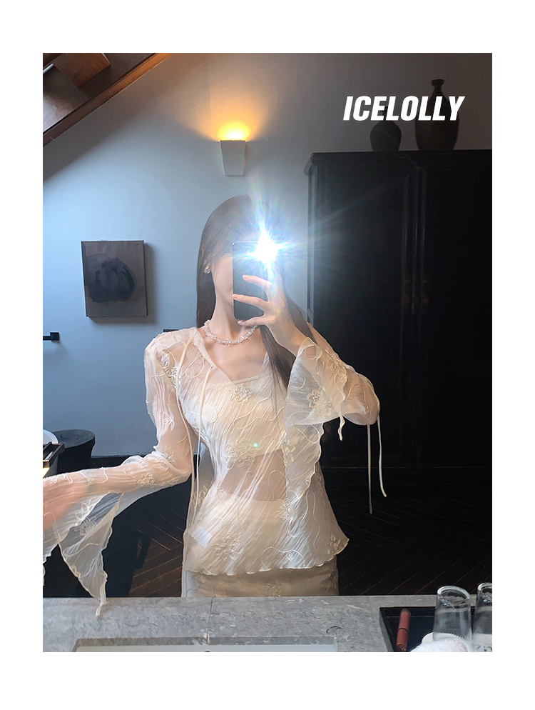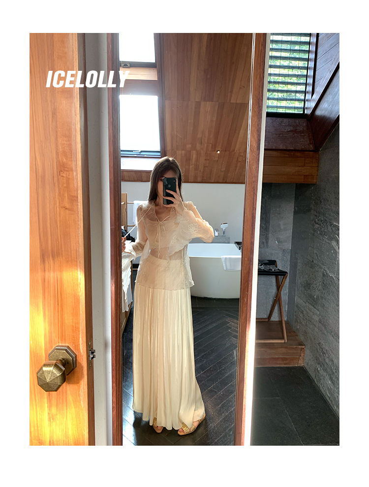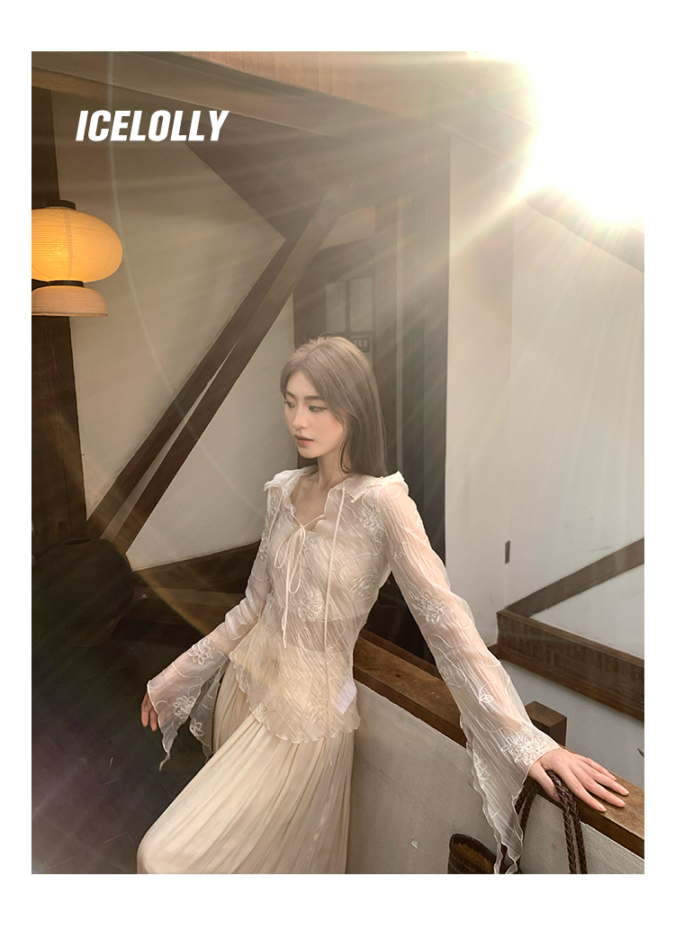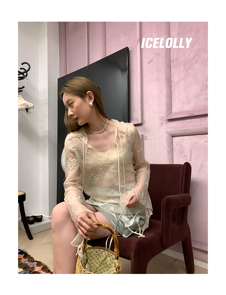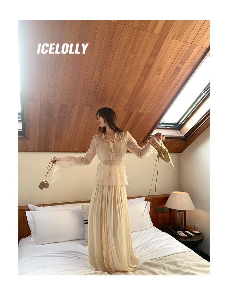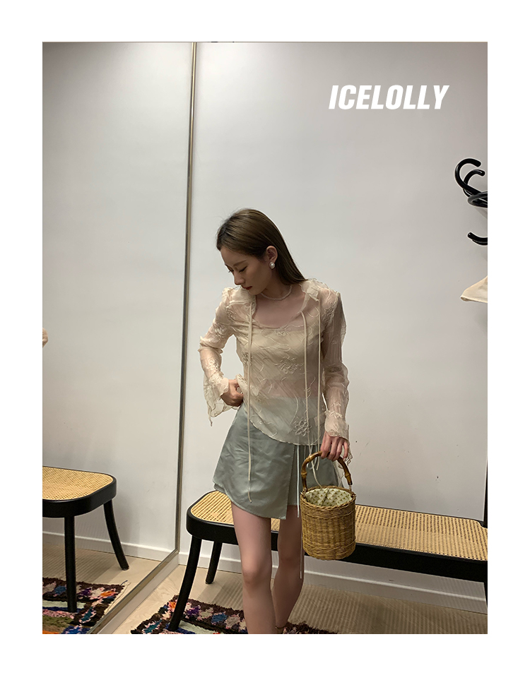 ICELOLLY長袖天絲襯衫女夏法式小衫獨特別致小上衣雪紡衫兩件式套裝