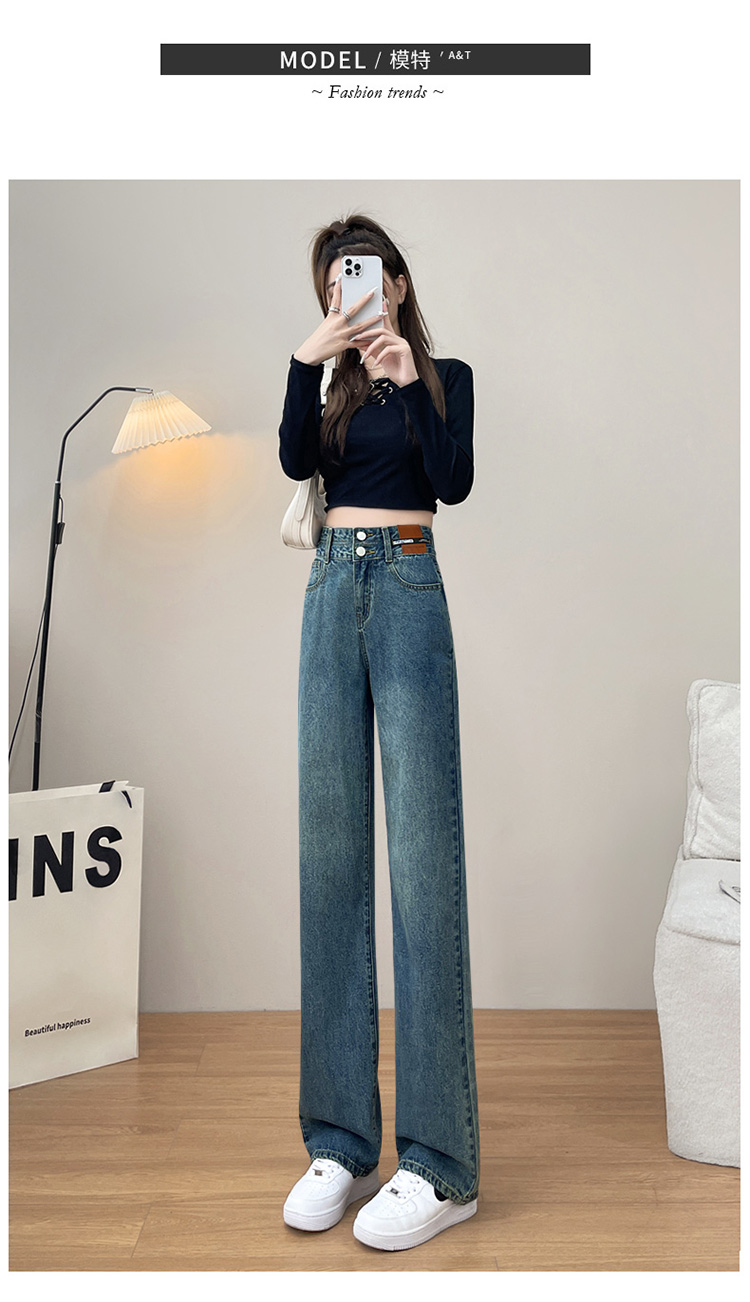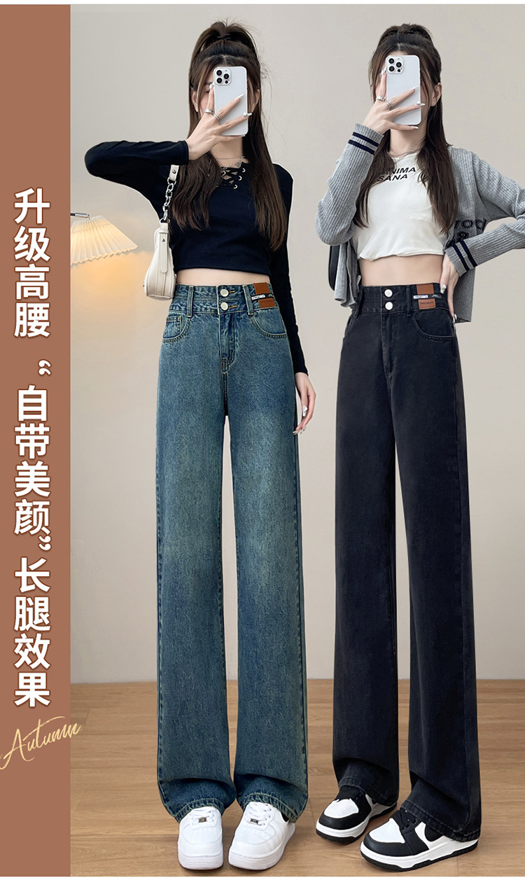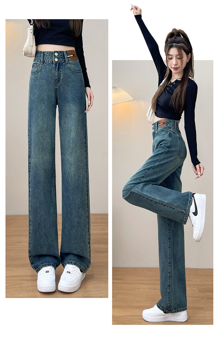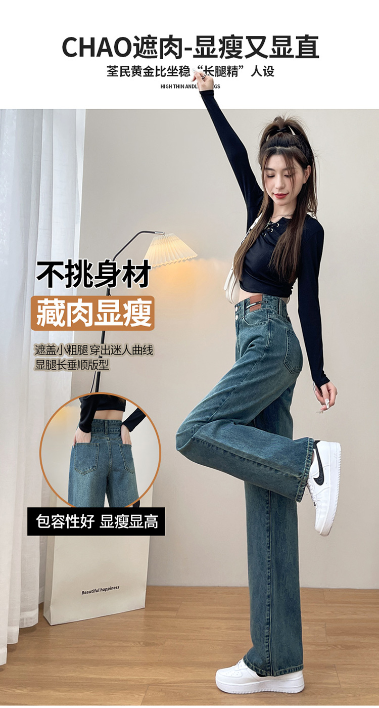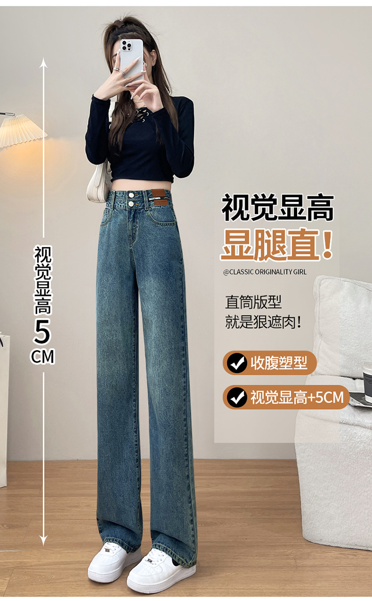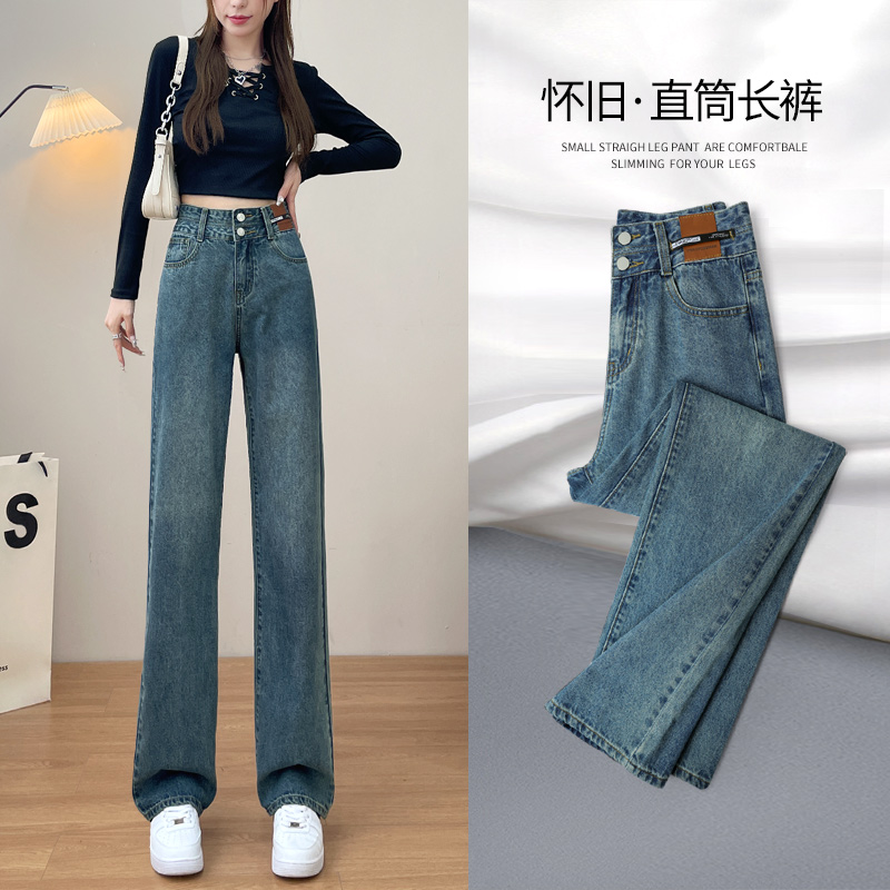 復古牛仔褲女直筒寬鬆高腰春秋季2023年新款小個子拖地窄版闊腿褲