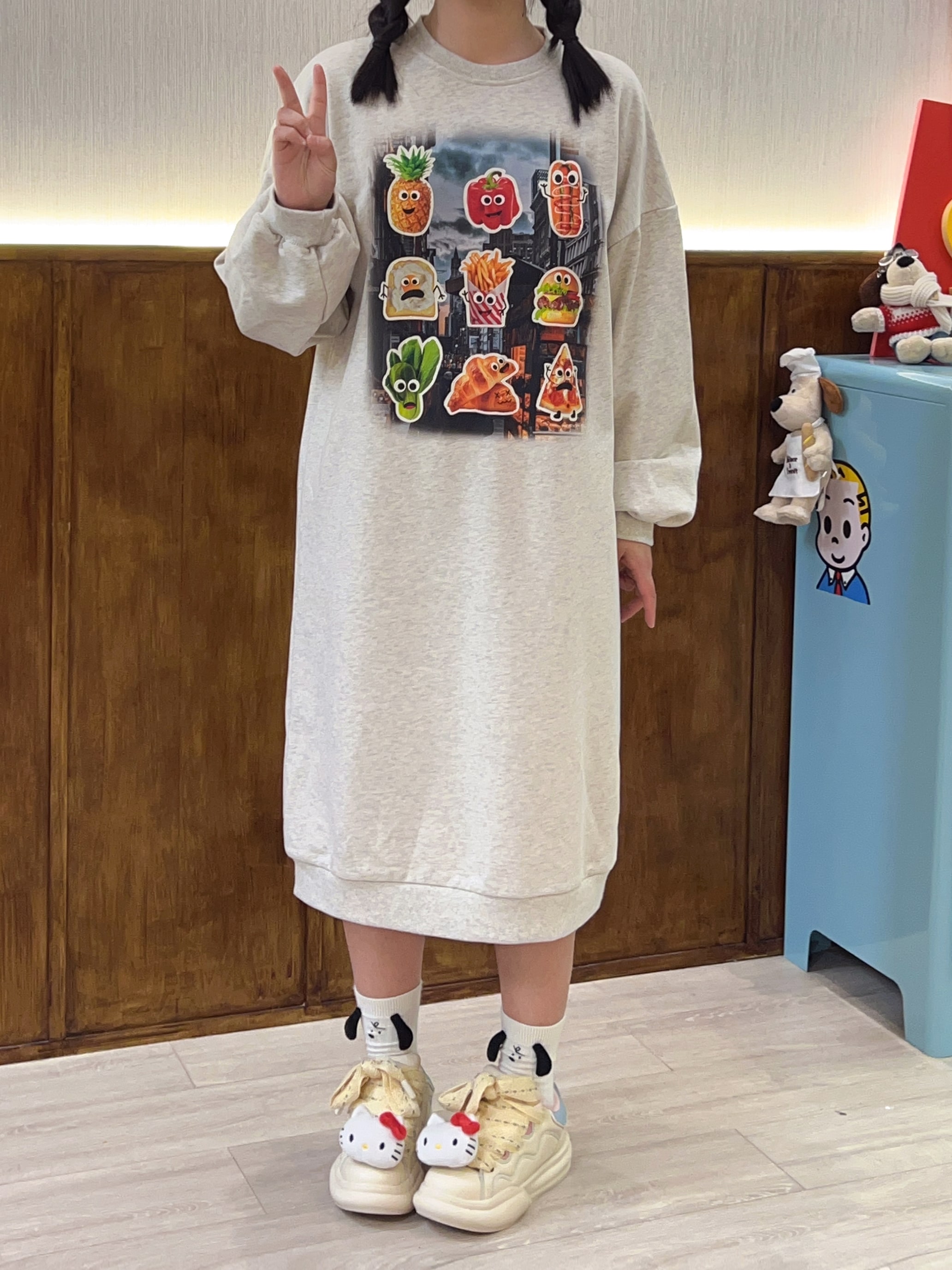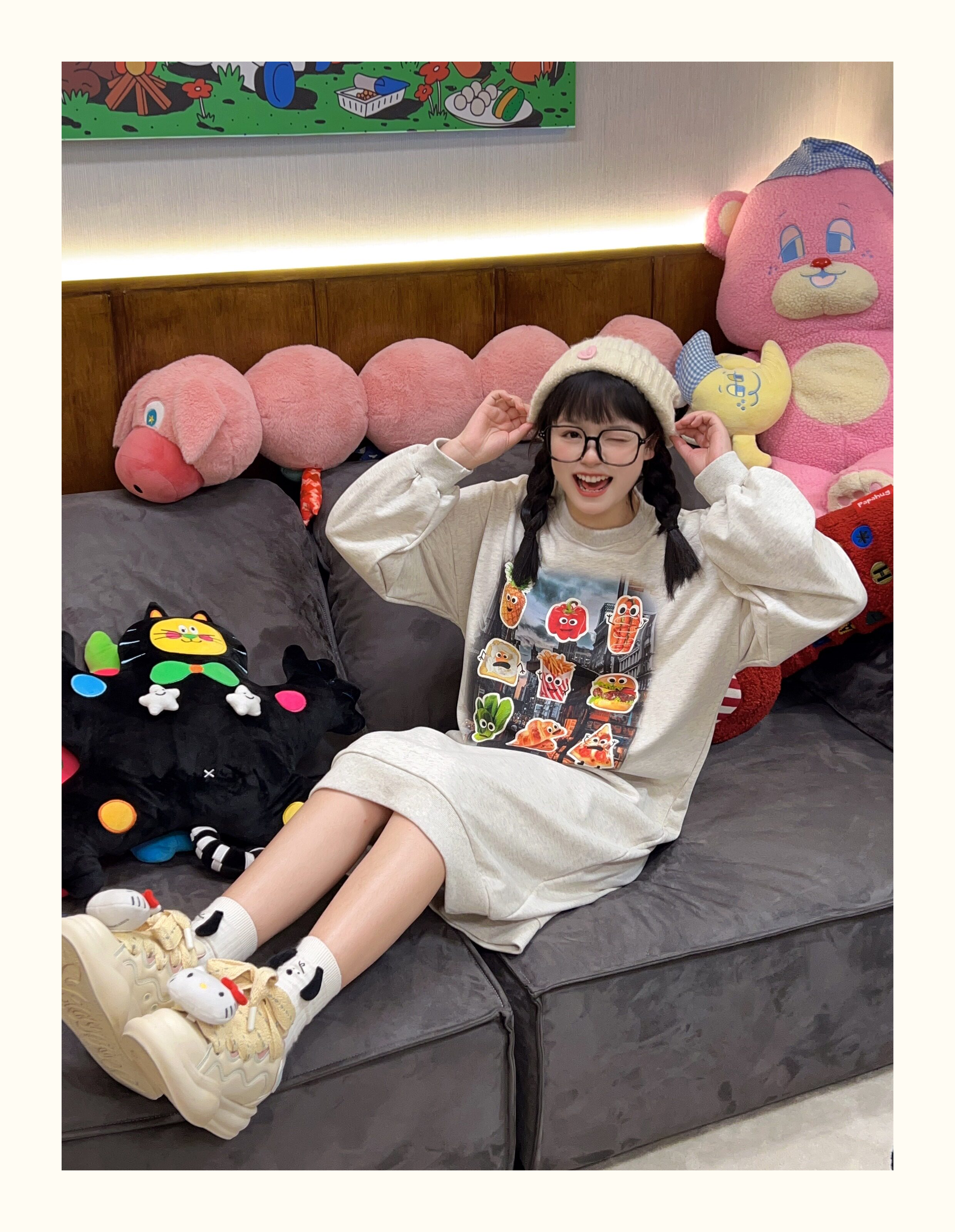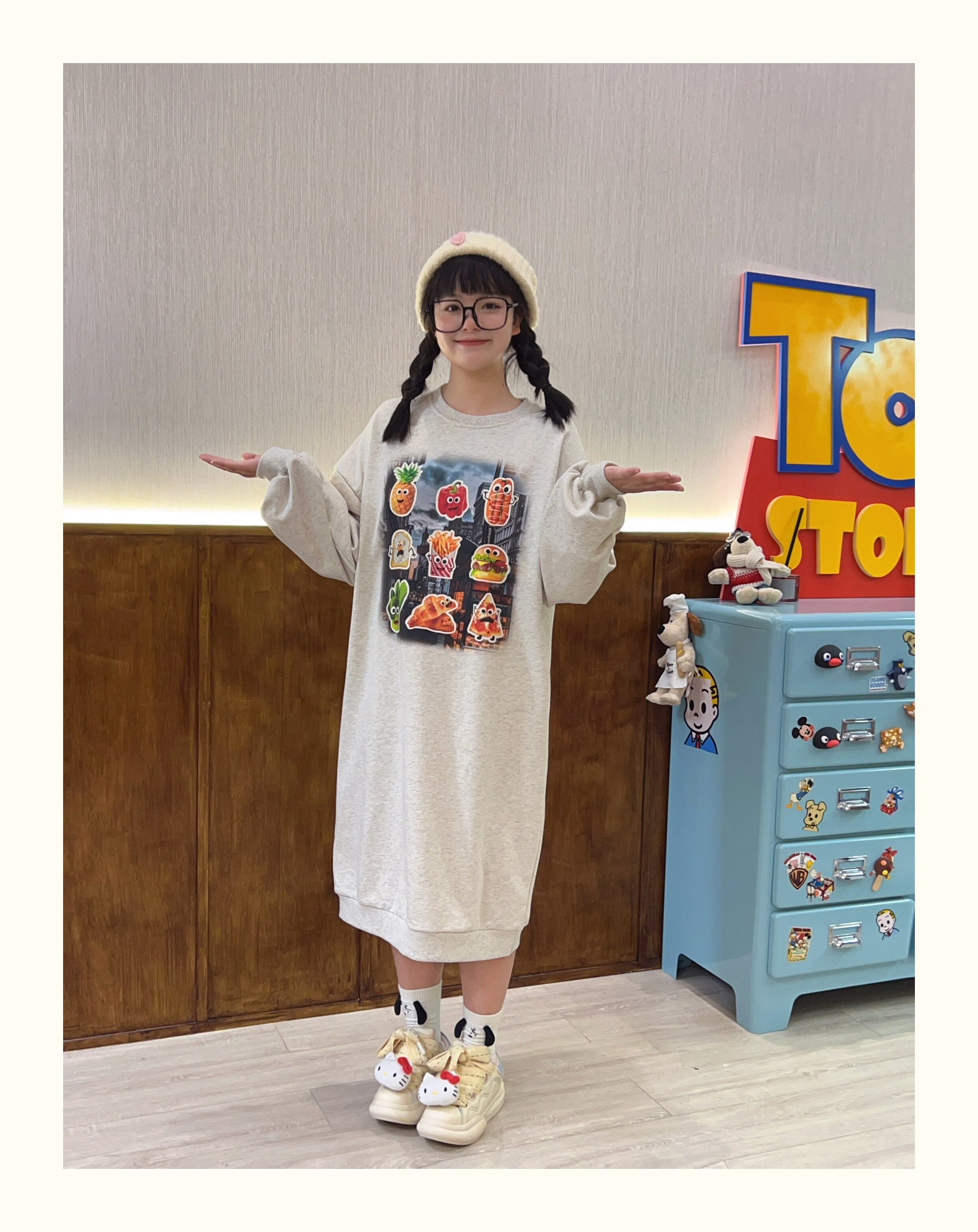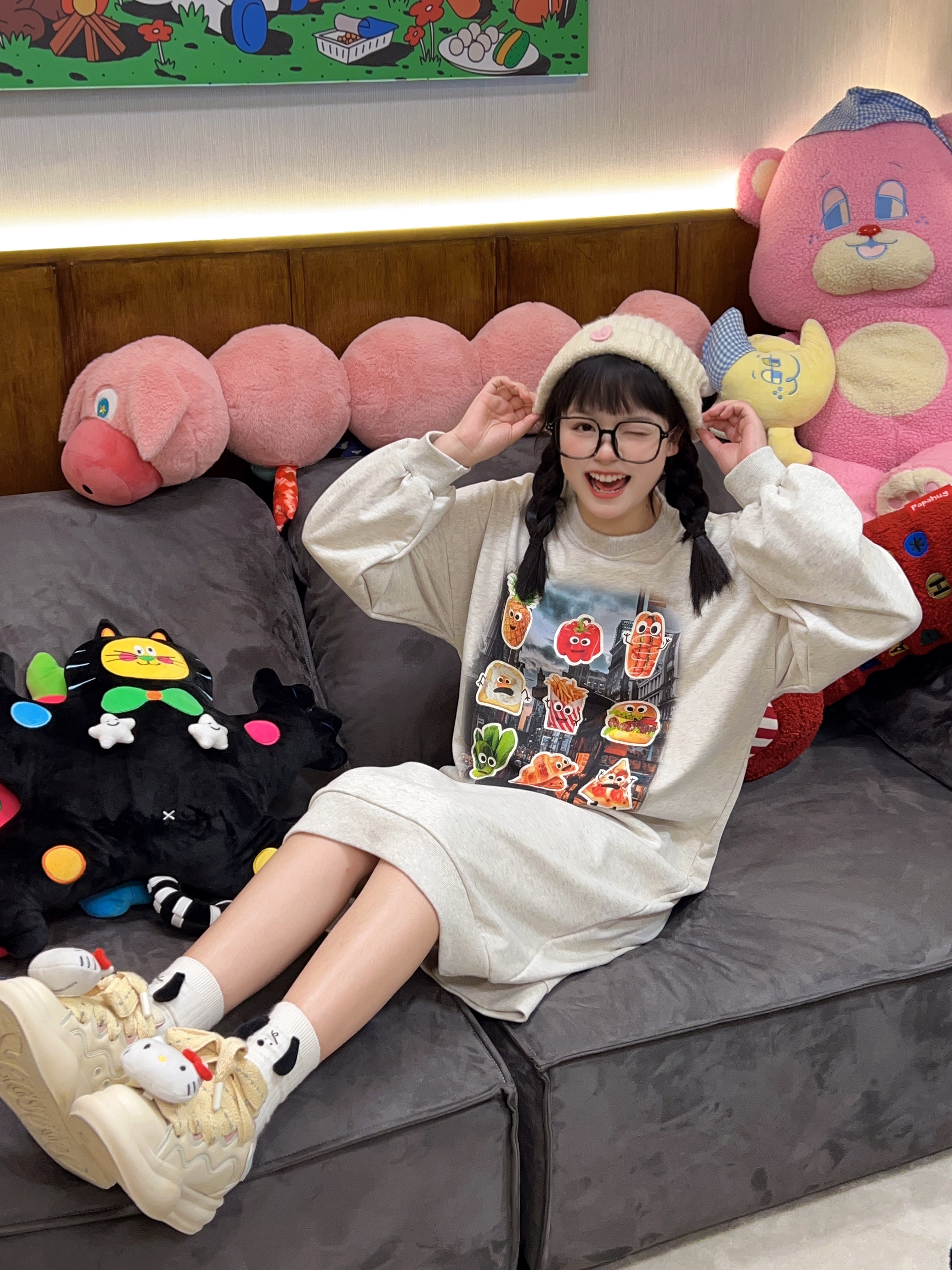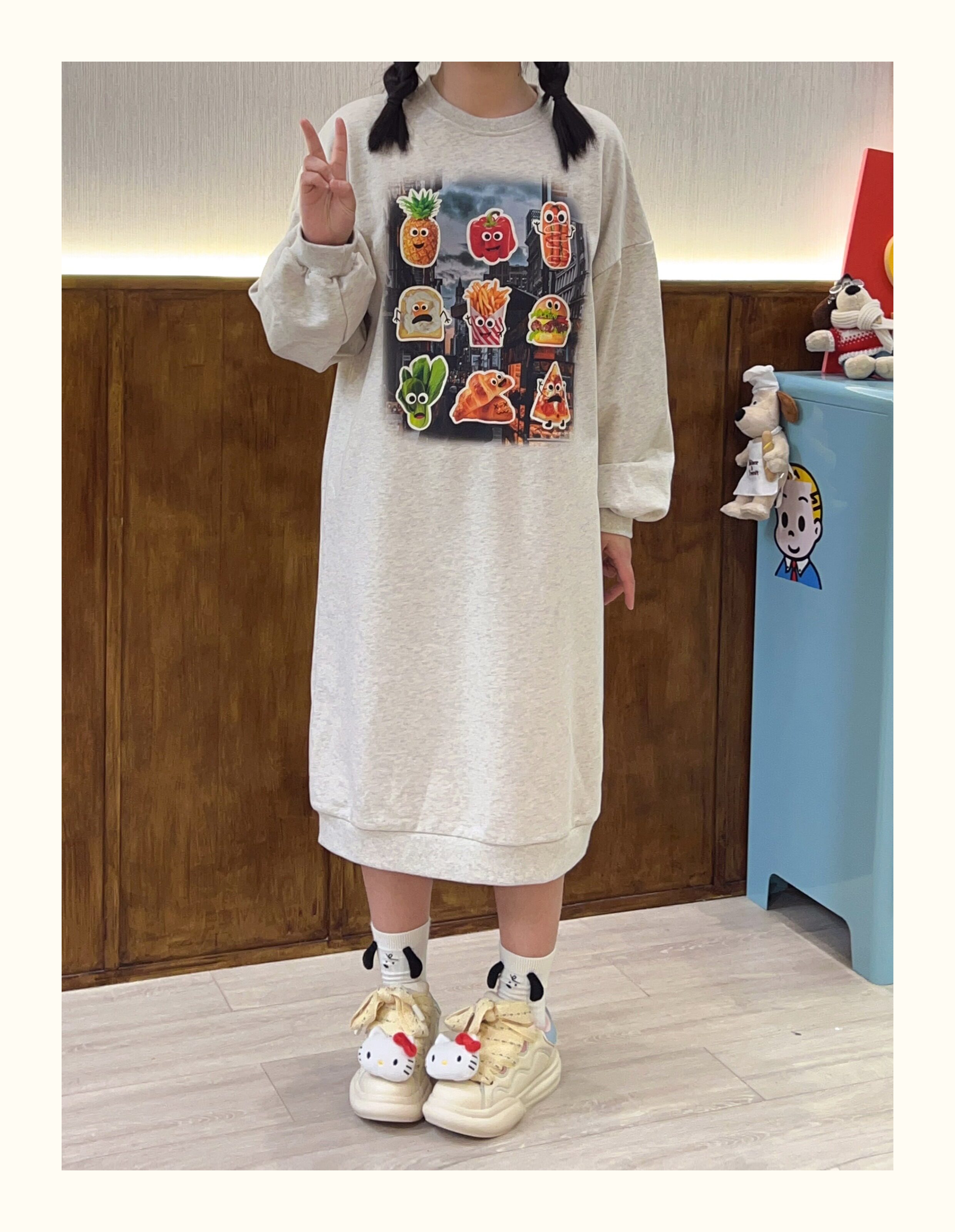 Robootoo花灰色原創童趣美式全棉印花套頭長版內搭衛衣裙2023冬女
