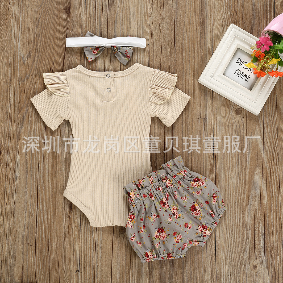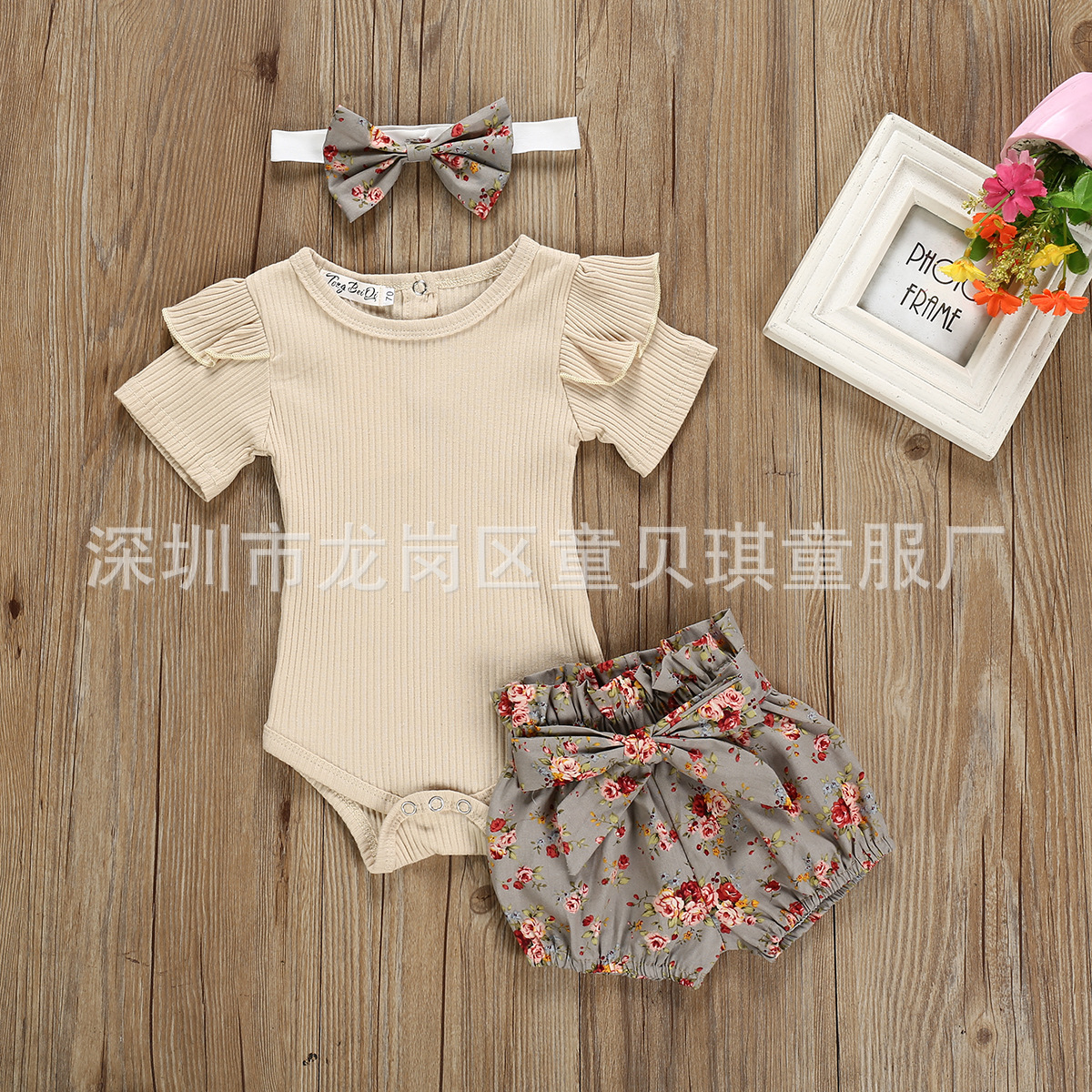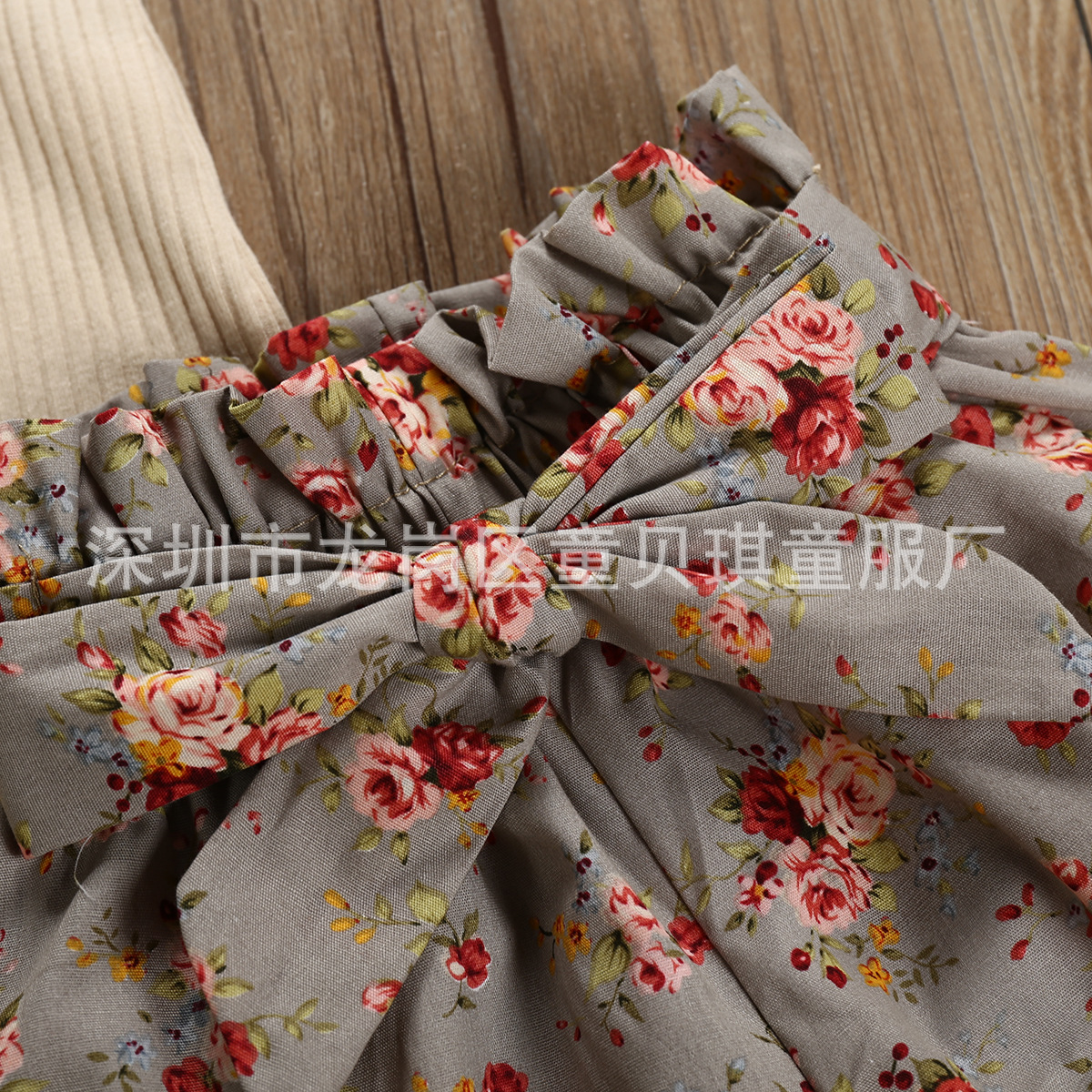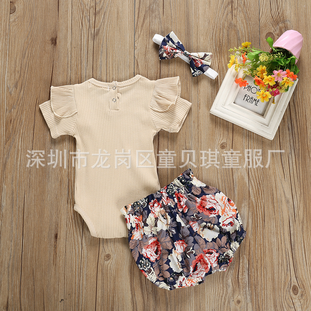 跨境2021夏秋新款棉女宝宝套装短袖哈衣爬服碎花短裤头饰儿童套装