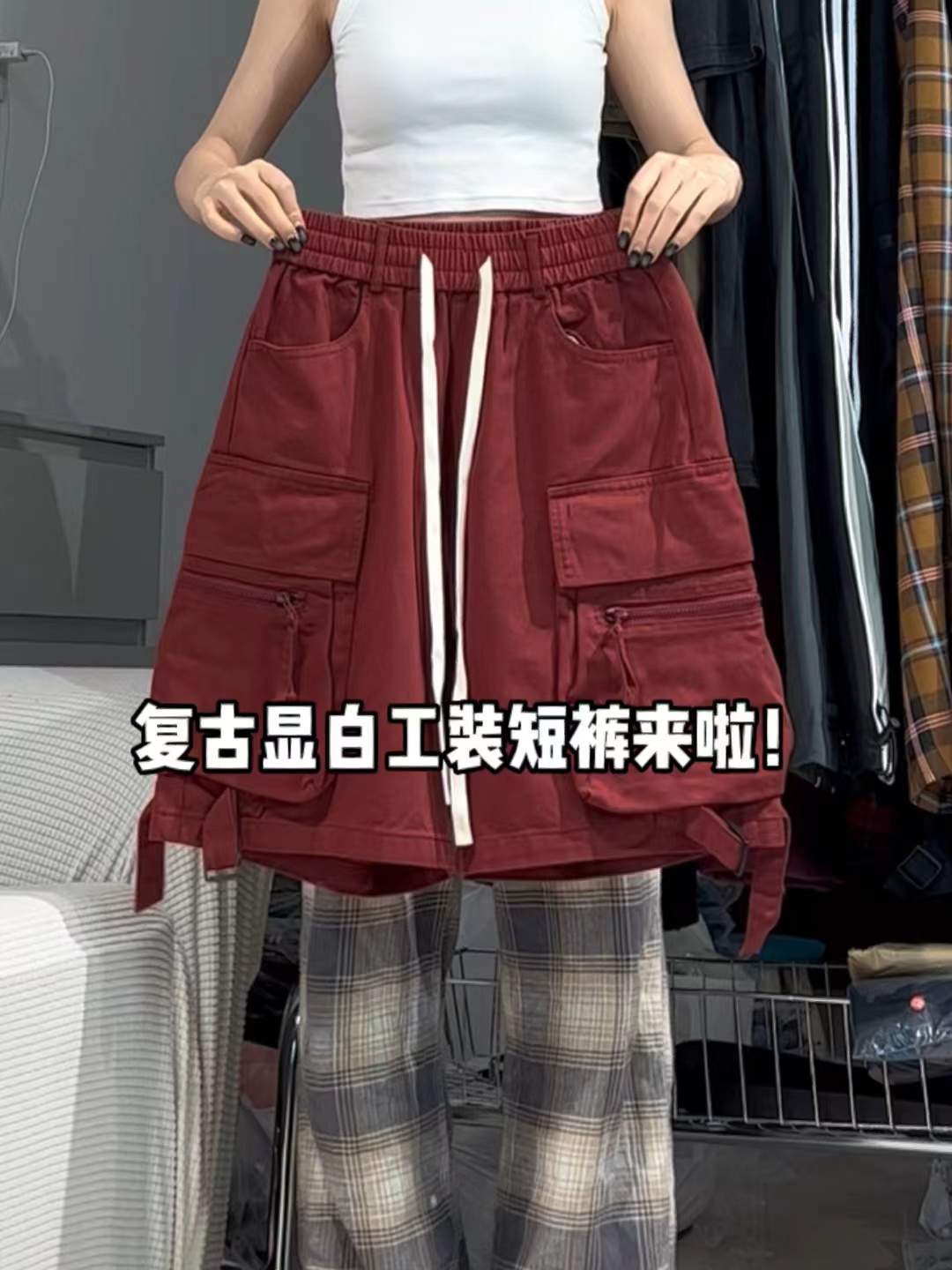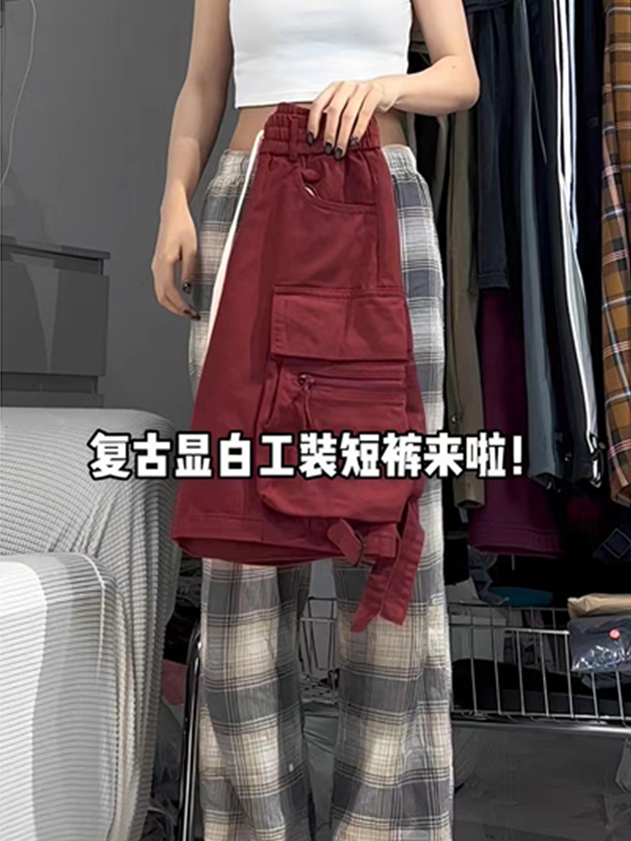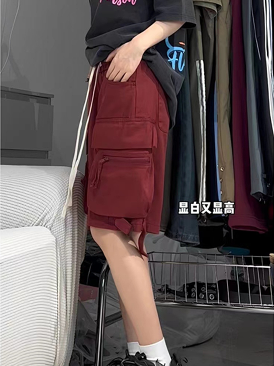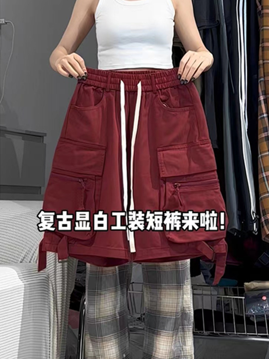 美式高街hiphop紅色工裝短褲男女夏季街舞潮牌運動休閒五分褲子