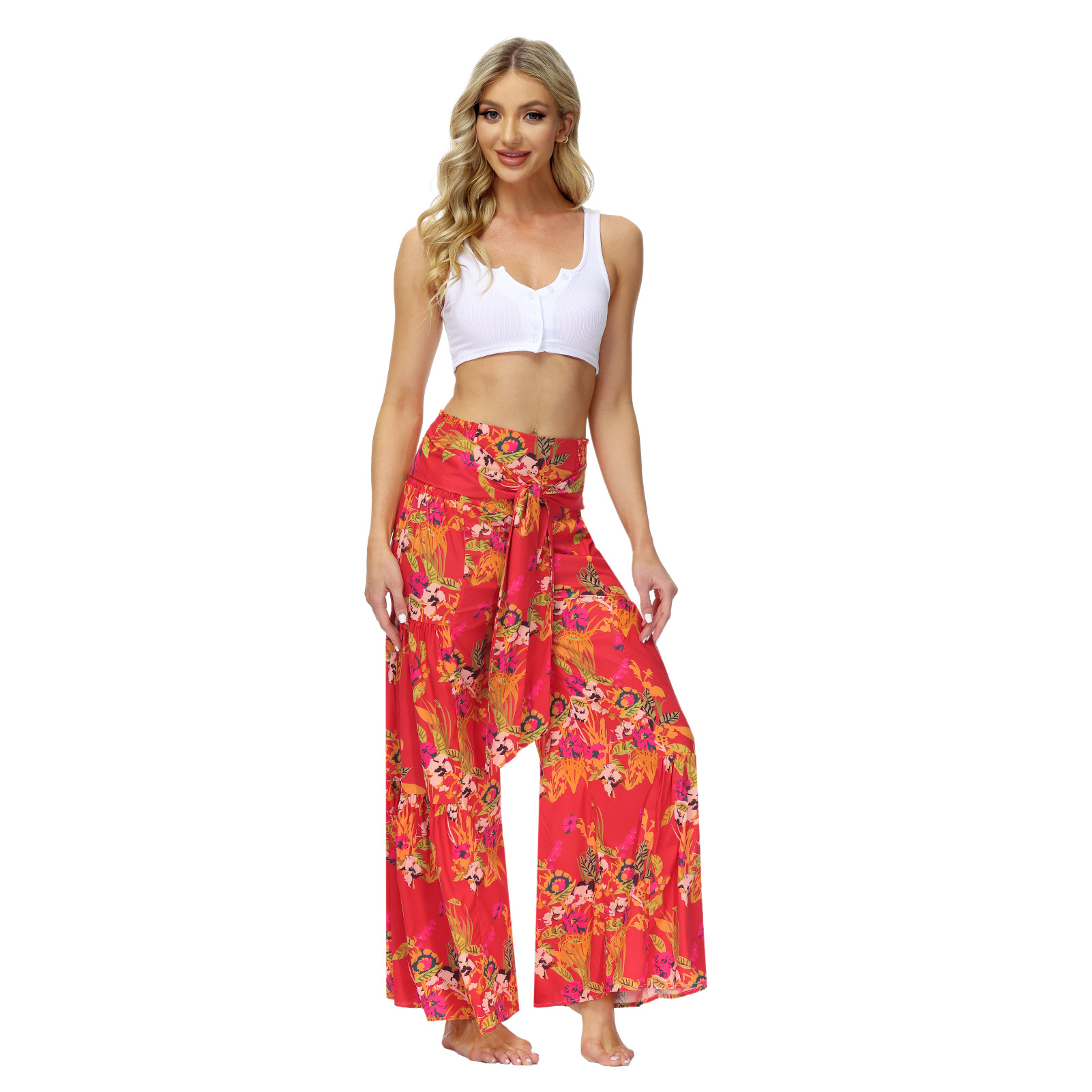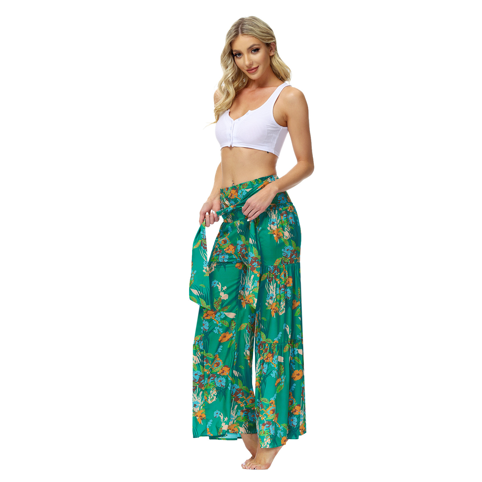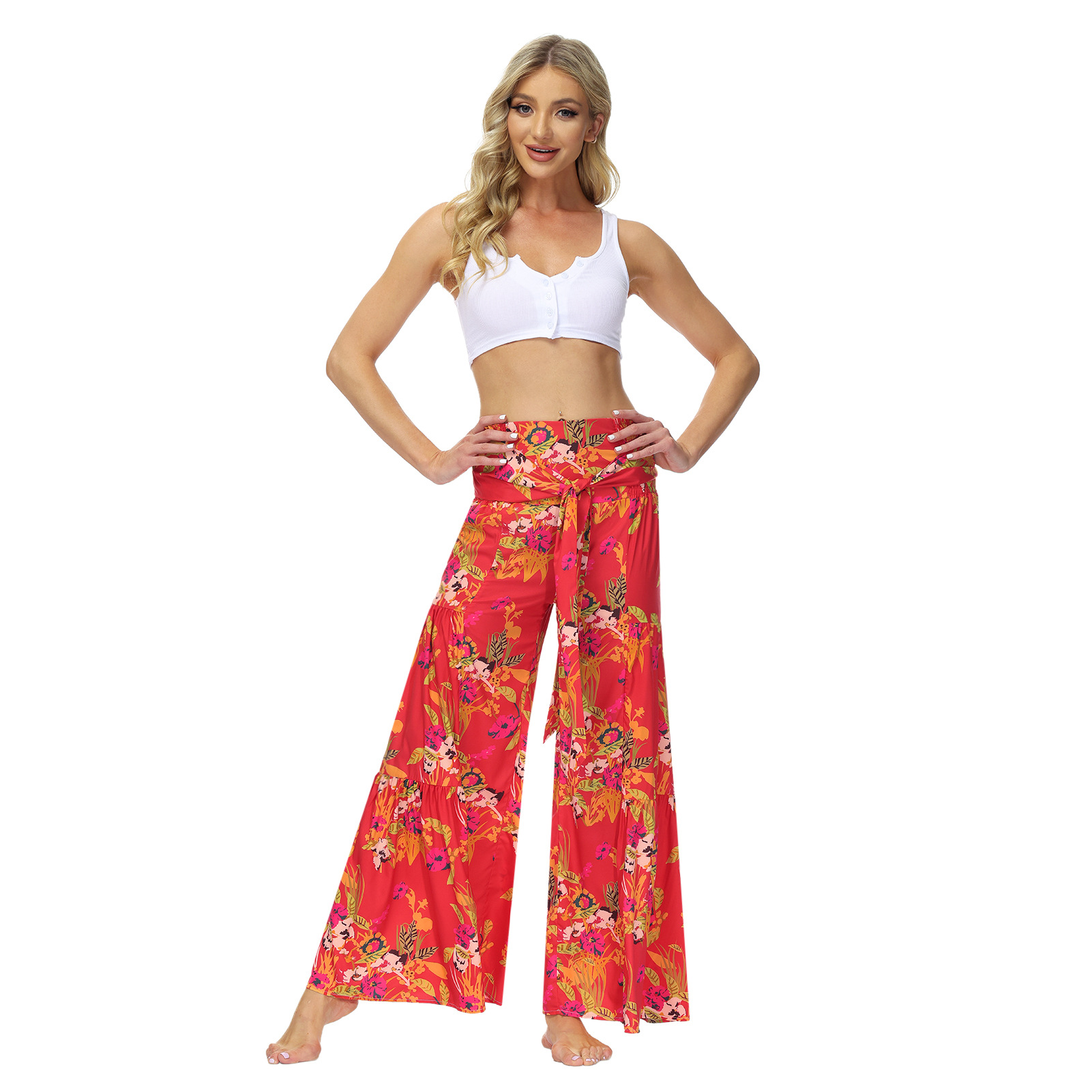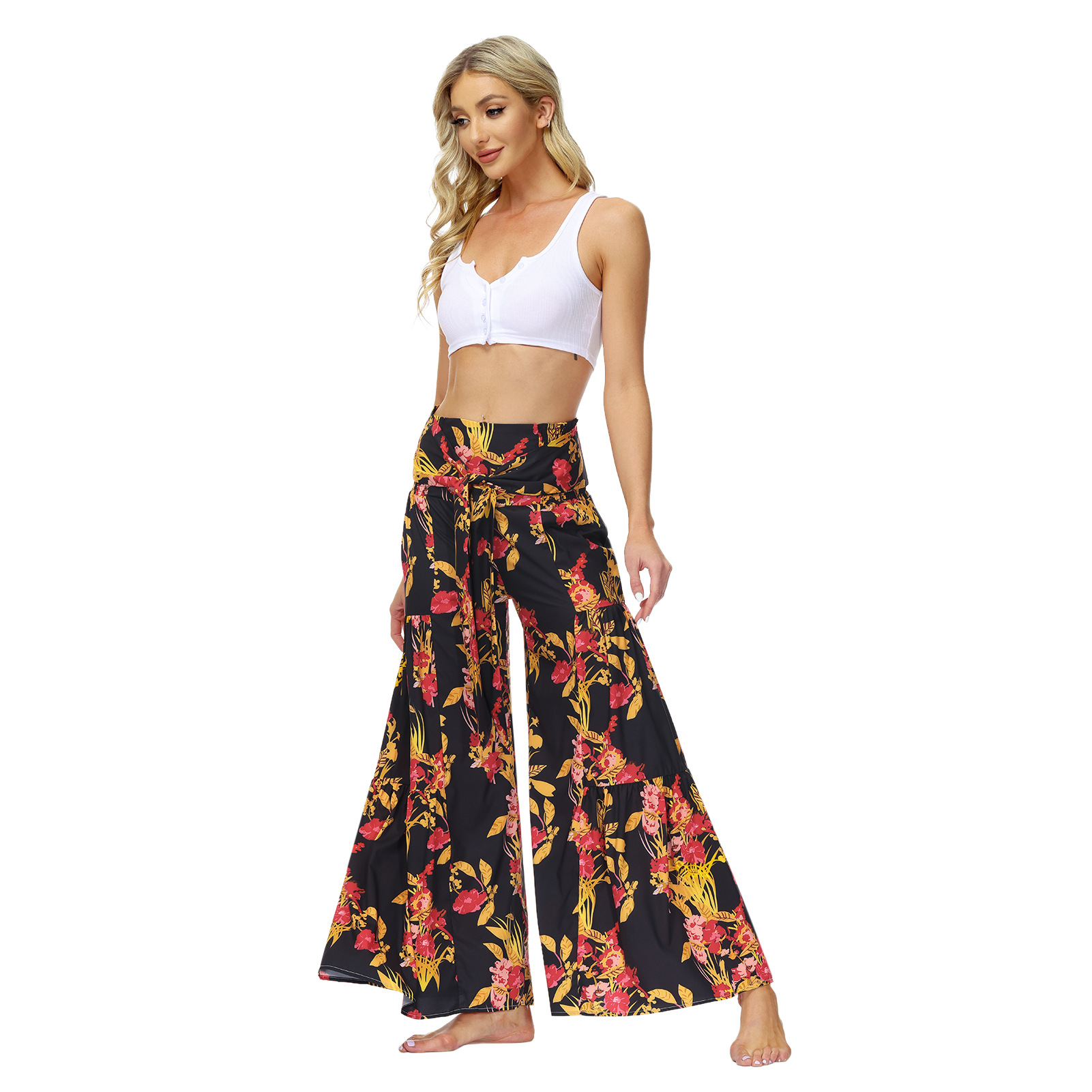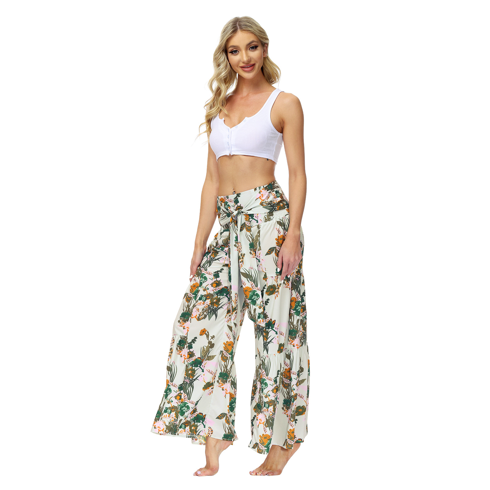 亚马逊春夏新品数码印花女装宽松休闲长裤沙滩阔腿裤绑带裤子现货