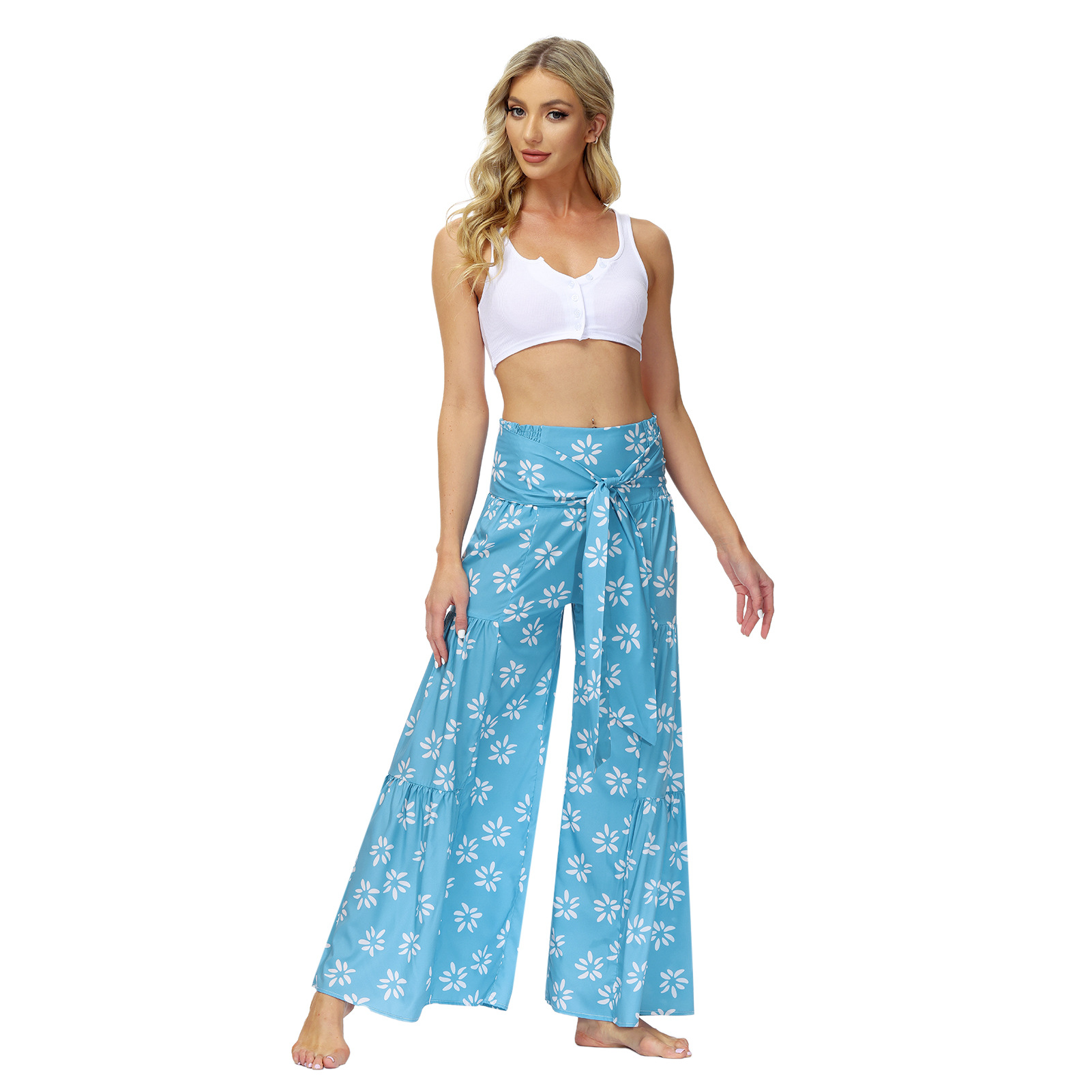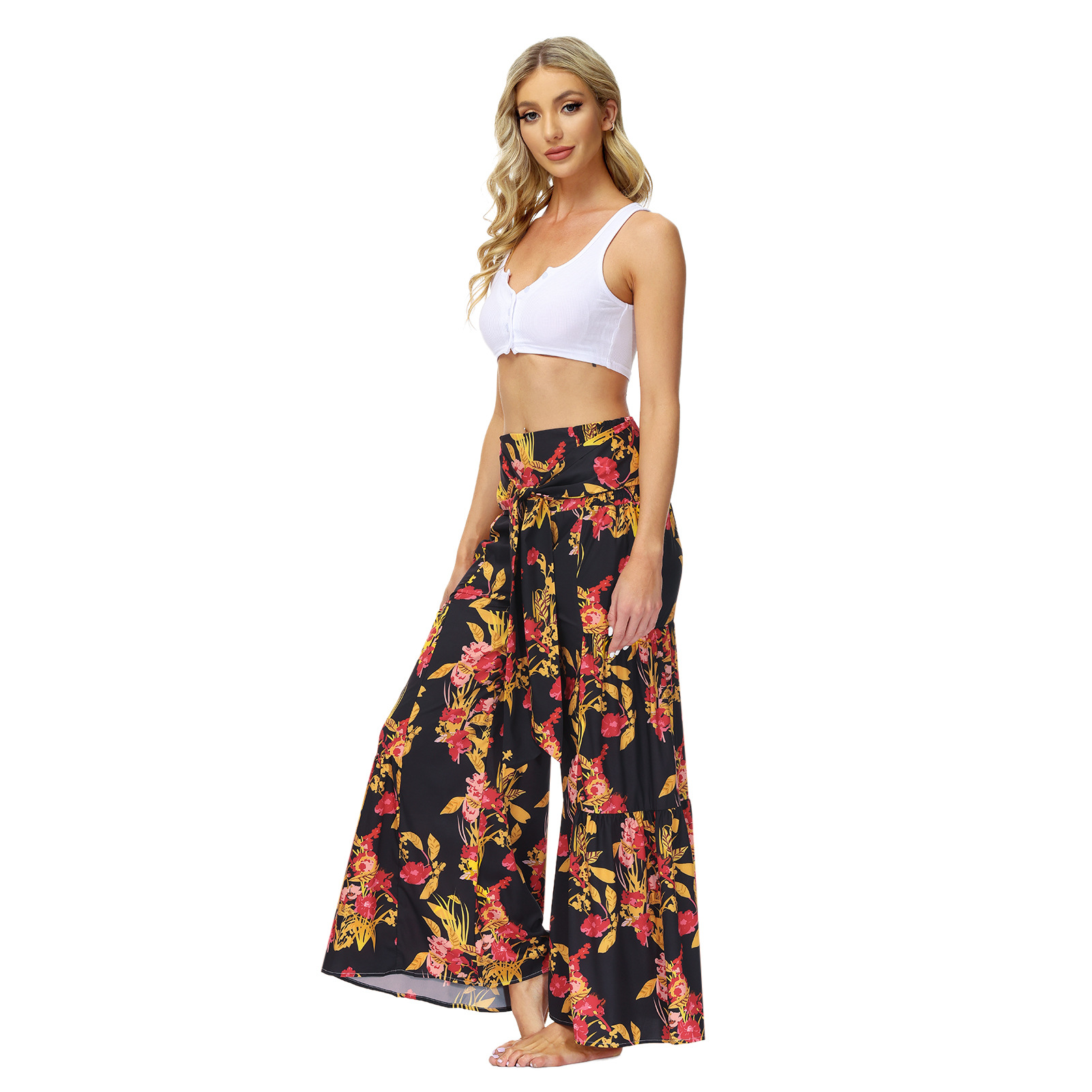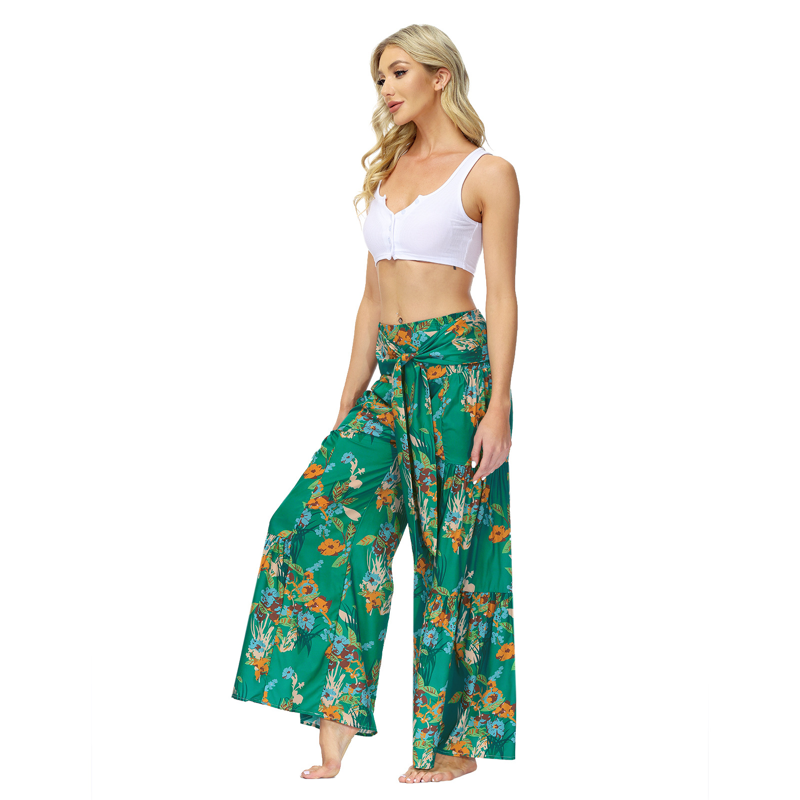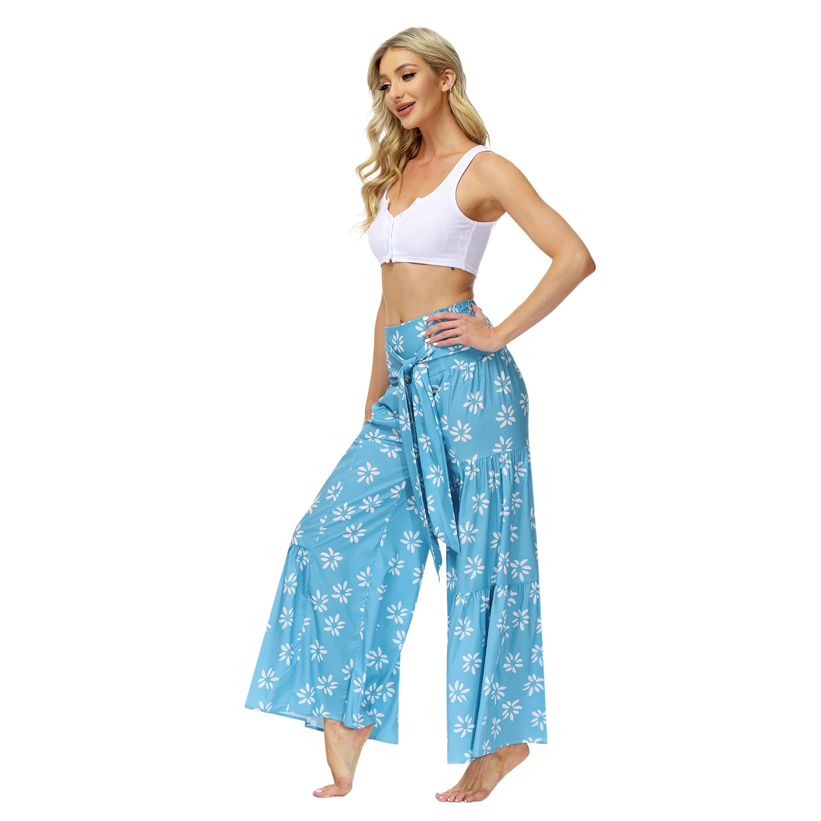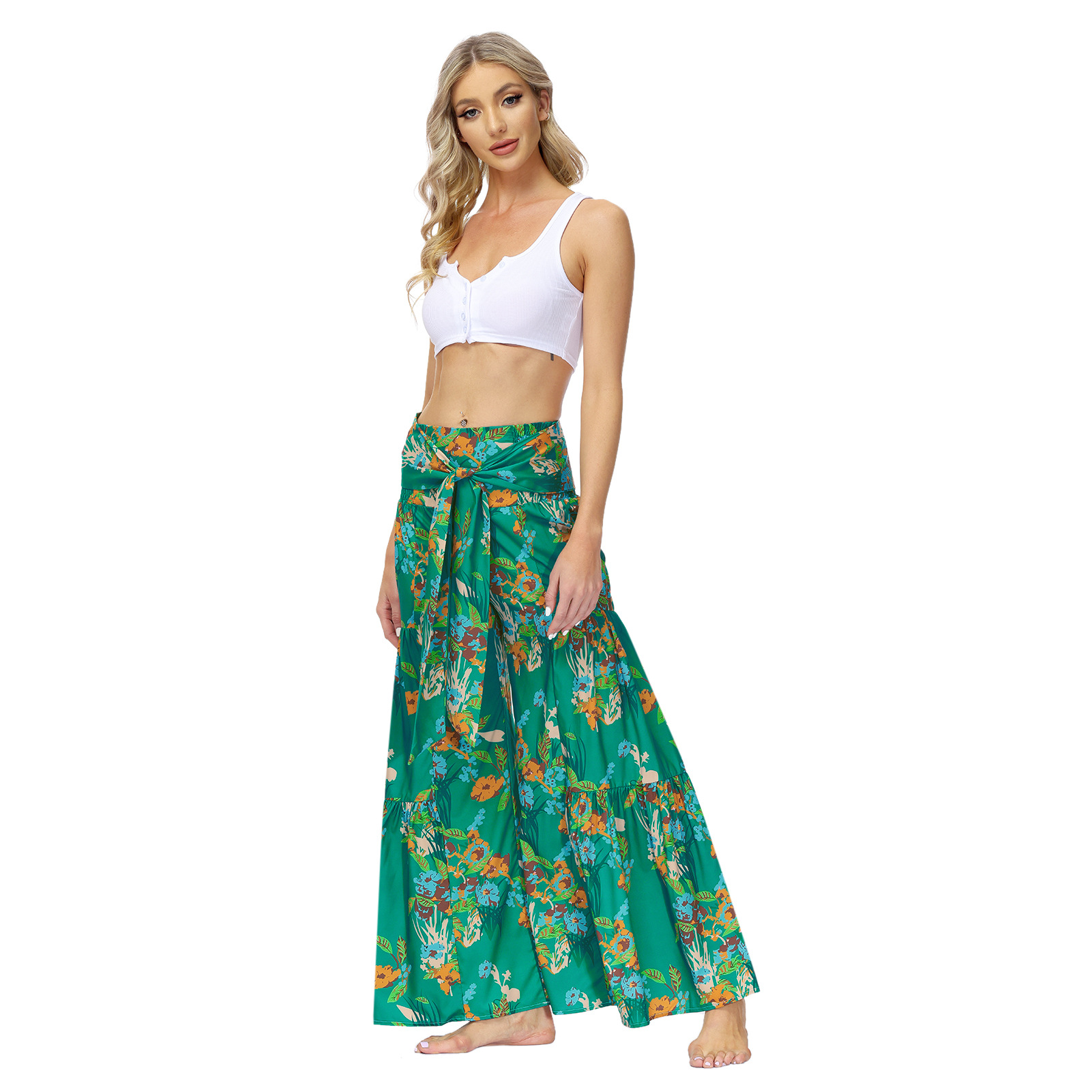 亚马逊春夏新品数码印花女装宽松休闲长裤沙滩阔腿裤绑带裤子现货