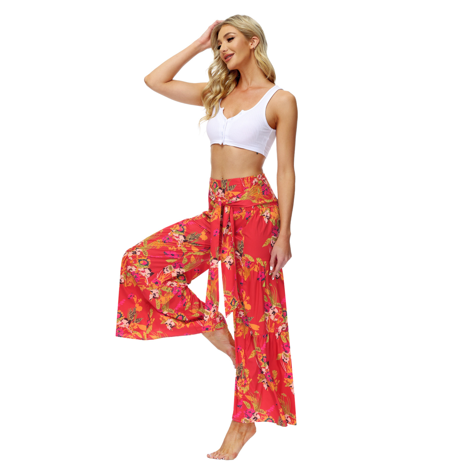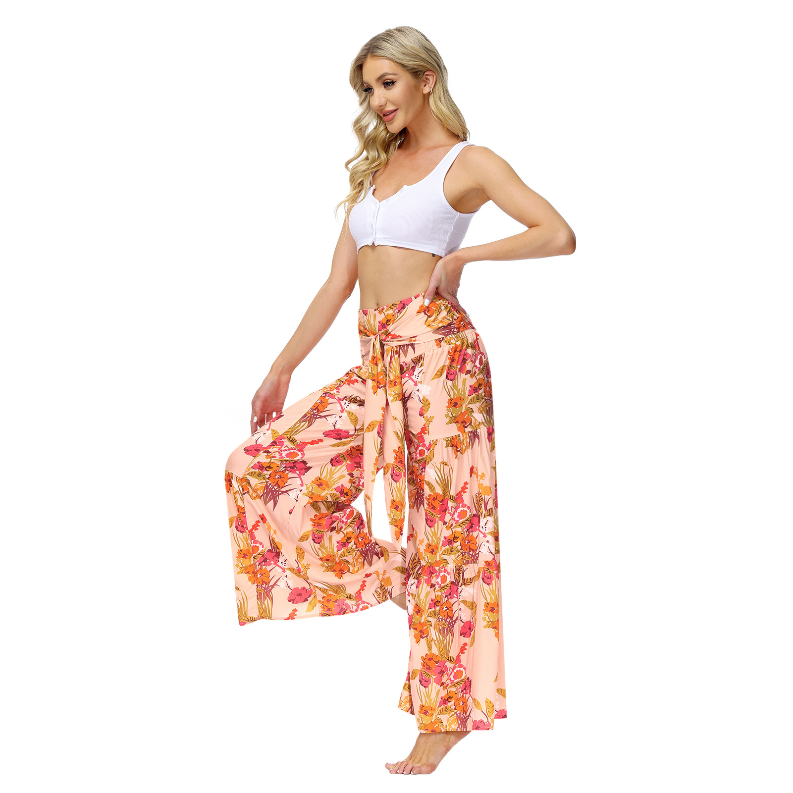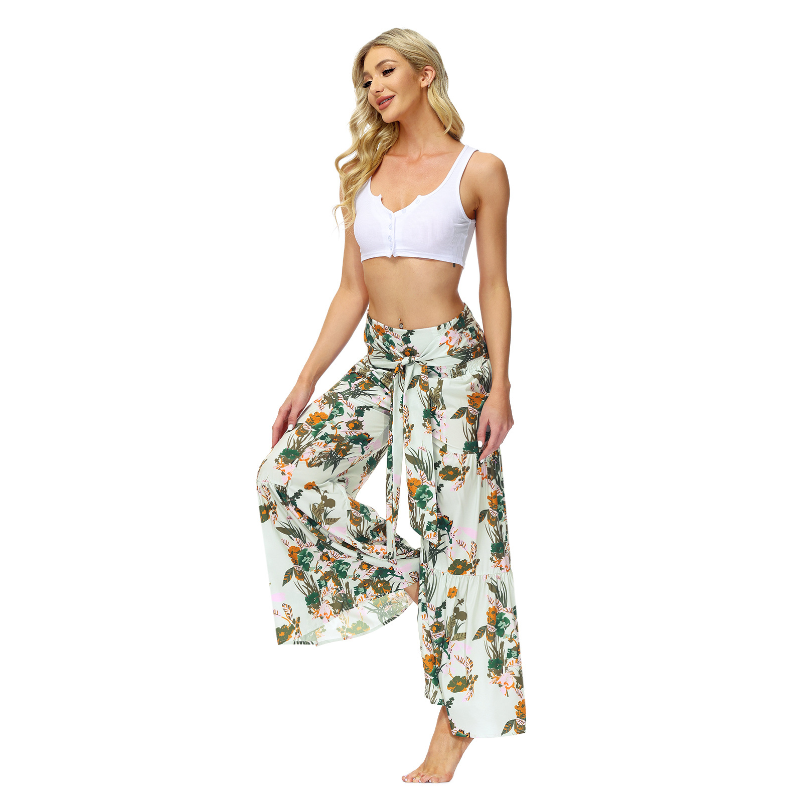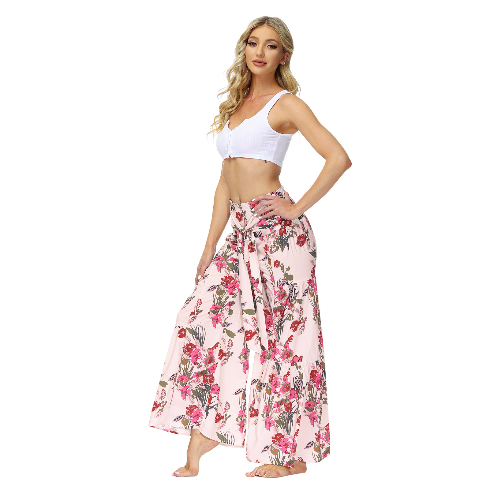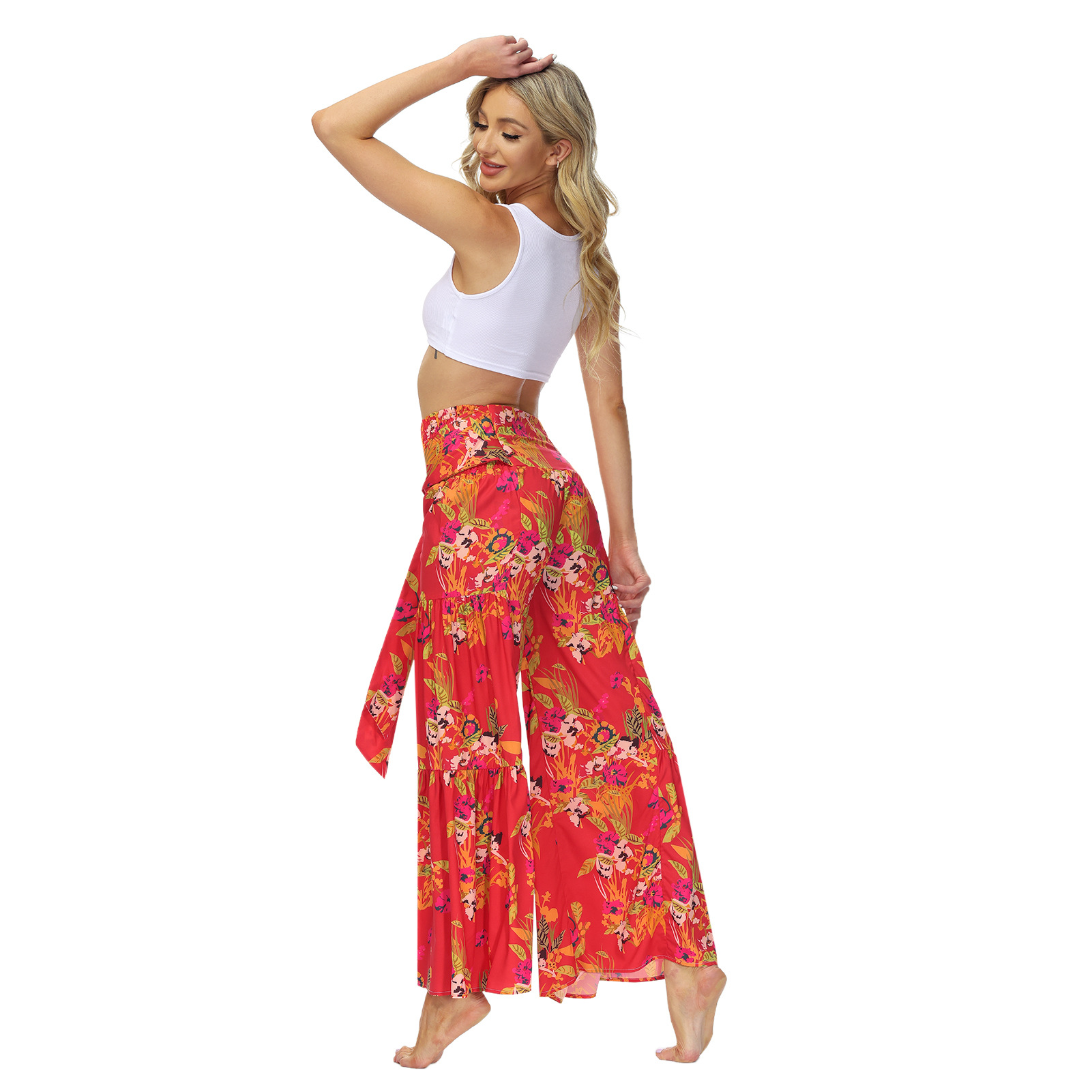 亚马逊春夏新品数码印花女装宽松休闲长裤沙滩阔腿裤绑带裤子现货