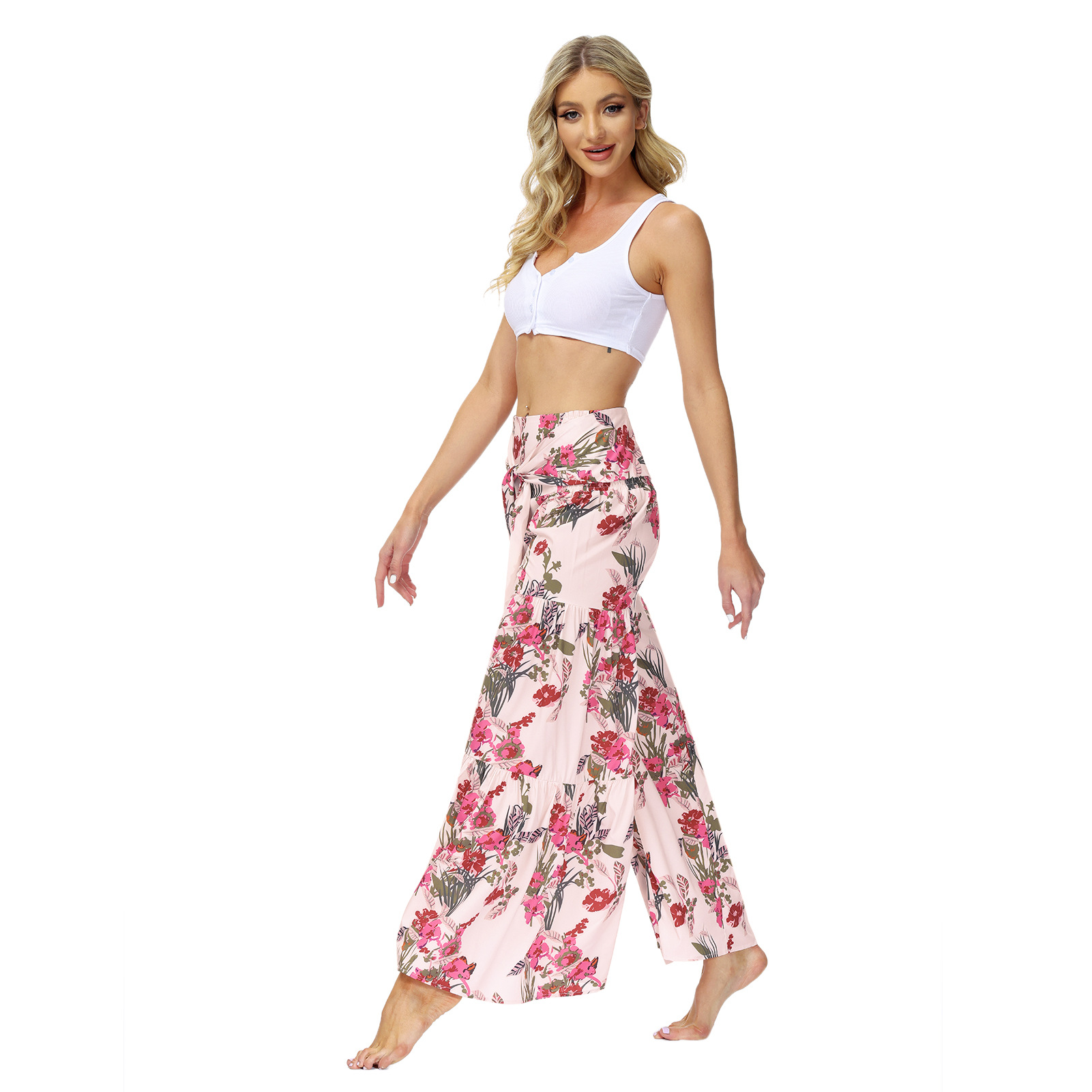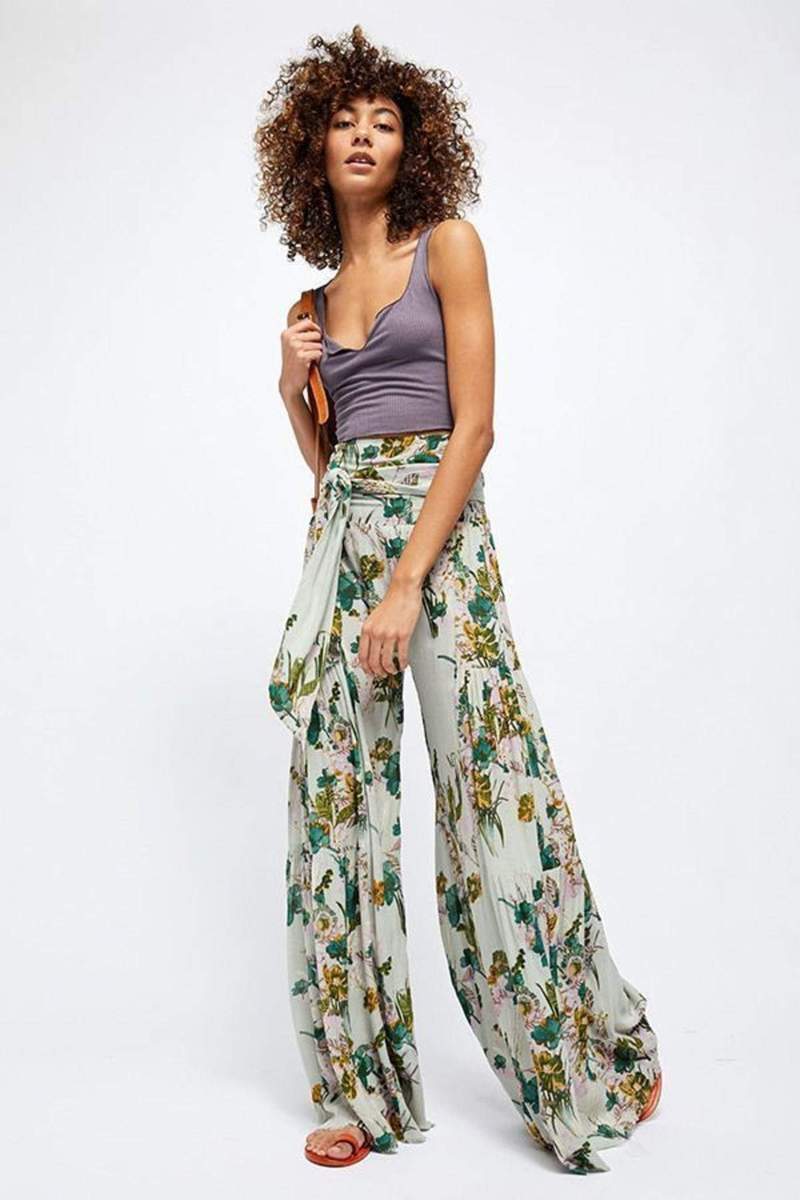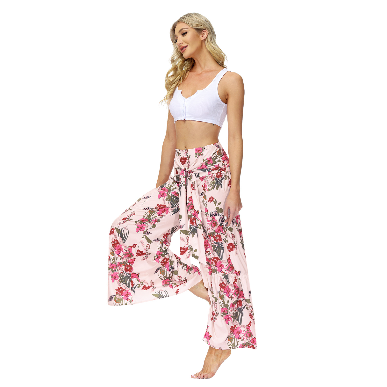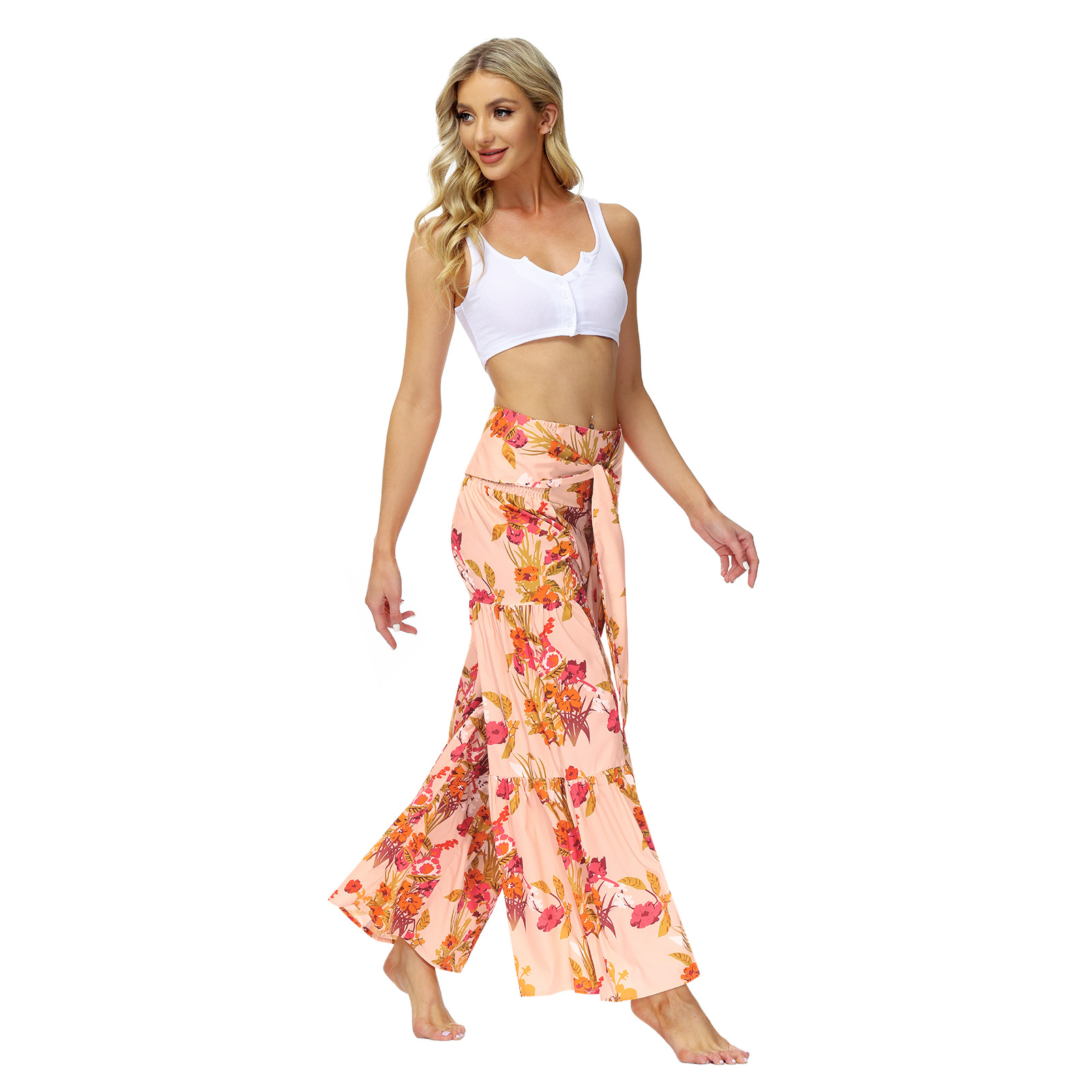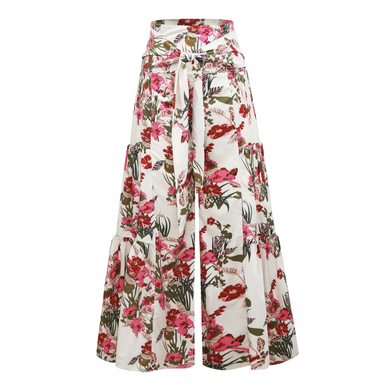 亚马逊春夏新品数码印花女装宽松休闲长裤沙滩阔腿裤绑带裤子现货