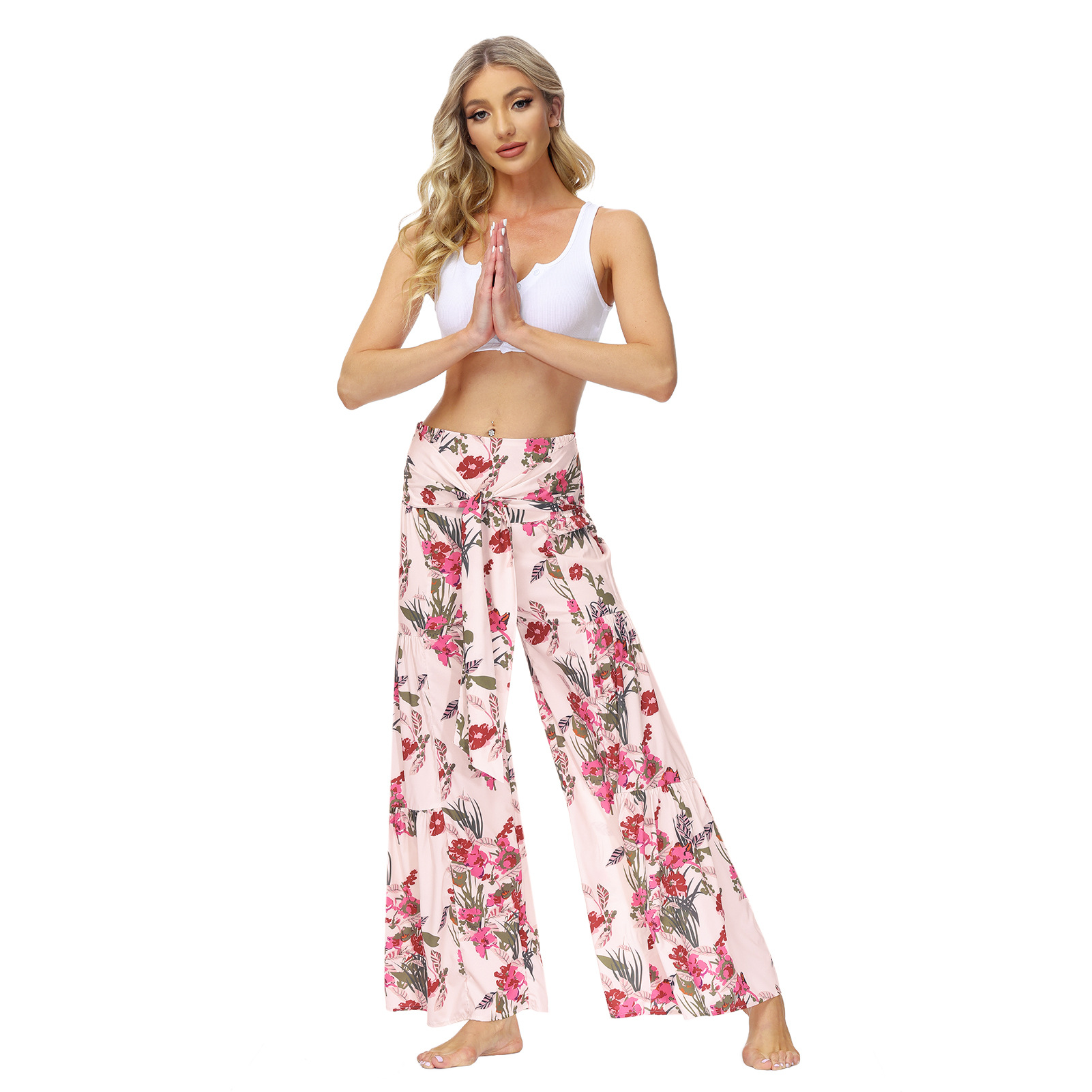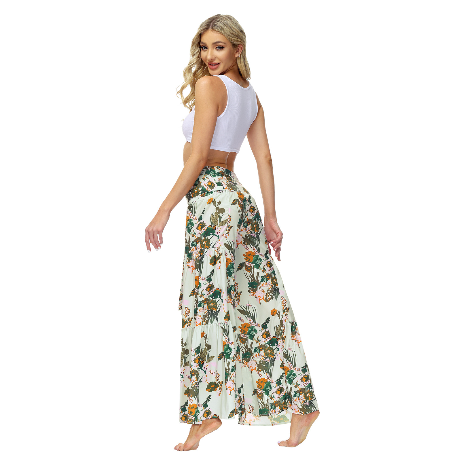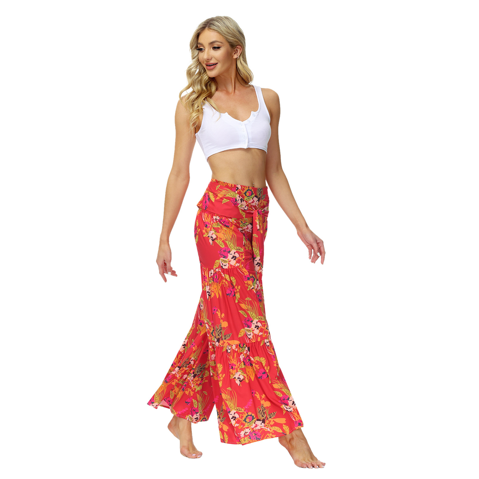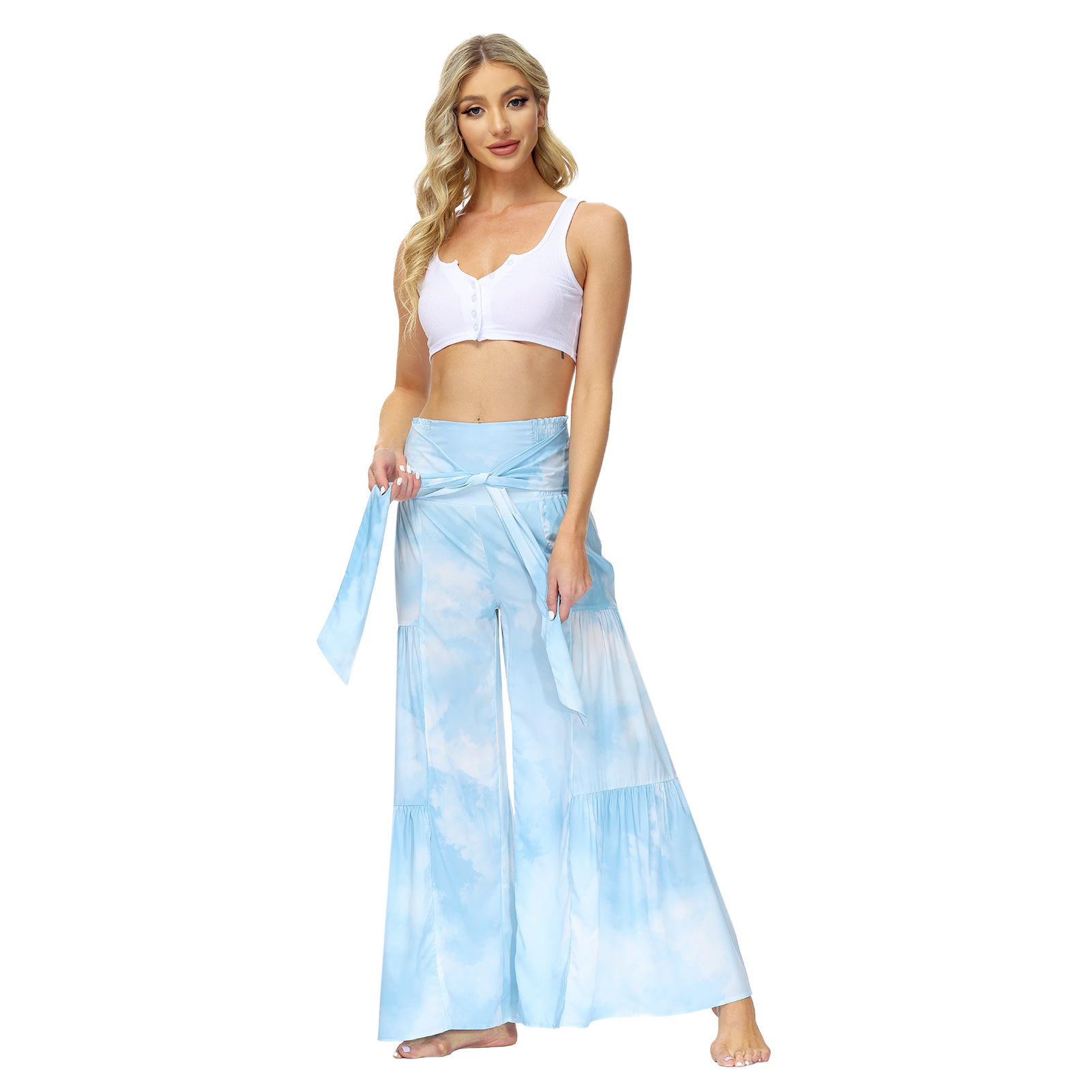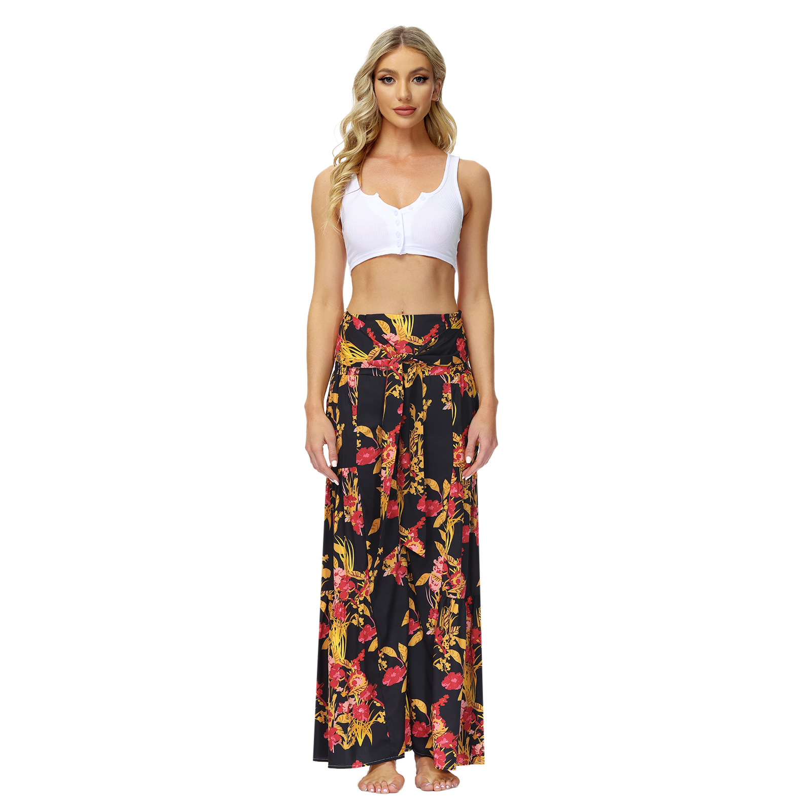 亚马逊春夏新品数码印花女装宽松休闲长裤沙滩阔腿裤绑带裤子现货