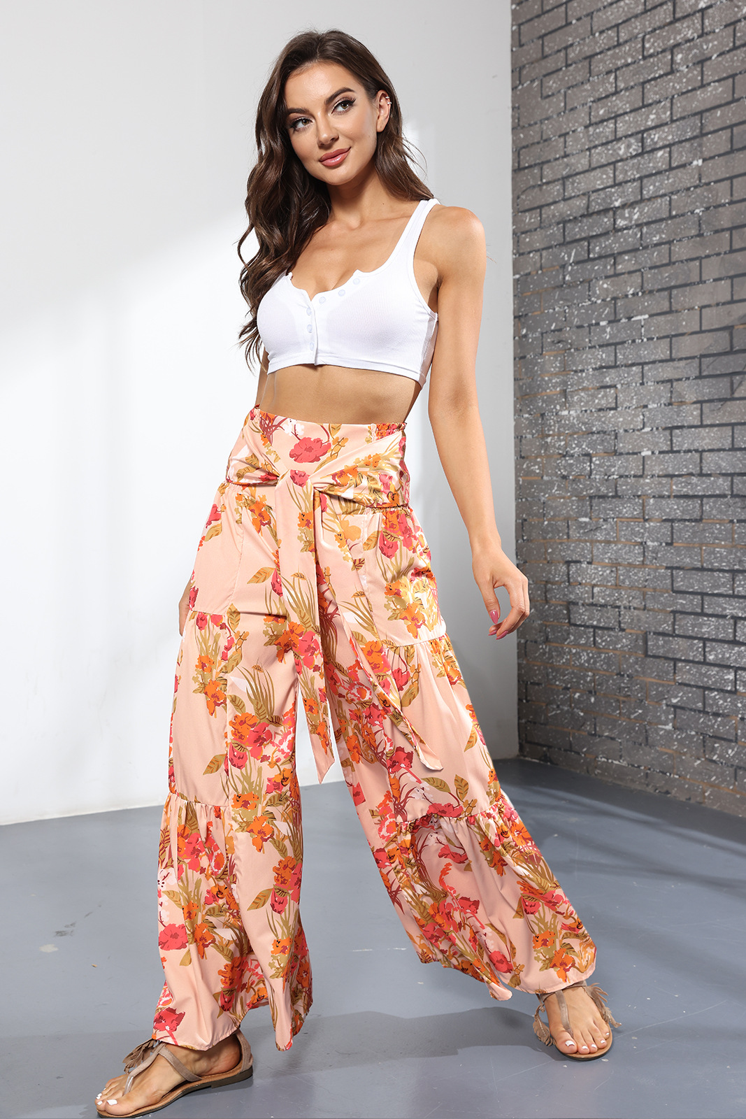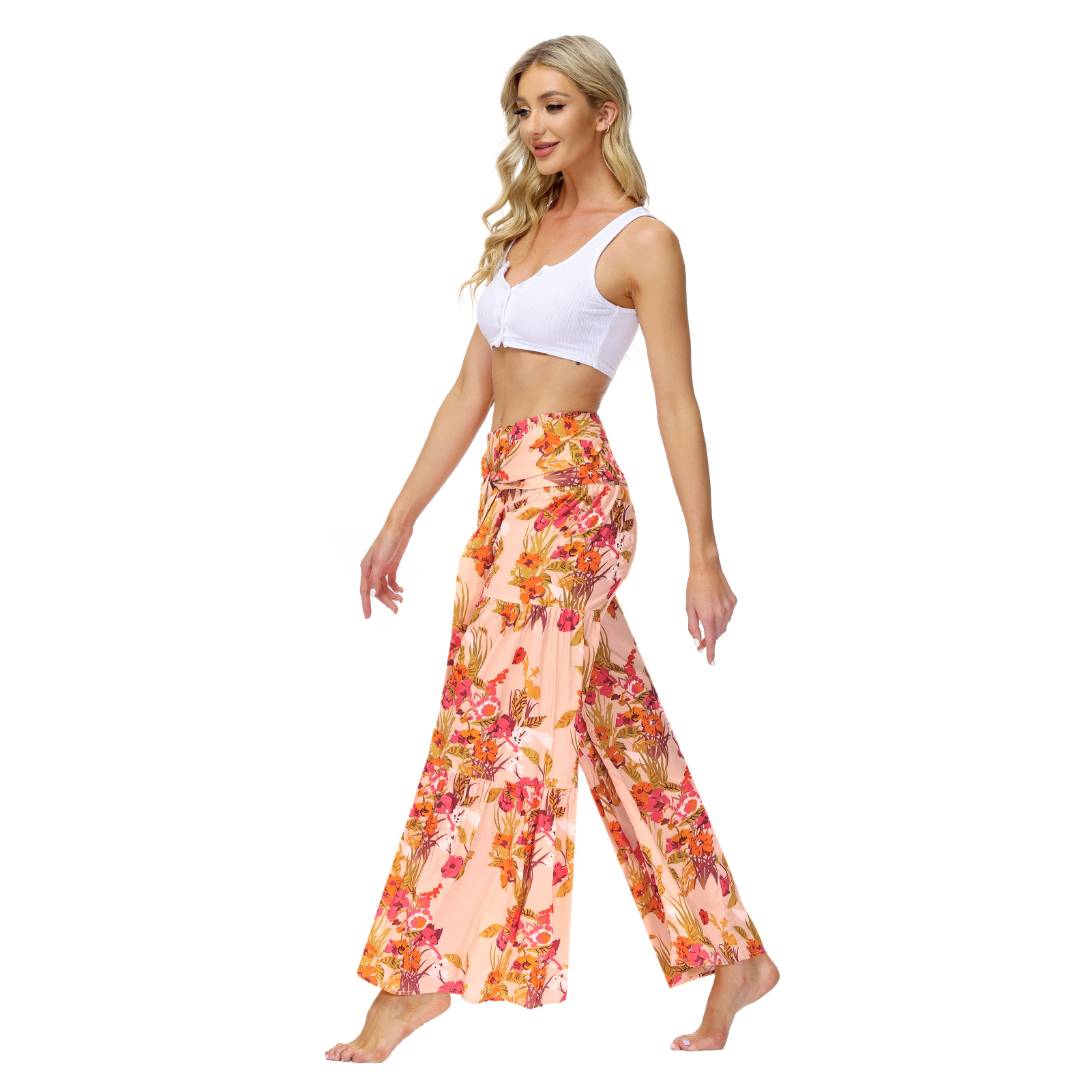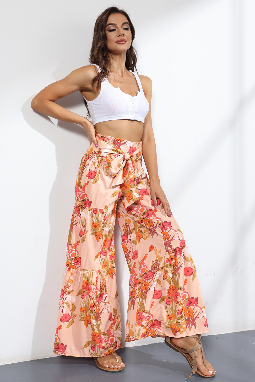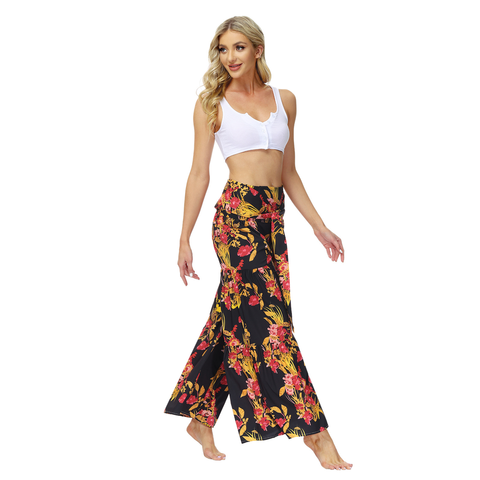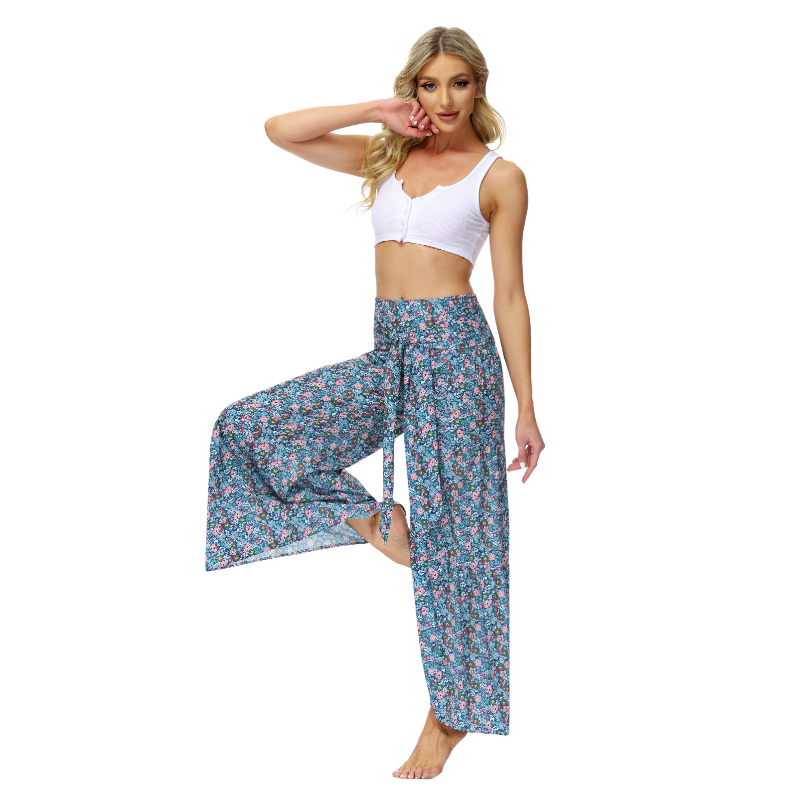 亚马逊春夏新品数码印花女装宽松休闲长裤沙滩阔腿裤绑带裤子现货