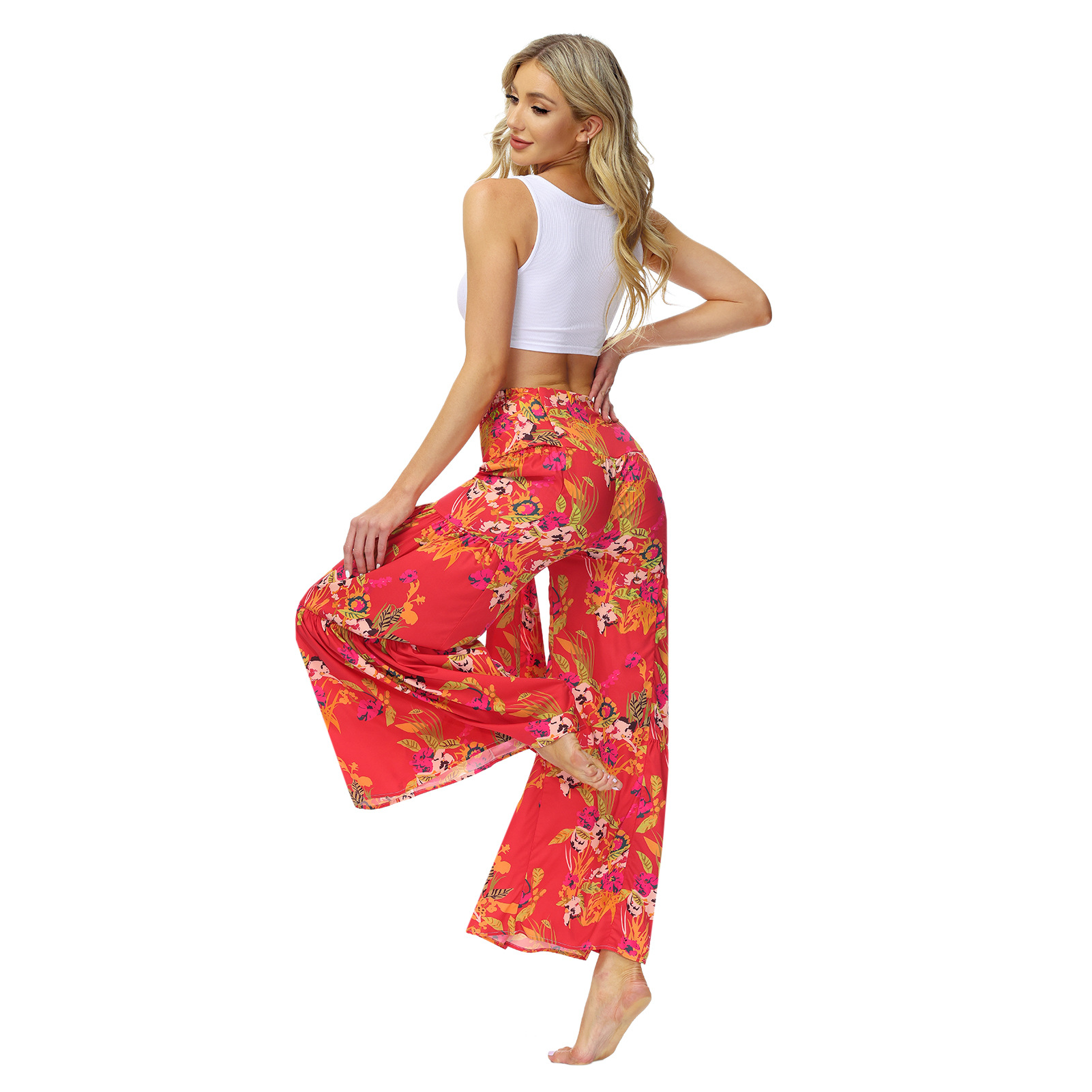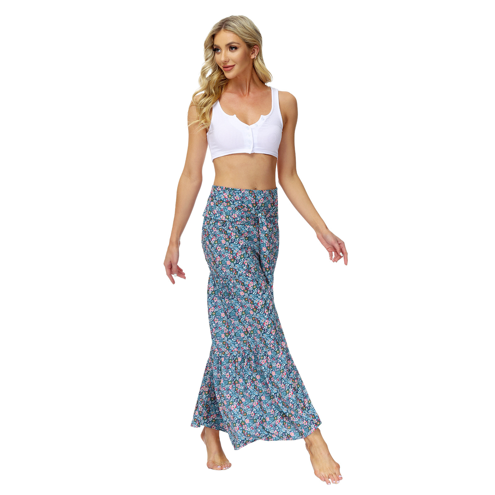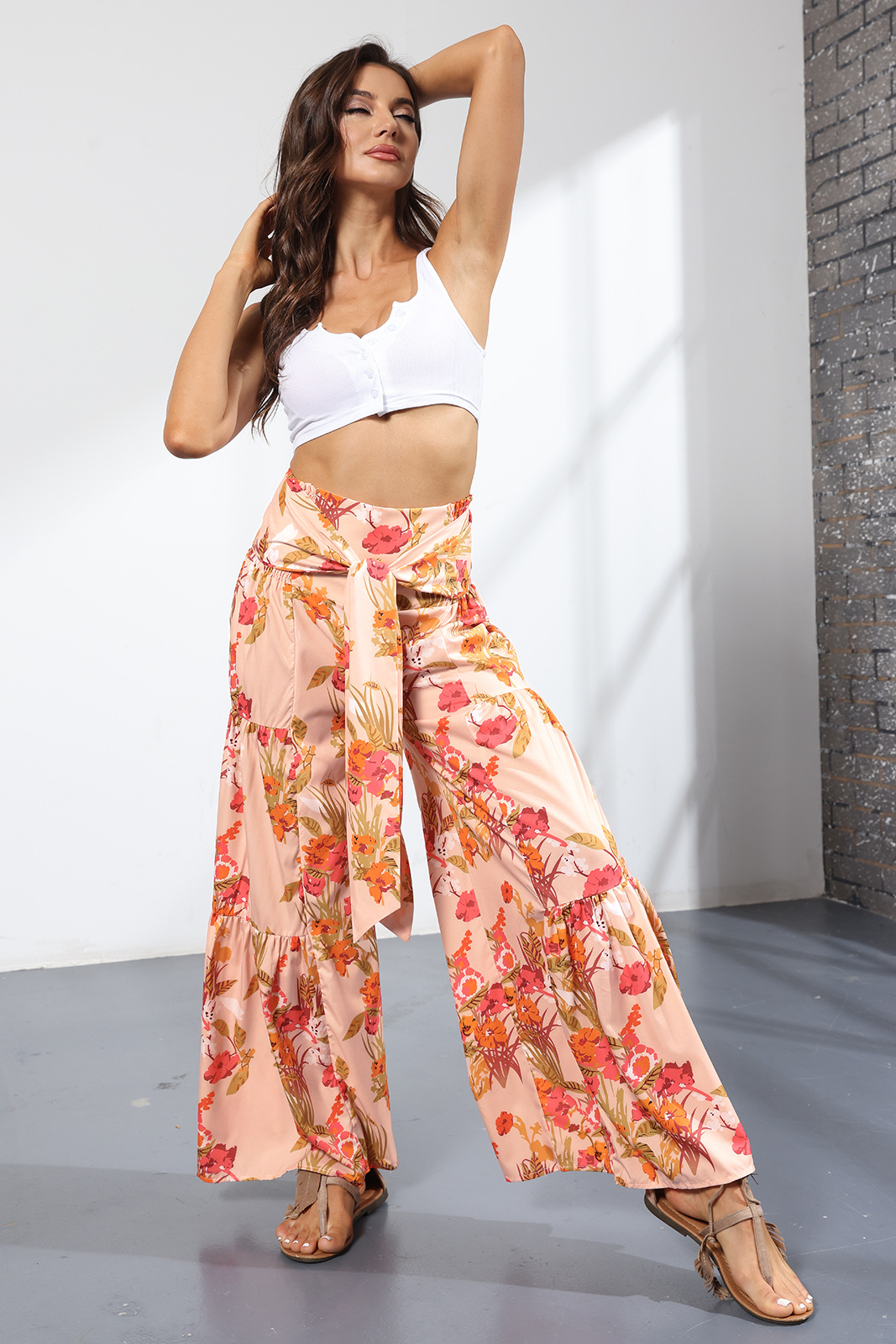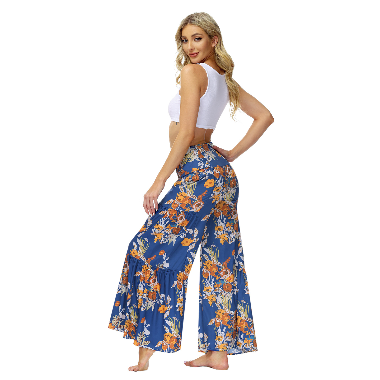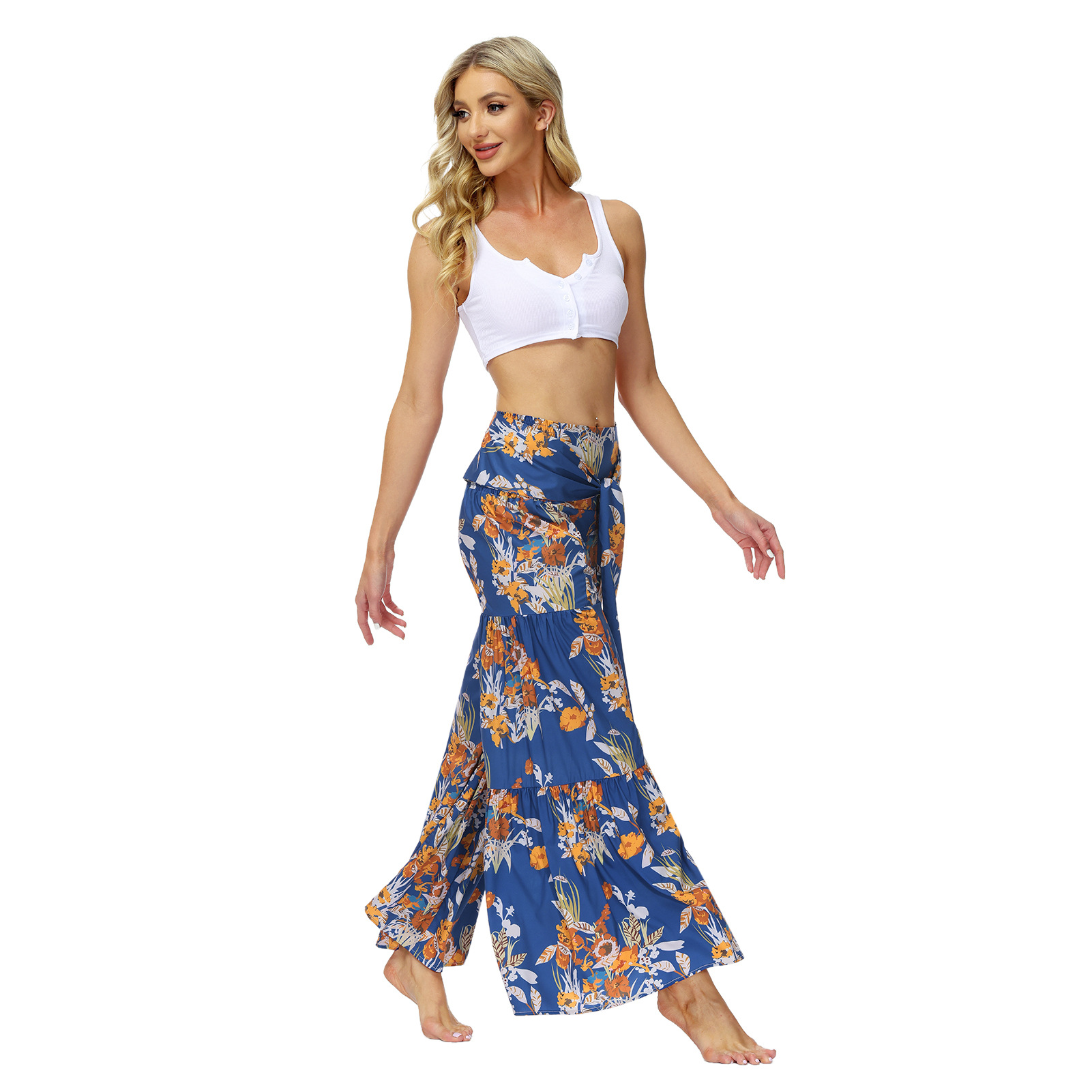 亚马逊春夏新品数码印花女装宽松休闲长裤沙滩阔腿裤绑带裤子现货