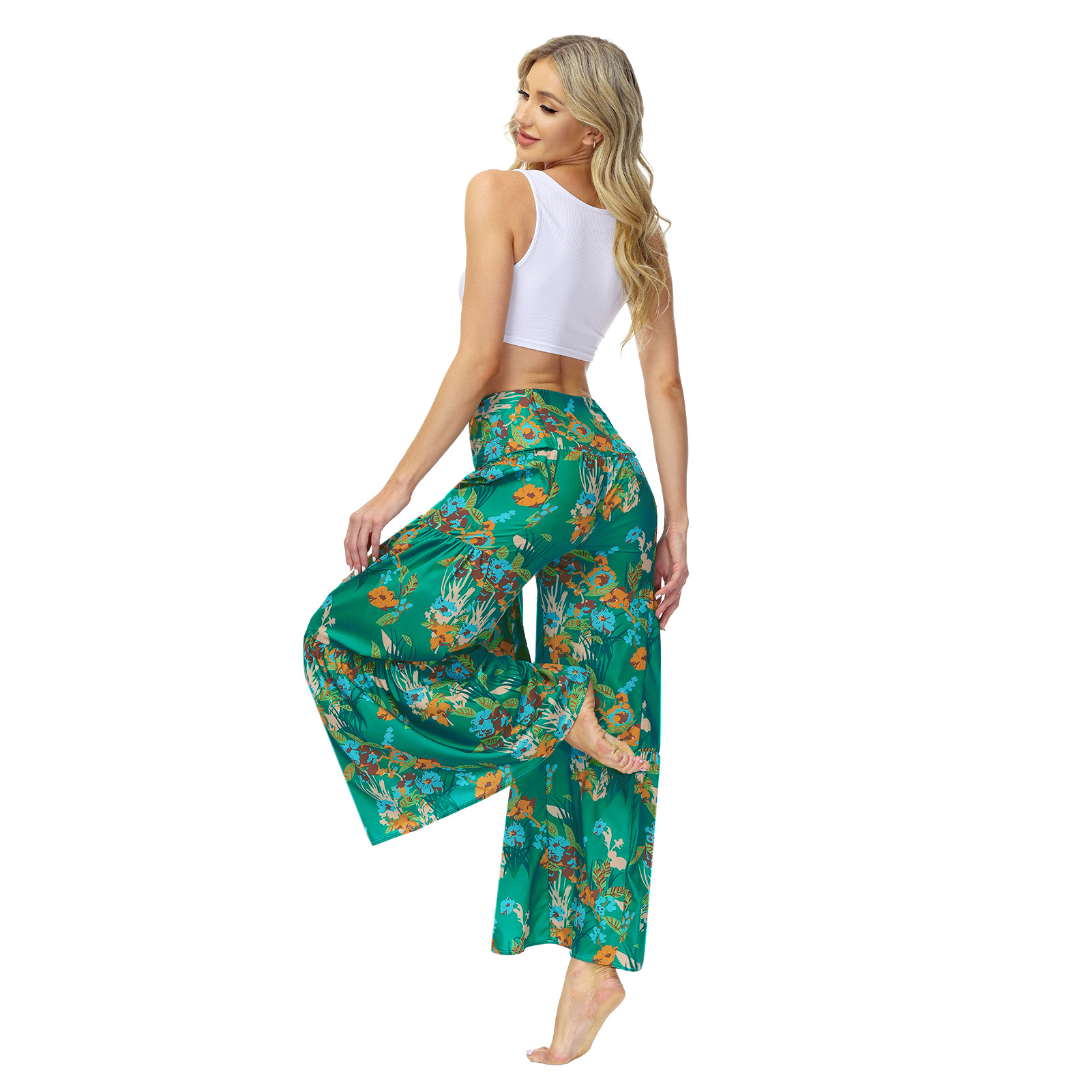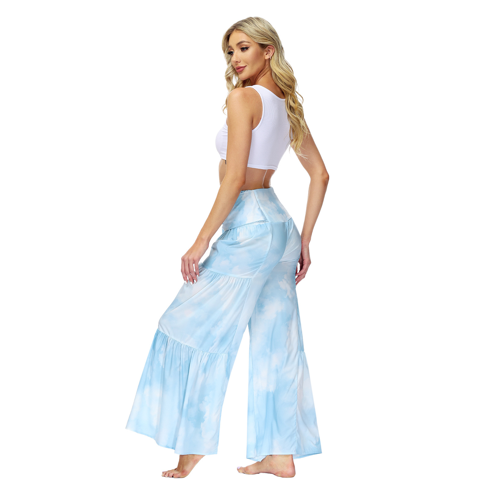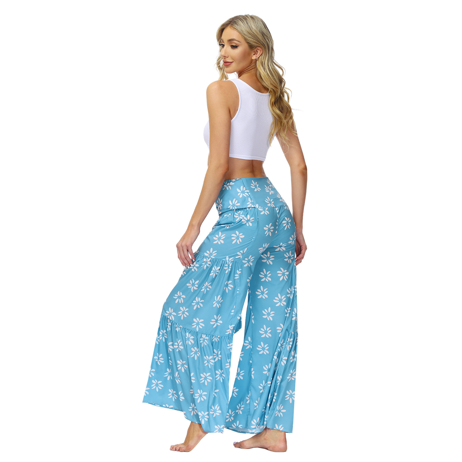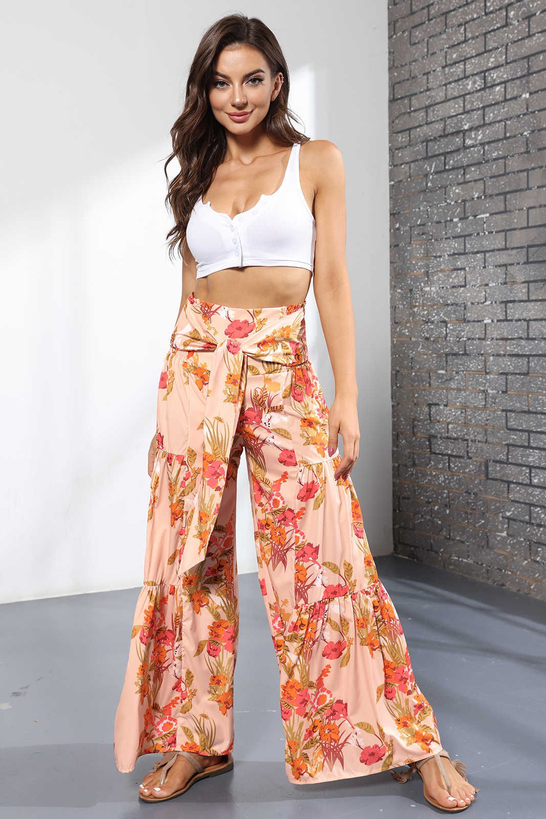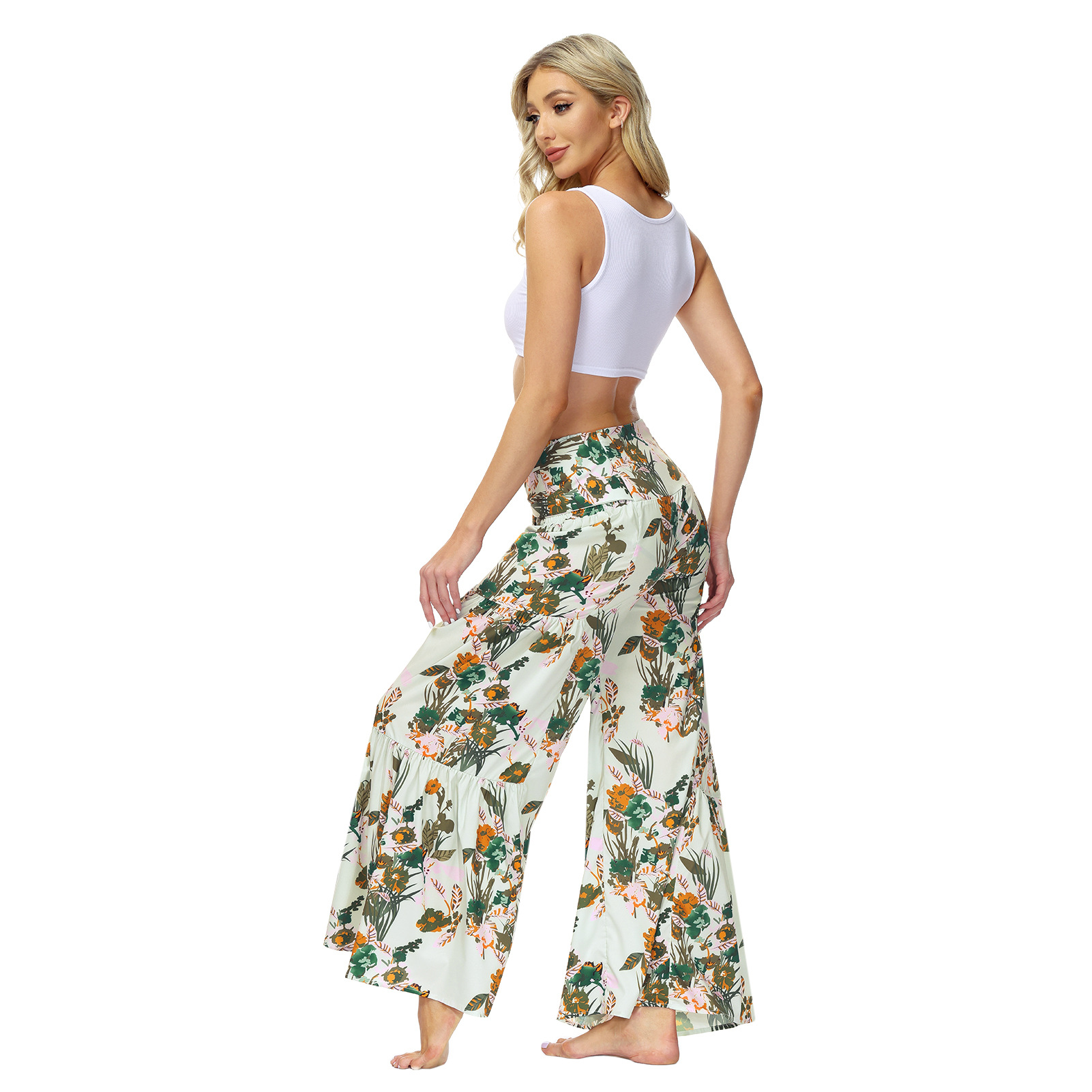 亚马逊春夏新品数码印花女装宽松休闲长裤沙滩阔腿裤绑带裤子现货