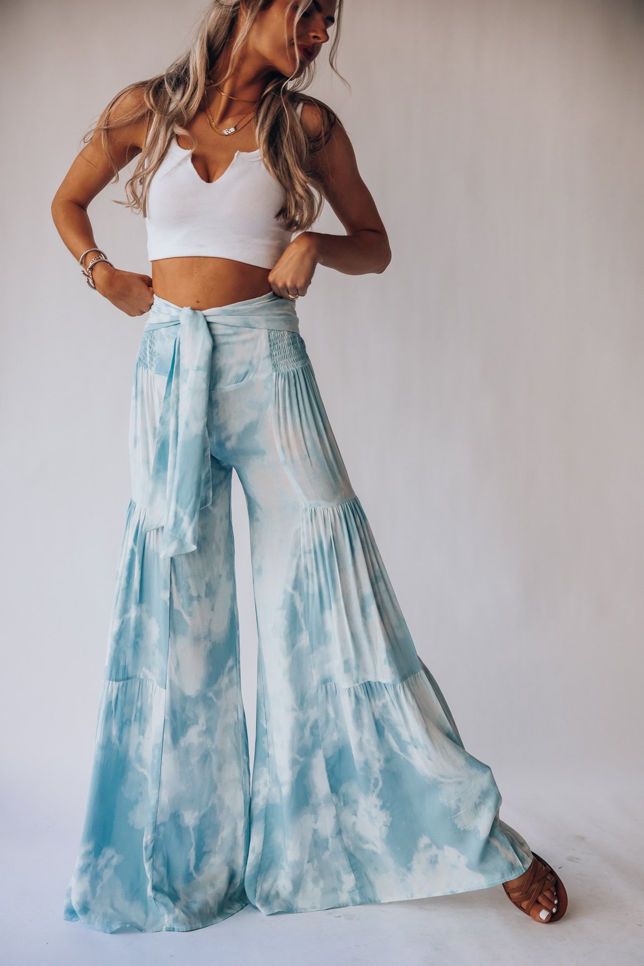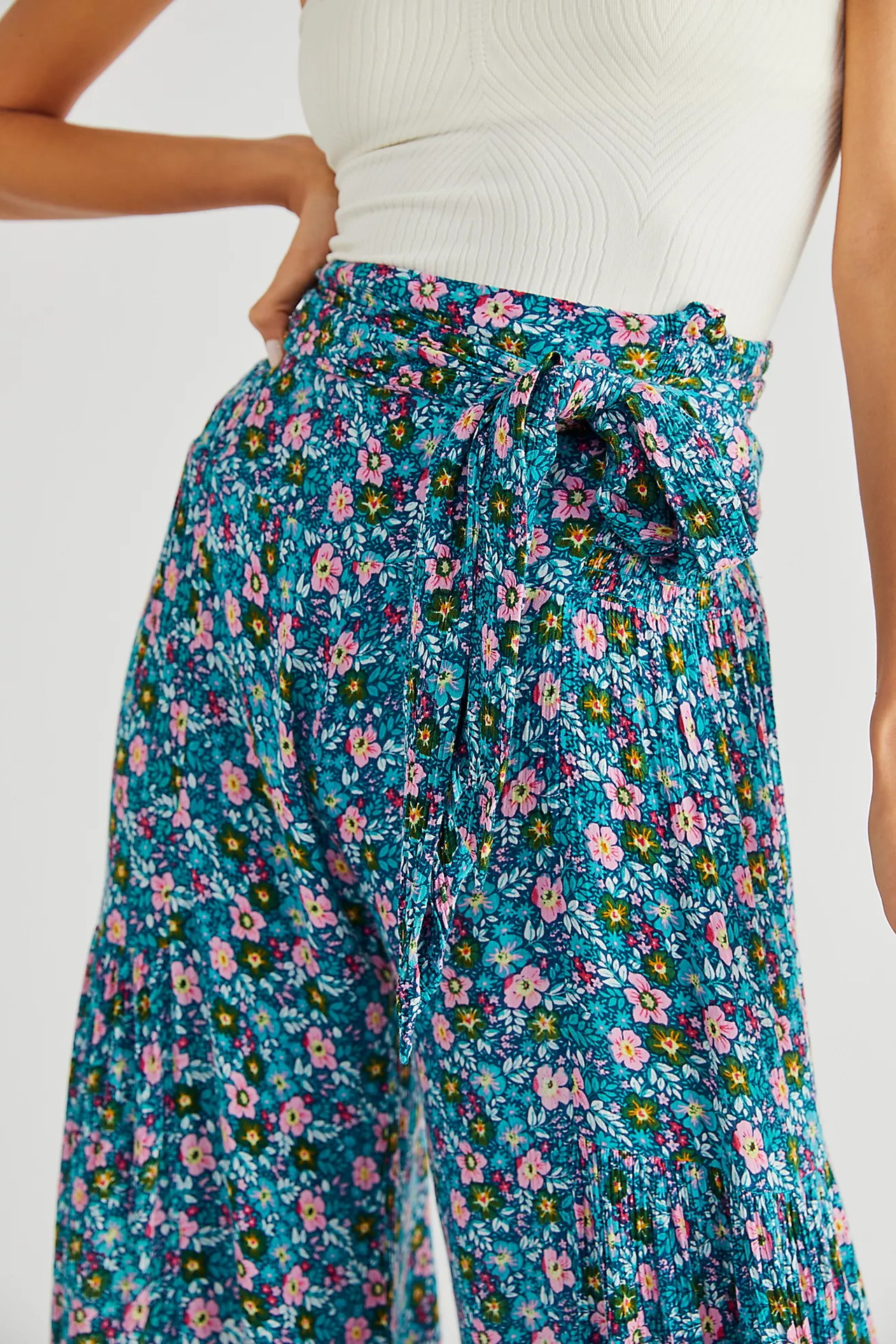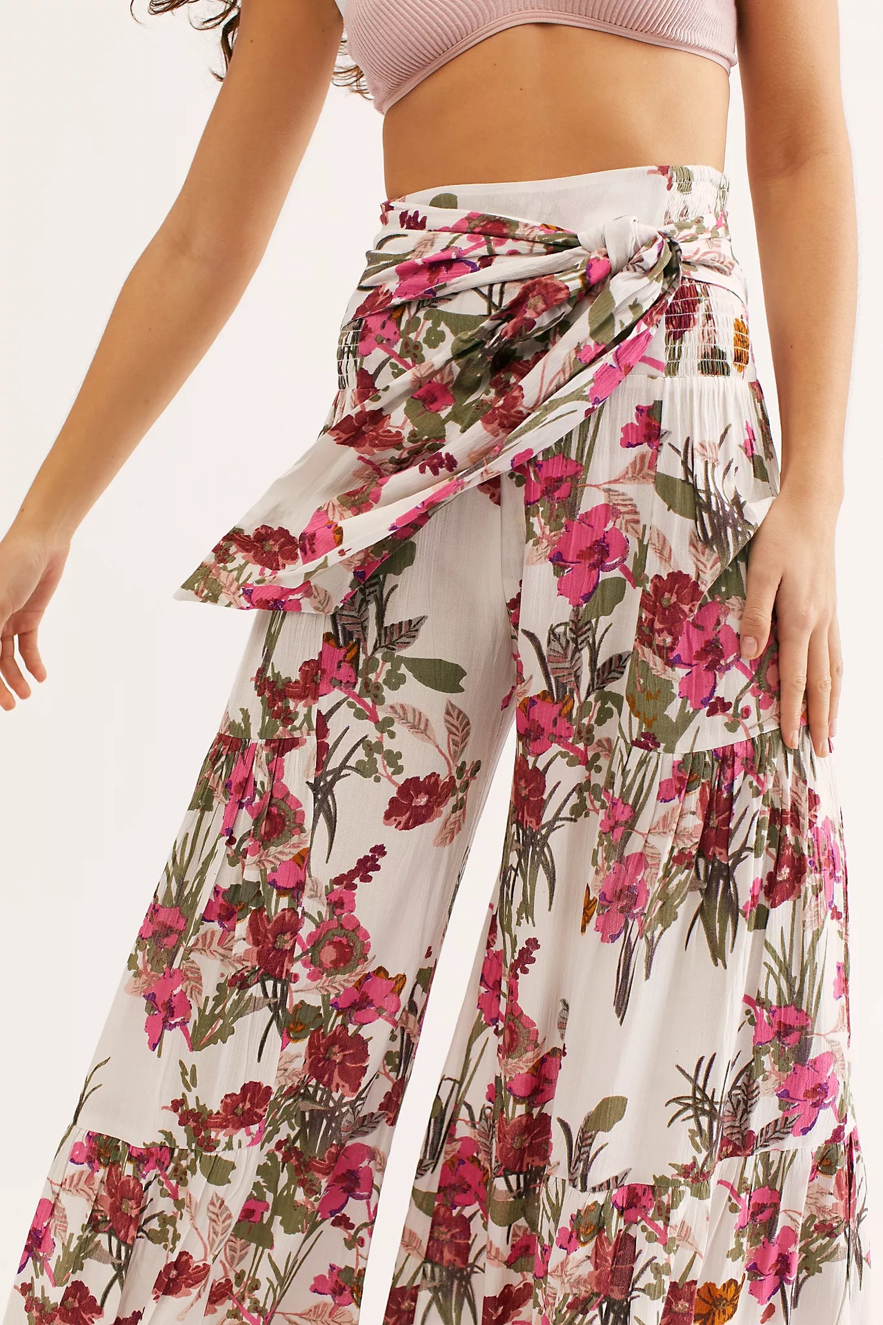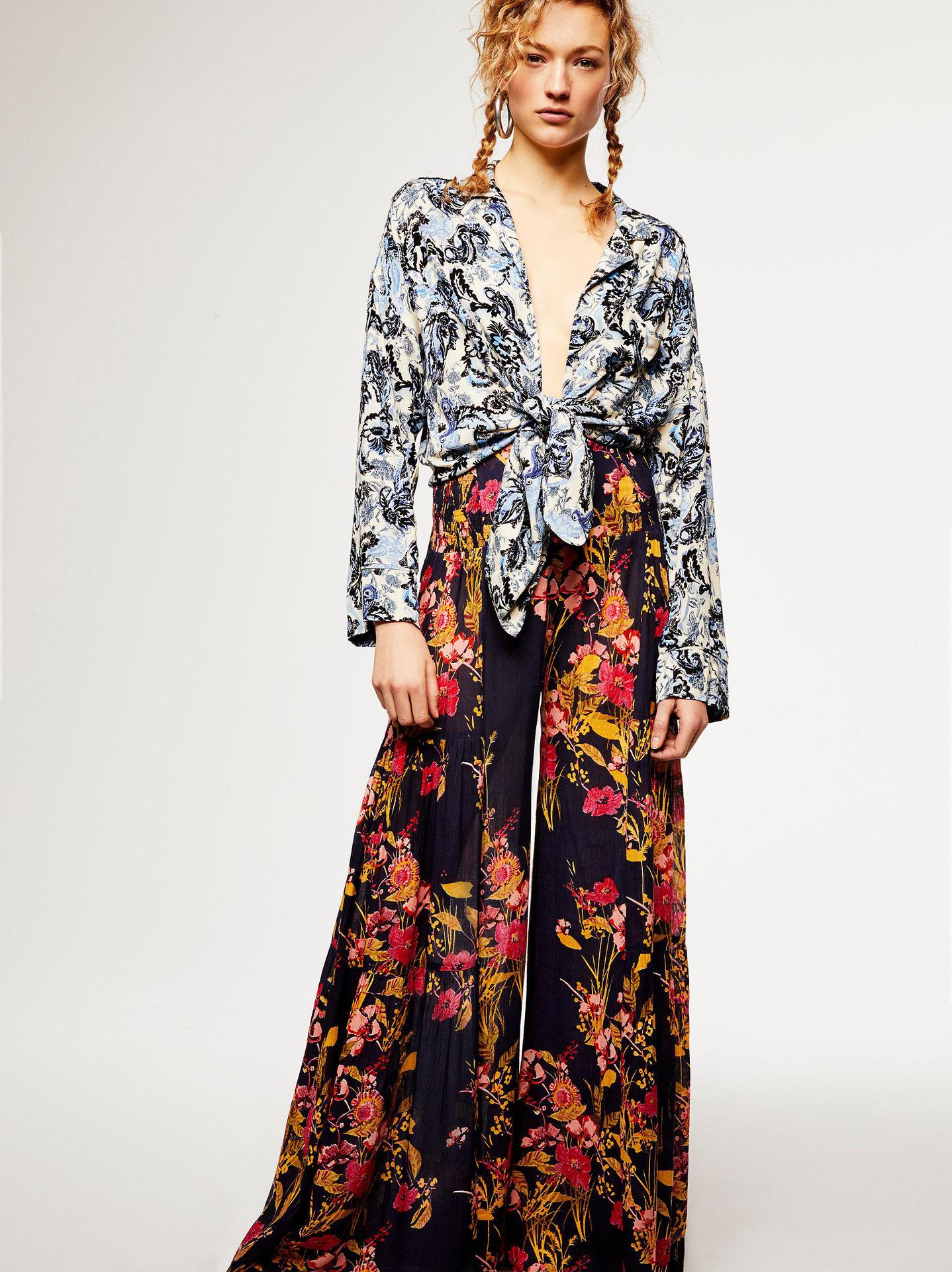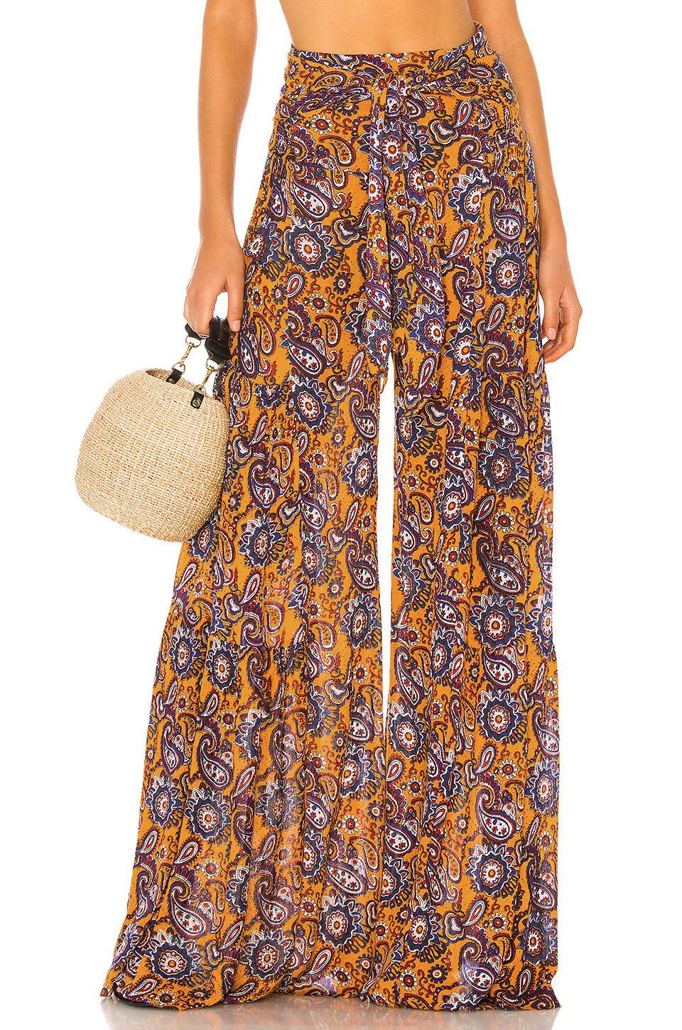 亚马逊春夏新品数码印花女装宽松休闲长裤沙滩阔腿裤绑带裤子现货