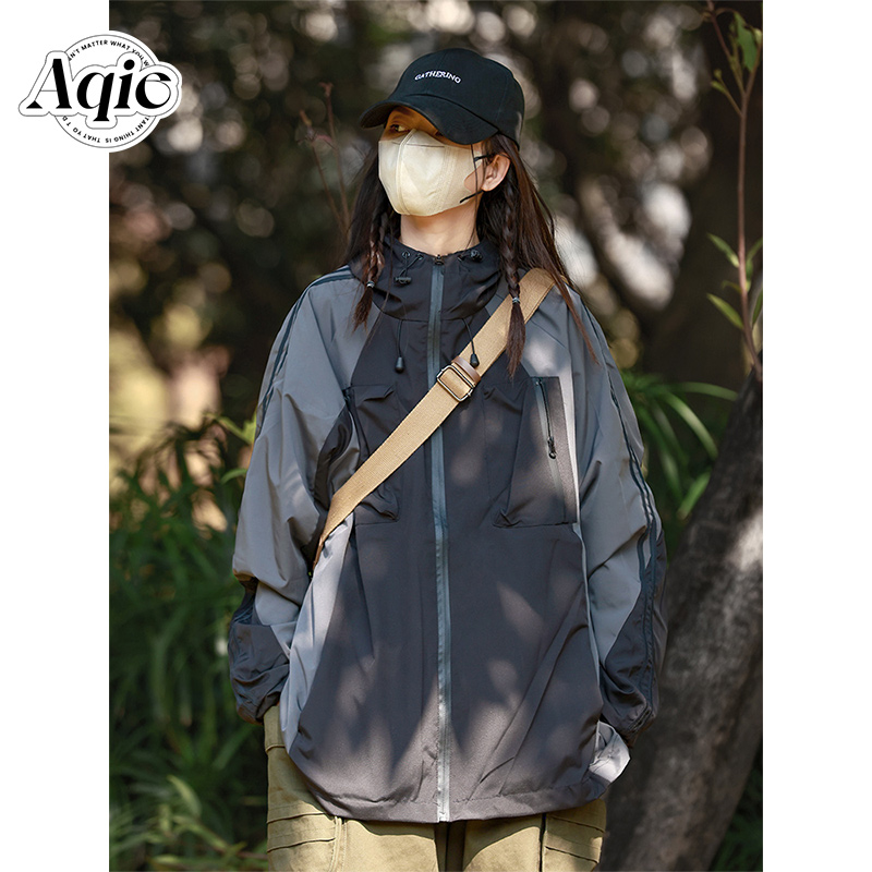 Aqie山系戶外衝鋒衣女春季撞色拼接連帽夾克外套日系寬鬆潮牌上衣