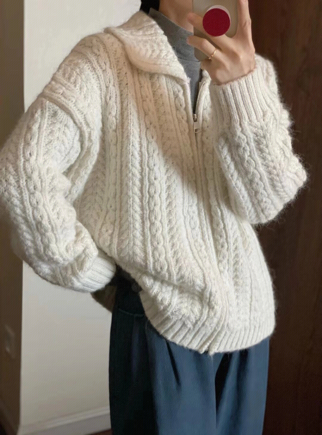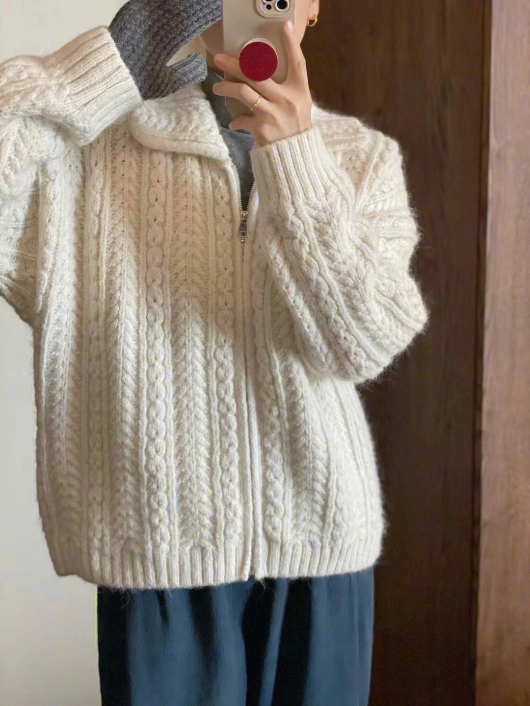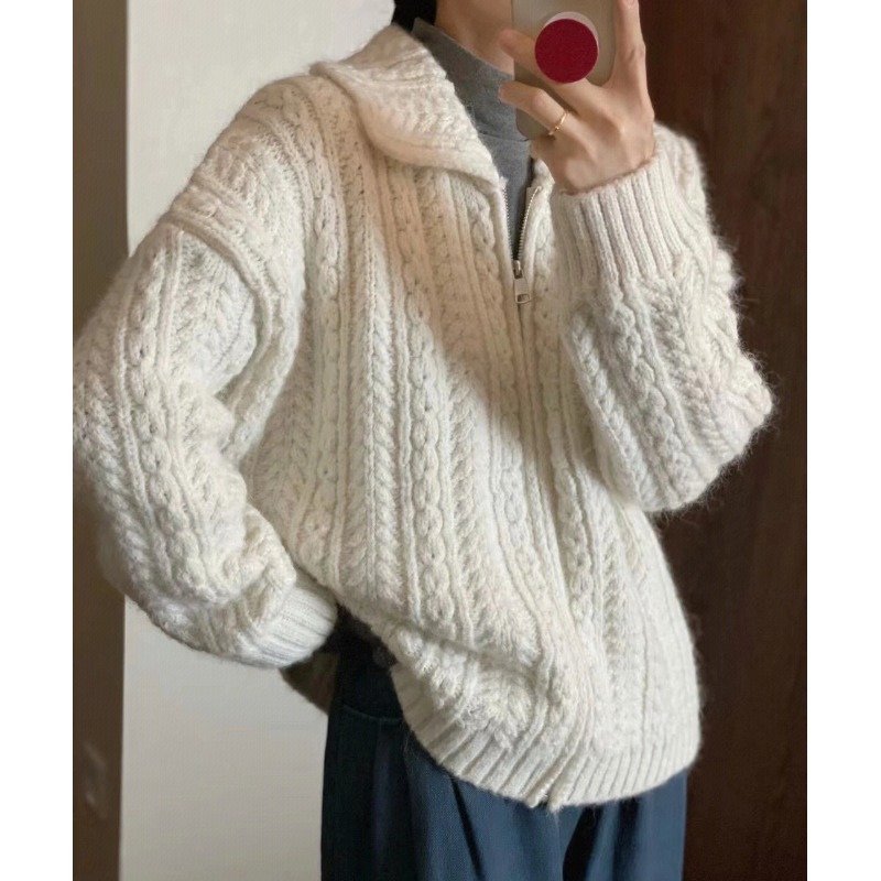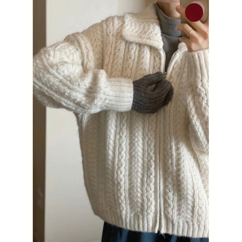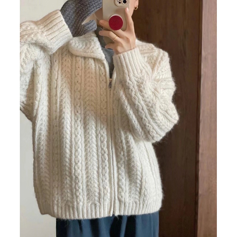 早秋白色polo翻領麻花毛衣外套女秋冬浣熊絨針織開衫春秋日系上衣